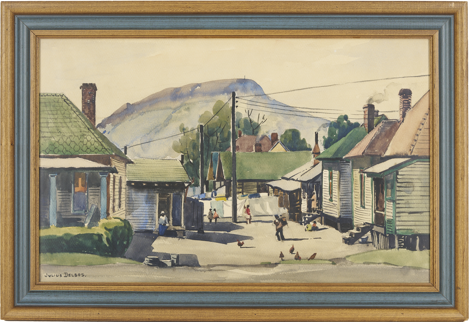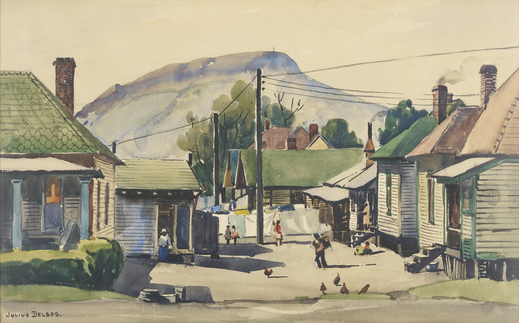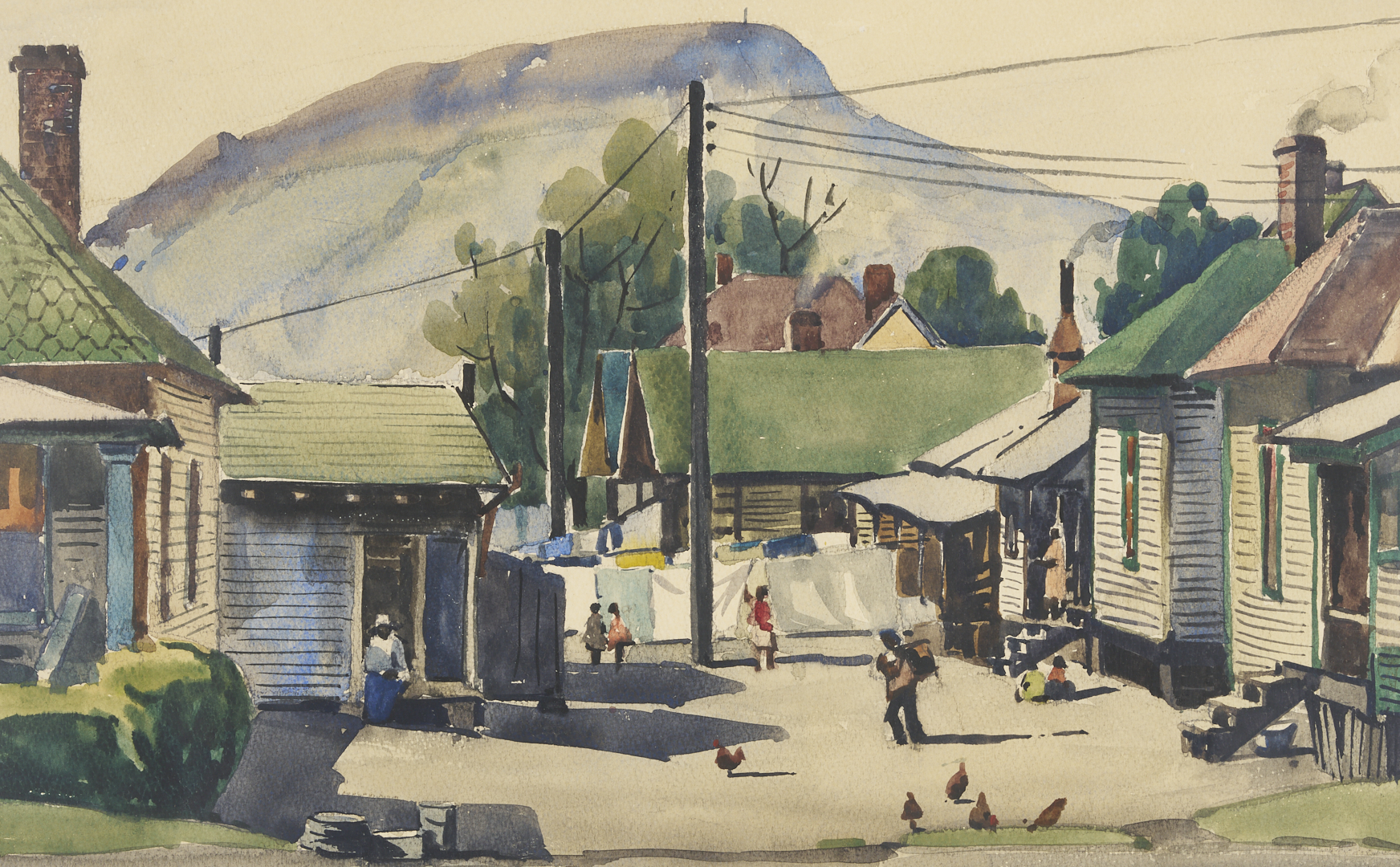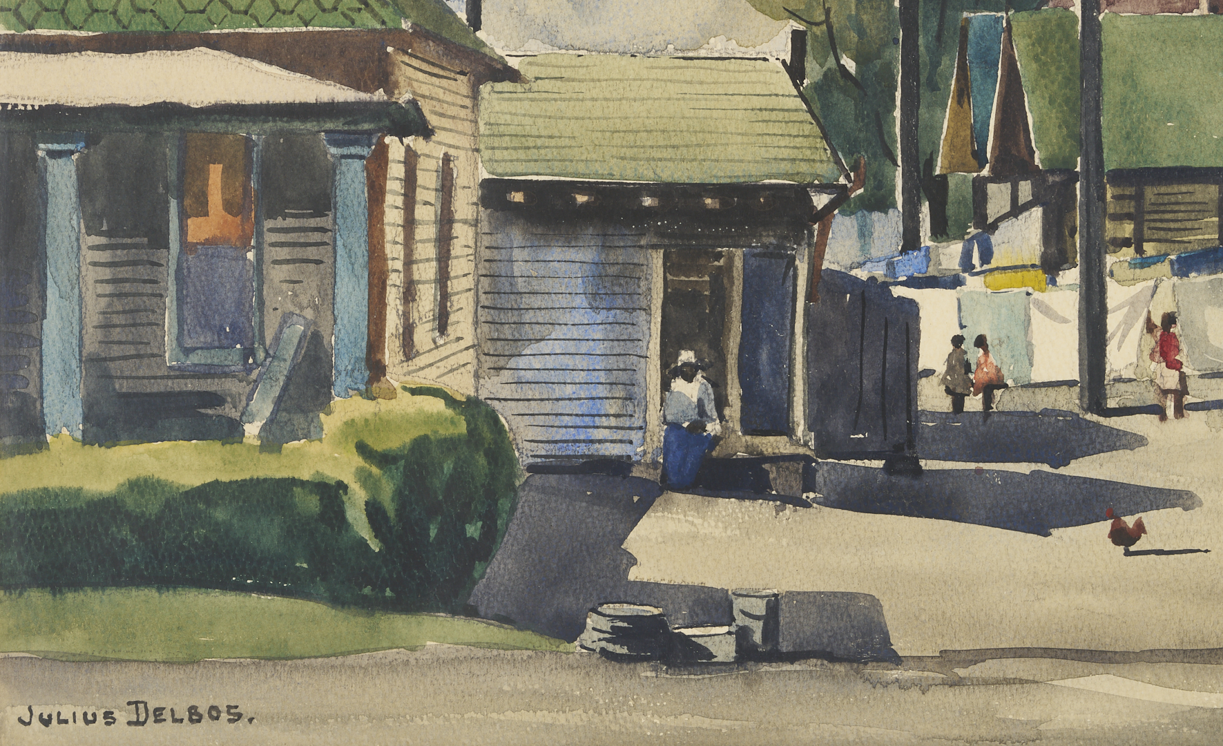 Julius Maximilian Delbos (English/American, 1879-1970) watercolor street scene painting on paper set in Blue Goose Hollow (now Westside Neighborhood), an African American neighborhood in Chattanooga, TN, with Lookout Mountain in the distance. Houses and figures cast long shadows into the streets of a neighborhood populated with African American men, women, and children who carry out daily tasks including laundry. A group of chickens idle at lower right. Signed lower left. Housed under plexiglass in a painted wood frame. Sight: 12 3/4 in H x 20 1/4 in W. Frame: 16 5/8 in H x 24 3/8 in W. Note: Chattanooga’s historic Blue Goose Hollow was a predominantly African American community whose residents included the Blues singer Bessie Smith, known as the “Empress of the Blues” and considered one of the most influential American musicians of the 20th century. In the 1950s, redevelopment plans led to the demolition of over 1,100 buildings and the displacement of over 1,400 residents of the neighborhood. Today images of this important American community are scarce. (Source: Blue Goose Hollow Artistic Trailhead Marker Project, Public Art Chattanooga). Biographical Note: Born in London, Delbose moved to New York City in 1920. He also spent time on Martha’s Vineyard and traveled frequently throughout his life, including regular visits to Georgia and Tennessee. He was a member of the American Watercolor Society; the New York Watercolor Club; the Society of Graphic Art; Old Dudley Art Society, London; American Artists Professional League; National Arts Club; Salmagundi Club; and the Century Club.
