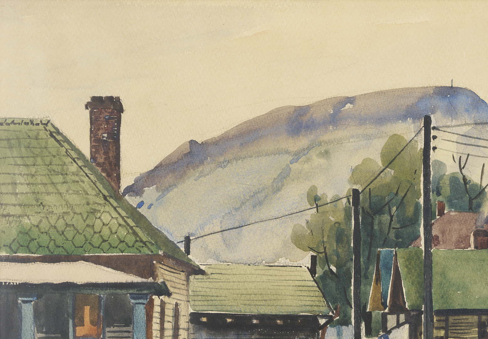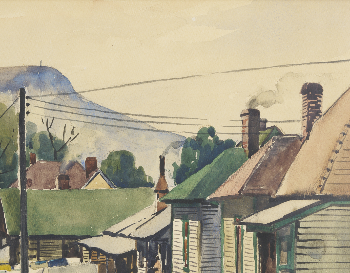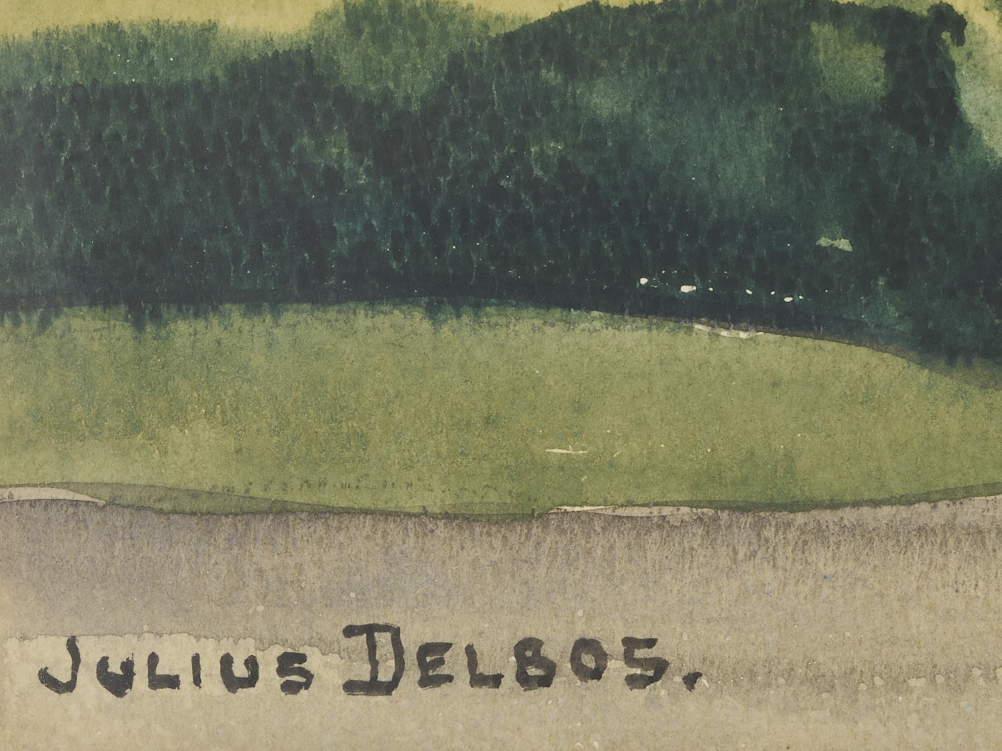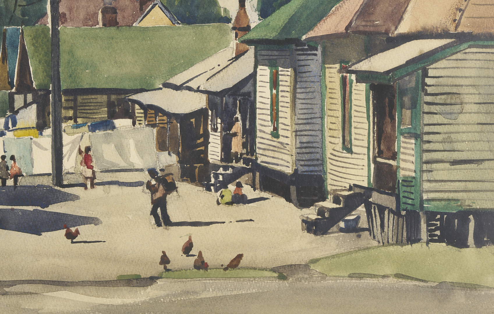 Julius Maximilian Delbos (English/American, 1879-1970) watercolor street scene painting on paper set in Blue Goose Hollow (now Westside Neighborhood), an African American neighborhood in Chattanooga, TN, with Lookout Mountain in the distance. Houses and figures cast long shadows into the streets of a neighborhood populated with African American men, women, and children who carry out daily tasks including laundry. A group of chickens idle at lower right. Signed lower left. Housed under plexiglass in a painted wood frame. Sight: 12 3/4 in H x 20 1/4 in W. Frame: 16 5/8 in H x 24 3/8 in W. Note: Chattanooga’s historic Blue Goose Hollow was a predominantly African American community whose residents included the Blues singer Bessie Smith, known as the “Empress of the Blues” and considered one of the most influential American musicians of the 20th century. In the 1950s, redevelopment plans led to the demolition of over 1,100 buildings and the displacement of over 1,400 residents of the neighborhood. Today images of this important American community are scarce. (Source: Blue Goose Hollow Artistic Trailhead Marker Project, Public Art Chattanooga). Biographical Note: Born in London, Delbose moved to New York City in 1920. He also spent time on Martha’s Vineyard and traveled frequently throughout his life, including regular visits to Georgia and Tennessee. He was a member of the American Watercolor Society; the New York Watercolor Club; the Society of Graphic Art; Old Dudley Art Society, London; American Artists Professional League; National Arts Club; Salmagundi Club; and the Century Club.
