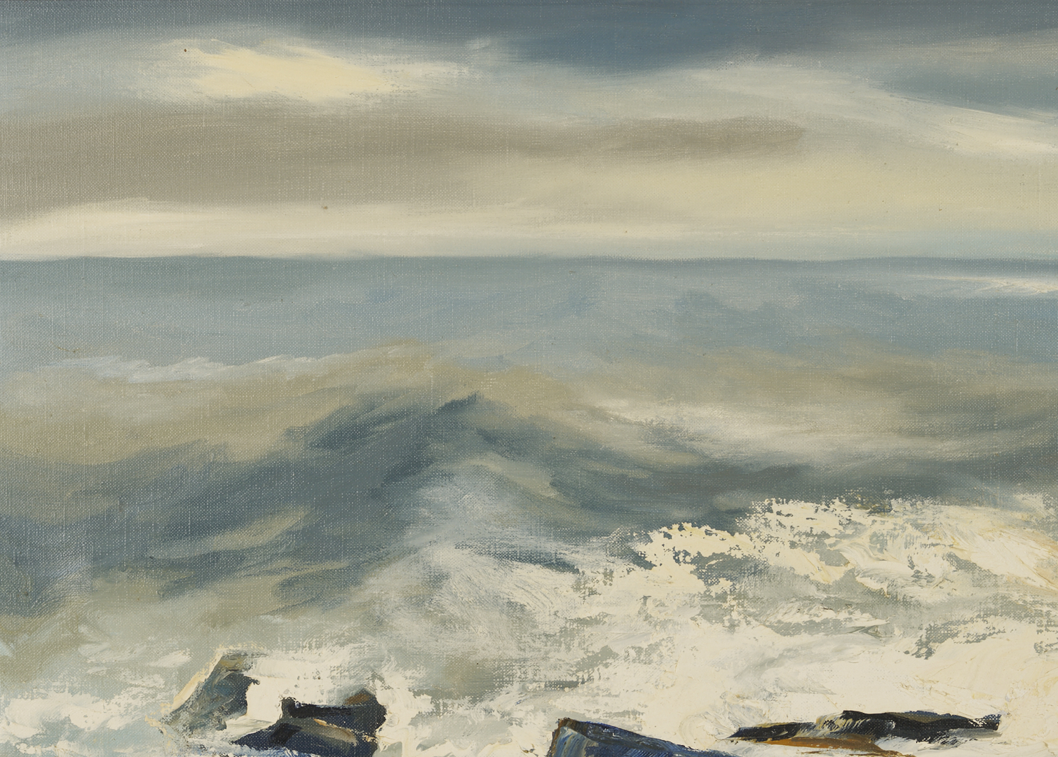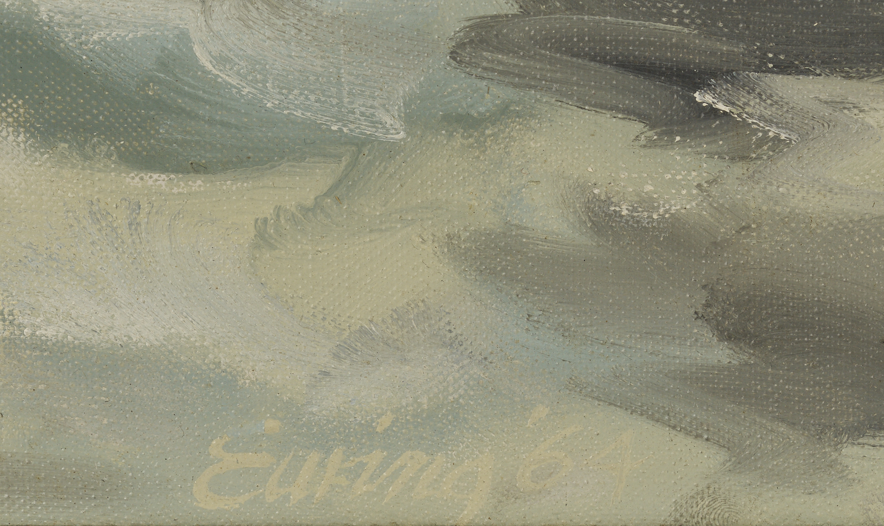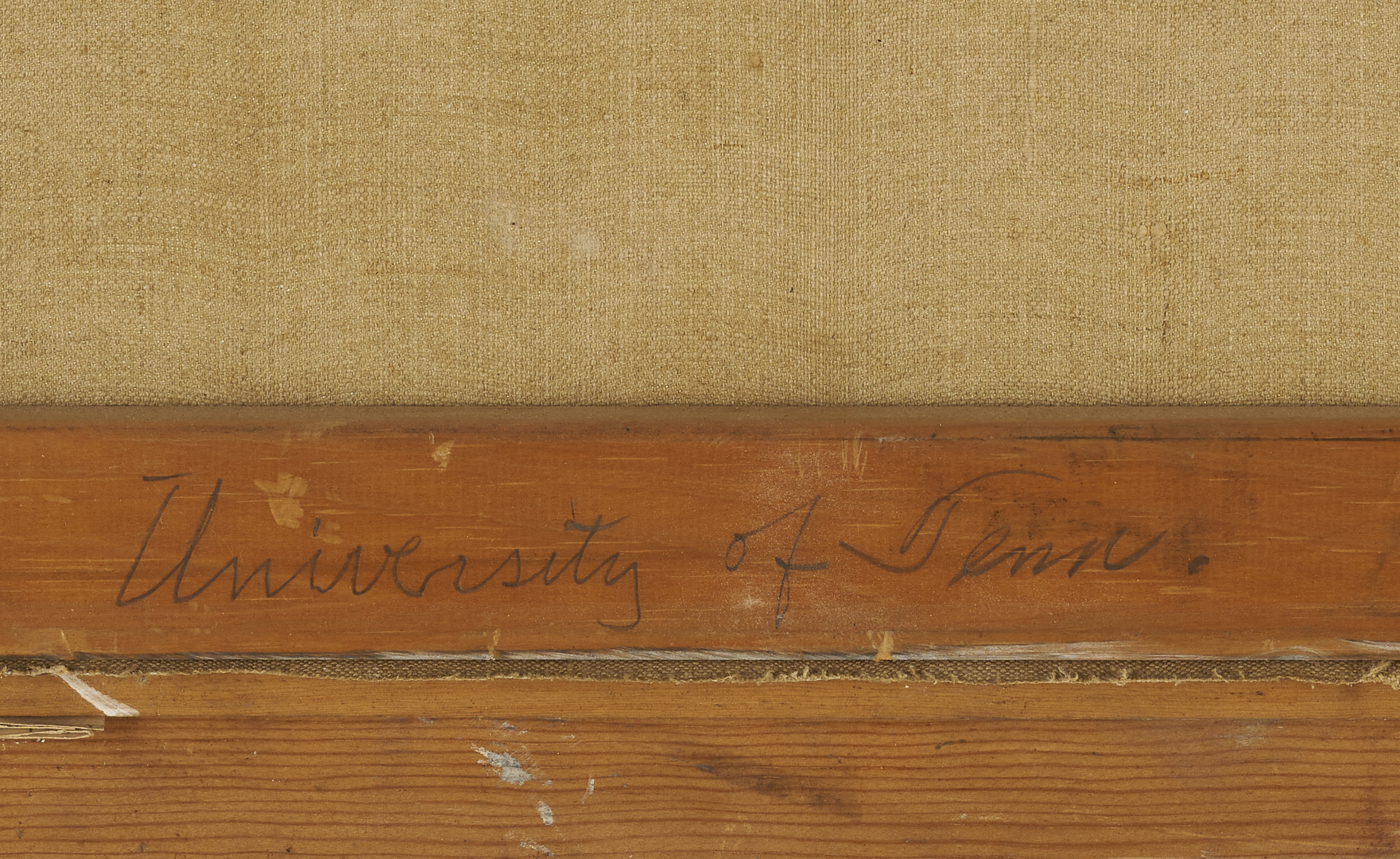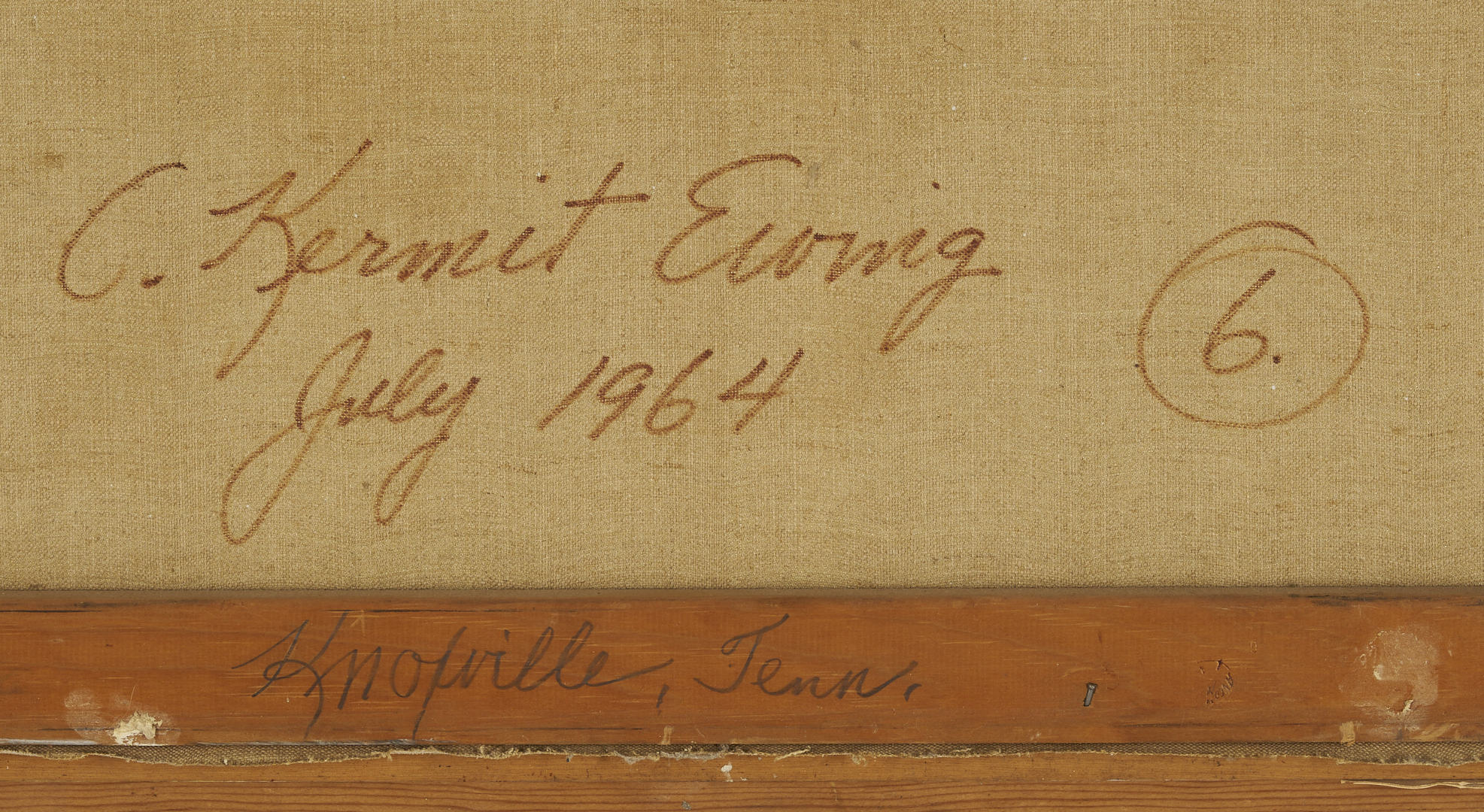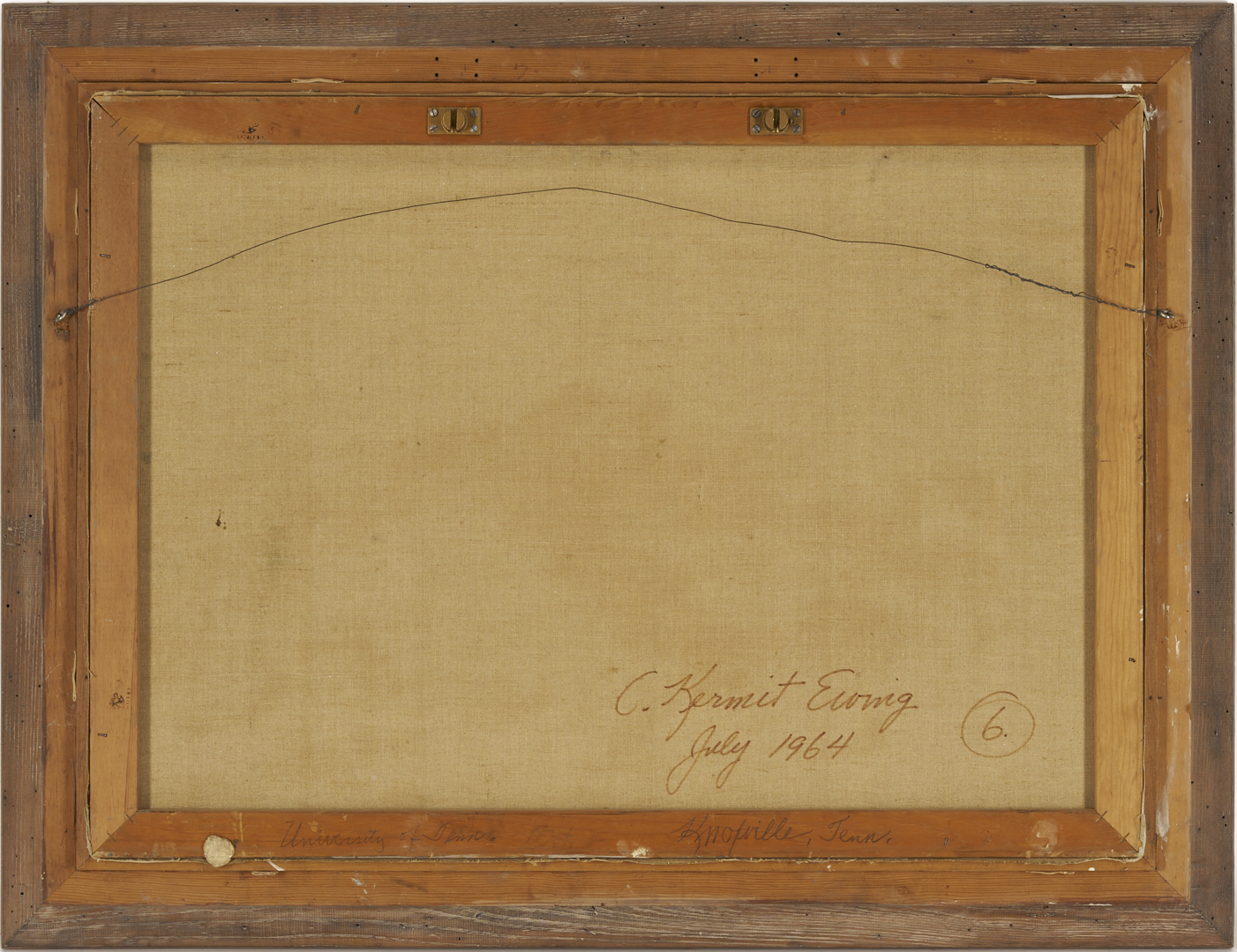 Charles Kermit “Buck” Ewing (Tennessee, 1910-1976) oil on canvas expressionist seascape depicting waves breaking on rocks under a tranquil sky and rendered in muted colors of blue, grey, white, and brown. Signed “C. Kermit Ewing,” dated July 1964, and numbered six en verso. Inscribed “University of Tenn.” and “Knoxville, TN” to stretcher. Housed in a wormy, distressed wood frame with a white liner. Sight: 25 1/4 in H x 35 1/2 in W. Frame: 33 in H x 43 in W. Biographical Note: A leader of the Knoxville 7 artist group, Charles Kermit “Buck” Ewing came to the University of Tennessee in 1947 to head the art program in the newly organized Department of Fine Arts. Born in Bentleyville, Pennsylvania, he studied under Jean Charlot at the University of Iowa and taught art at Indiana University of Pennsylvania and Carnegie Mellon. Among his art students at Carnegie Mellon were Philip Pearlstein and Andy Warhol. During his 29 years as head of UT’s art program, the faculty grew from one (himself) to 25, and the curriculum expanded to provide graduate and undergraduate opportunities in all the basic fine arts disciplines and in commercial art. During his career he was a leader in starting such groups as the Knoxville 7; Seven in New Rochelle, New York; the art society in Indiana, Pennsylvania; the Gilpin County Art Center in Central City, Colorado; the Knoxville Watercolor Society; the Tennessee College Arts Council; and the Knoxville Arts Council. He served as president of the Southeastern College Art Association. The Ewing Gallery in the University of Tennessee’s Art and Architecture Building is named for him. (Adapted from Betsey B. Creekmore, “C. Kermit Ewing,” University of Tennessee Libraries)