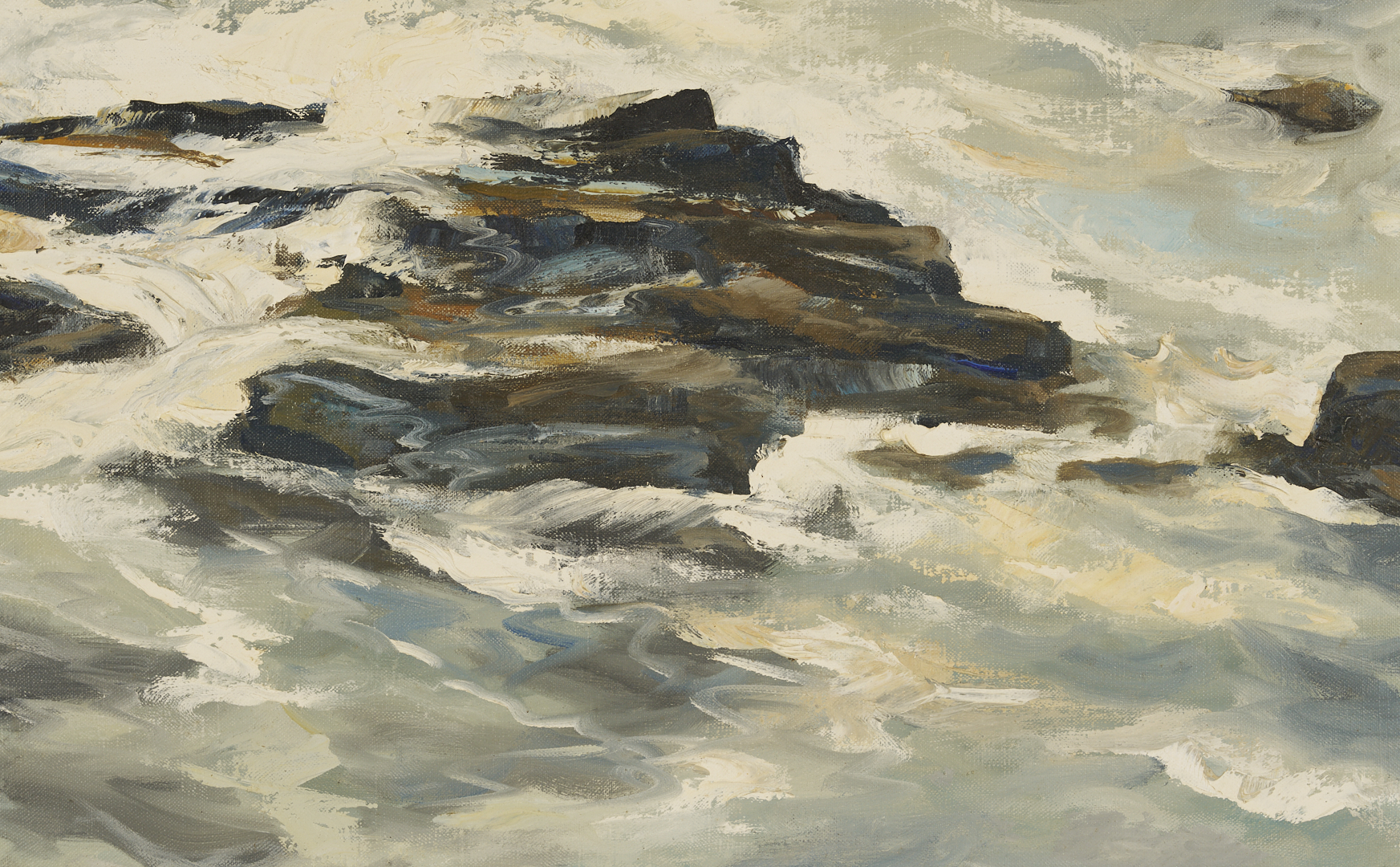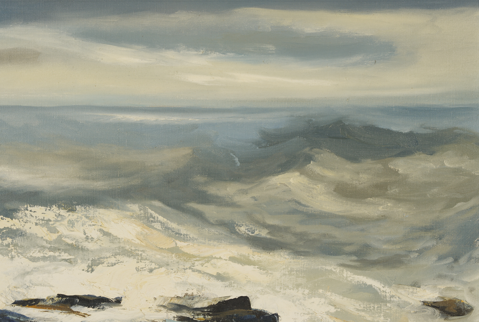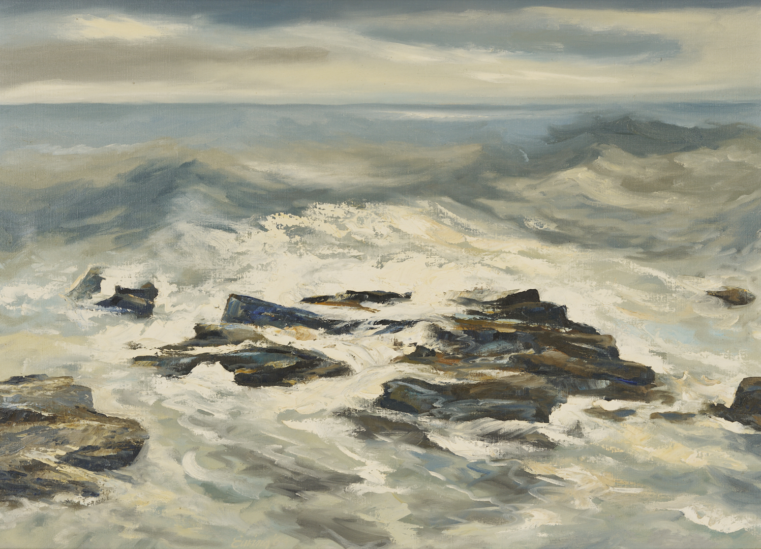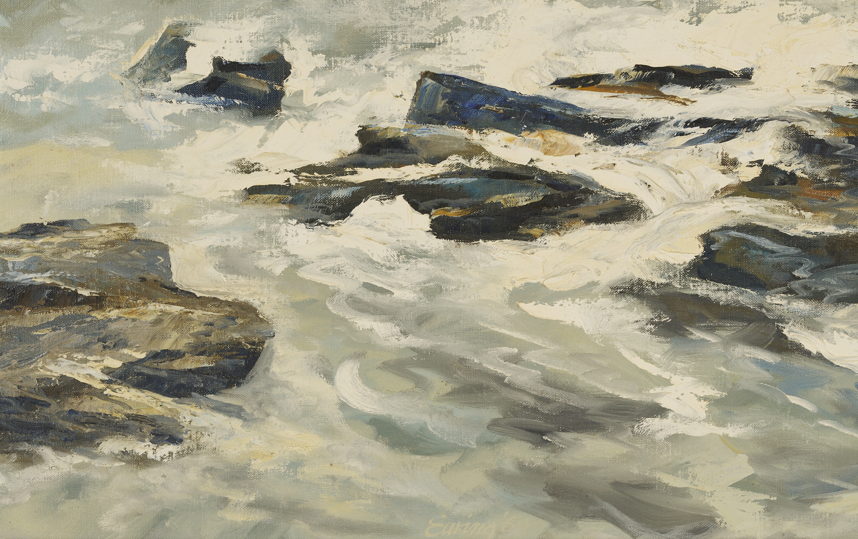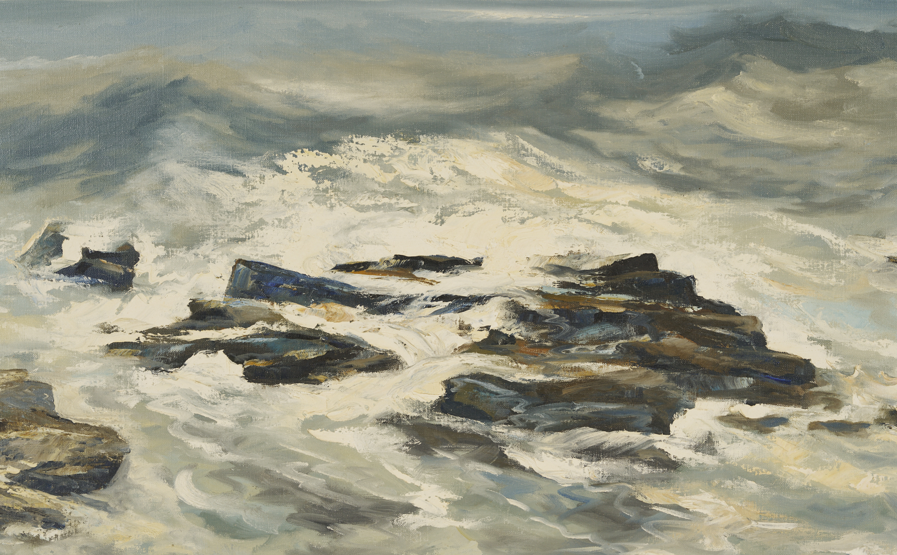 Charles Kermit “Buck” Ewing (Tennessee, 1910-1976) oil on canvas expressionist seascape depicting waves breaking on rocks under a tranquil sky and rendered in muted colors of blue, grey, white, and brown. Signed “C. Kermit Ewing,” dated July 1964, and numbered six en verso. Inscribed “University of Tenn.” and “Knoxville, TN” to stretcher. Housed in a wormy, distressed wood frame with a white liner. Sight: 25 1/4 in H x 35 1/2 in W. Frame: 33 in H x 43 in W. Biographical Note: A leader of the Knoxville 7 artist group, Charles Kermit “Buck” Ewing came to the University of Tennessee in 1947 to head the art program in the newly organized Department of Fine Arts. Born in Bentleyville, Pennsylvania, he studied under Jean Charlot at the University of Iowa and taught art at Indiana University of Pennsylvania and Carnegie Mellon. Among his art students at Carnegie Mellon were Philip Pearlstein and Andy Warhol. During his 29 years as head of UT’s art program, the faculty grew from one (himself) to 25, and the curriculum expanded to provide graduate and undergraduate opportunities in all the basic fine arts disciplines and in commercial art. During his career he was a leader in starting such groups as the Knoxville 7; Seven in New Rochelle, New York; the art society in Indiana, Pennsylvania; the Gilpin County Art Center in Central City, Colorado; the Knoxville Watercolor Society; the Tennessee College Arts Council; and the Knoxville Arts Council. He served as president of the Southeastern College Art Association. The Ewing Gallery in the University of Tennessee’s Art and Architecture Building is named for him. (Adapted from Betsey B. Creekmore, “C. Kermit Ewing,” University of Tennessee Libraries)