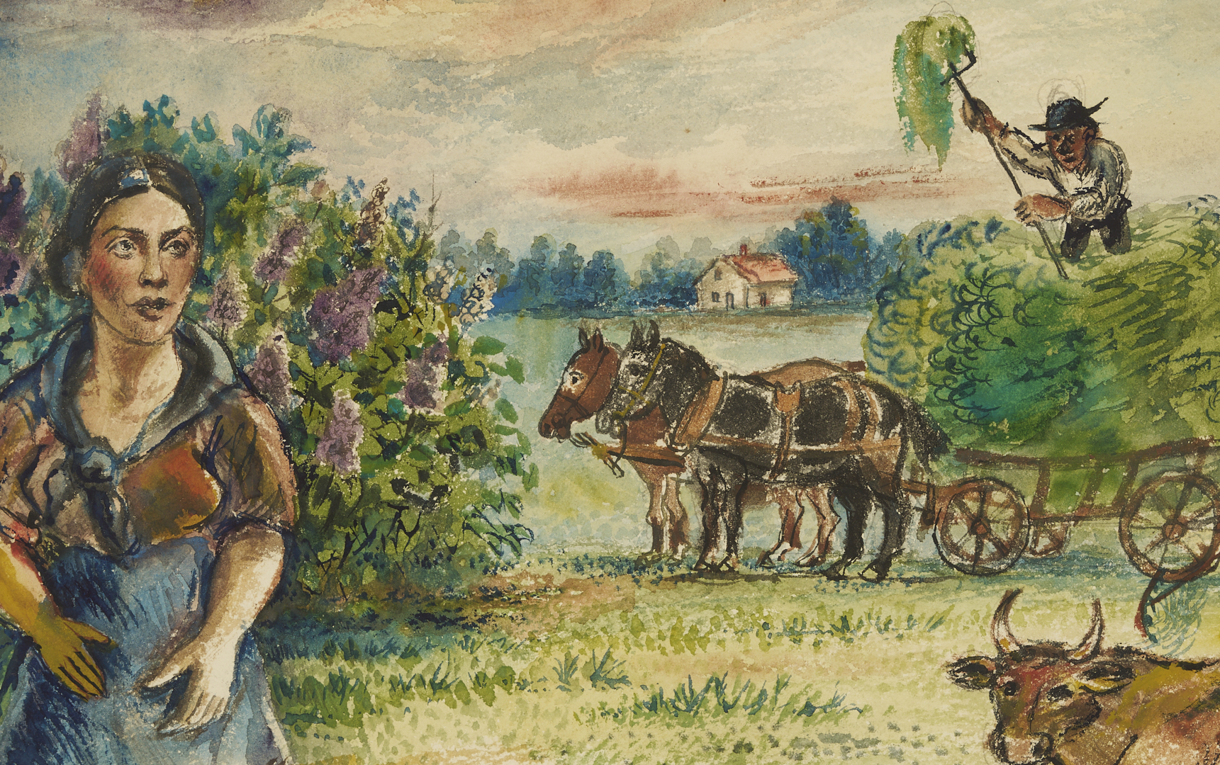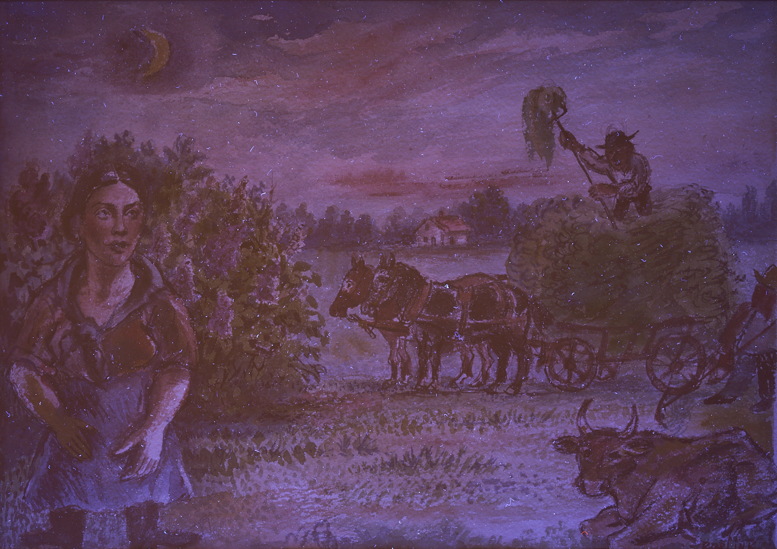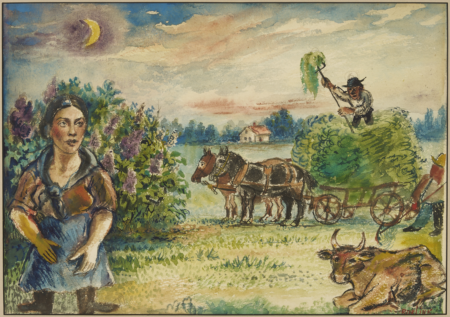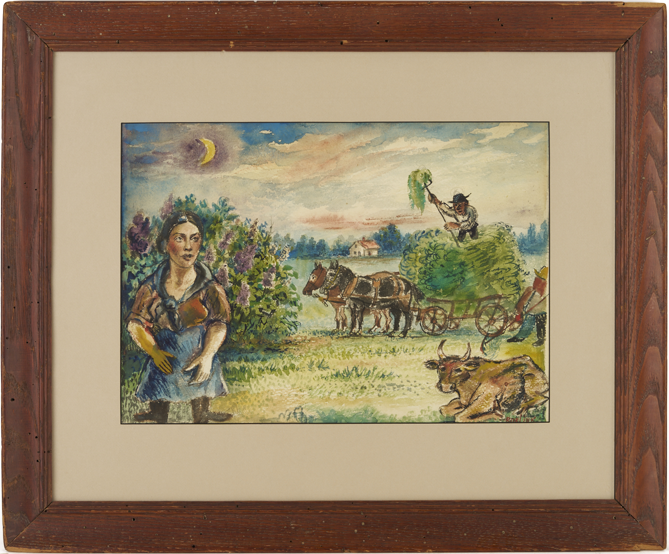 David Davidovich Burliuk (New York/Russian Federation/Ukraine, 1882-1967) watercolor on paper farm landscape painting with a dark-haired woman at left and two farmers who pile fresh hay into a horse-drawn cart at right. A cow rests on the ground below the farmers. Above, a crescent moon hangs in the sky while in the background a house stands before a row of trees. Signed lower right. Housed under glass in a wormy chestnut frame with gray mat. Sight: 10 1/4 in. H x 14 3/4 in. W. Frame: 19 in. H x 23 in. W. Biography: “Born into a privileged class of Russian Society, David Burliuk became a central figure in the history of the Russian avant-garde movement as an accomplished poet, art critic, and exhibition organizer. He studied at the Kazan School of Fine Arts in 1898, then in Odessa, Moscow, Munich, and in Paris at the Ecole des Beaux Arts, however, as a breaker of artistic tradition, he found himself expelled from the Moscow Institute in 1911. His early works were Fauve-like and were exhibited with the Blue Riders in Munich. With the advent of World War I, he left Russia and traveled for four years. He moved to America in 1922 and settled on Long Island where he continued to paint until his death in 1967.” (Source: Michael David Zellman, 300 Years of American Art)