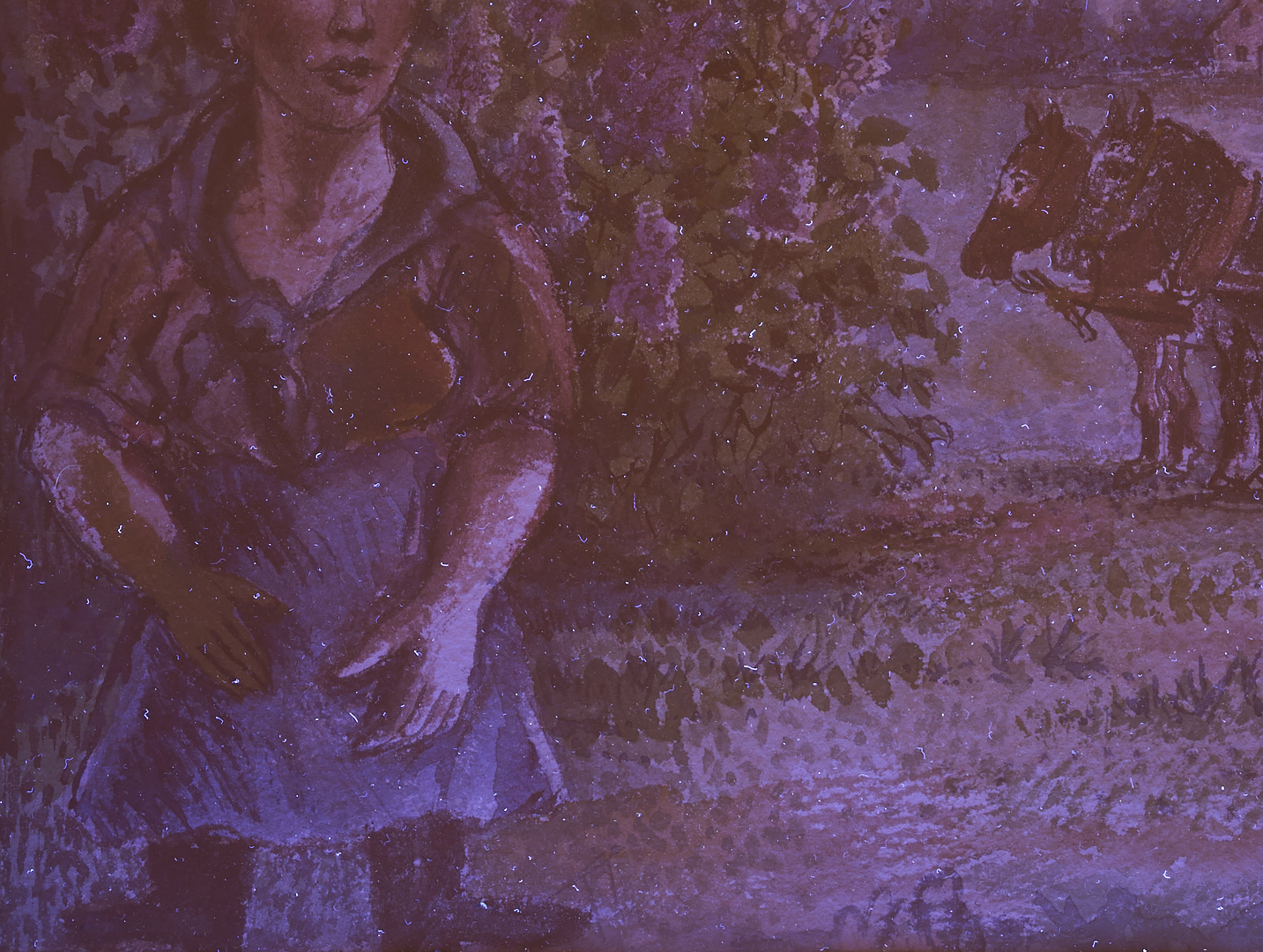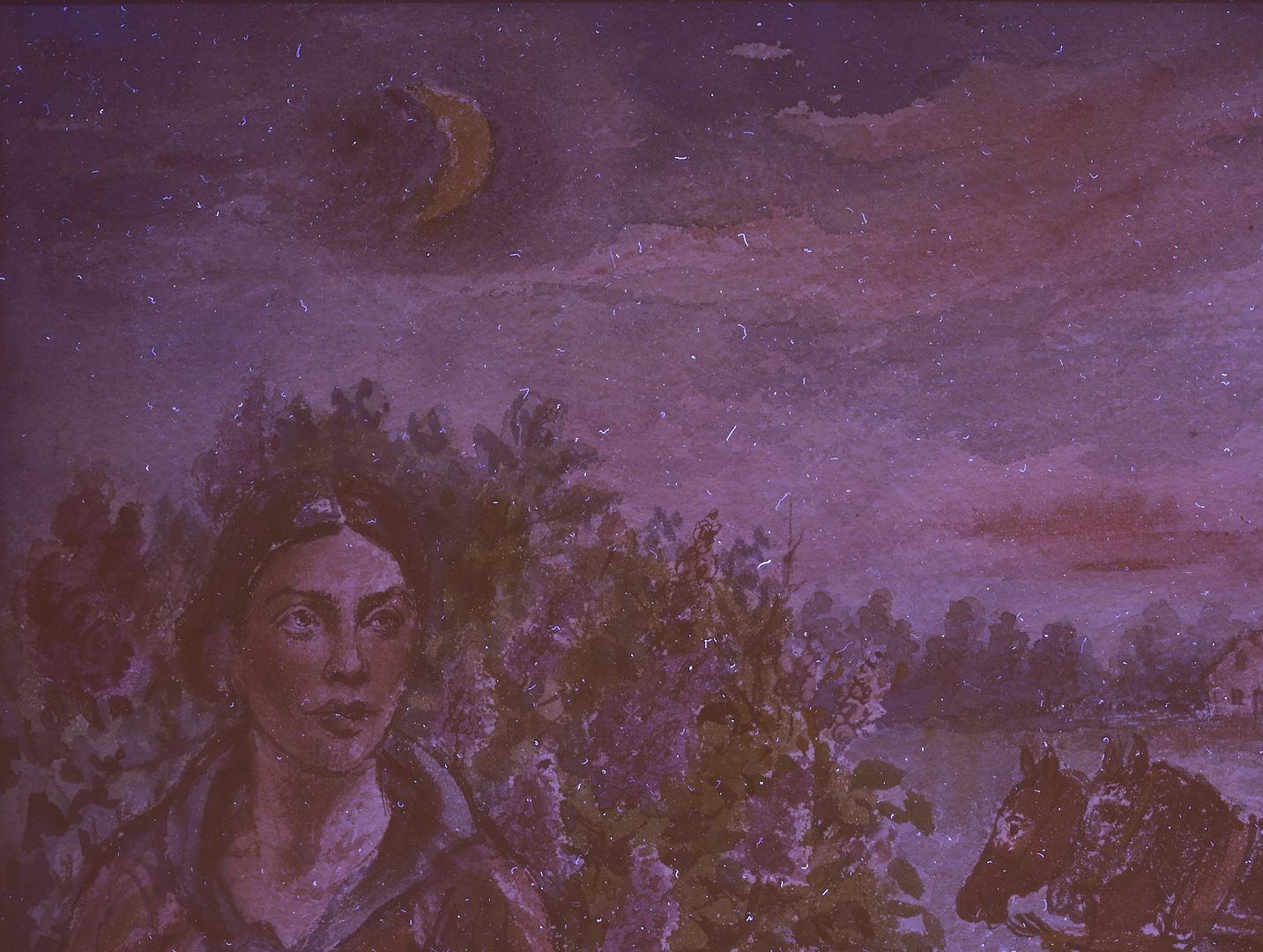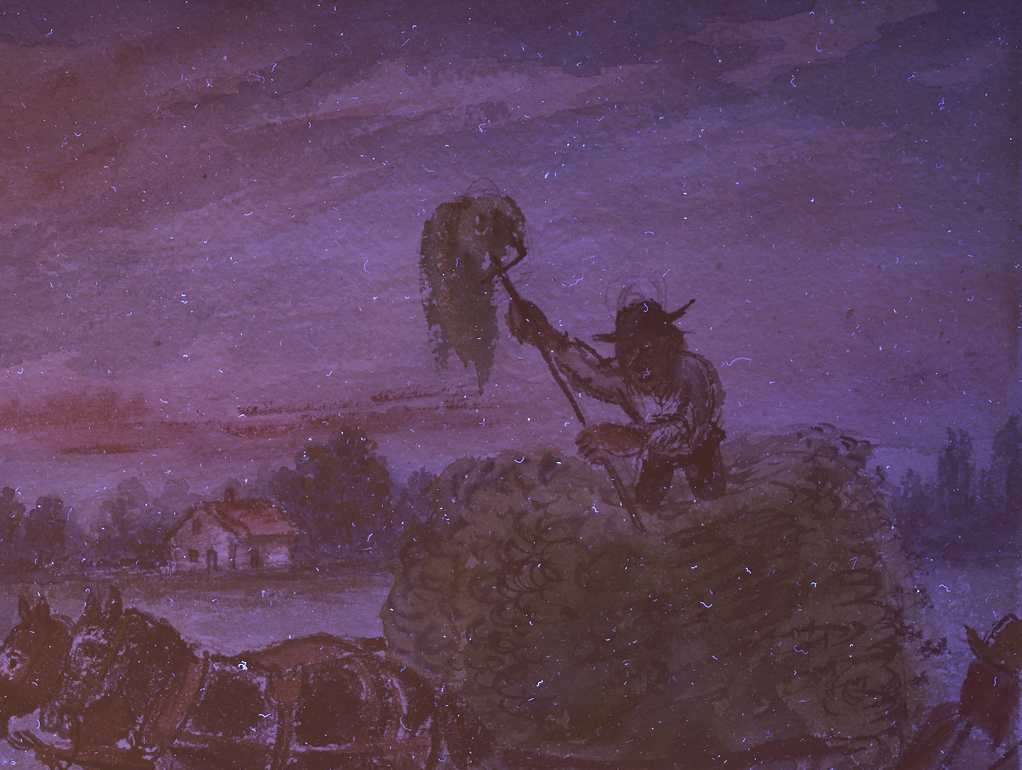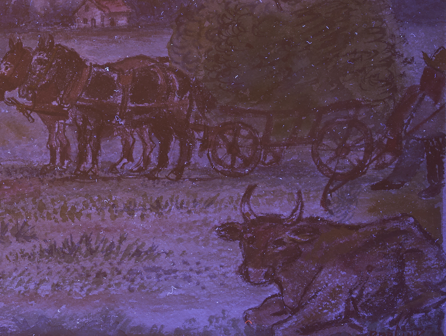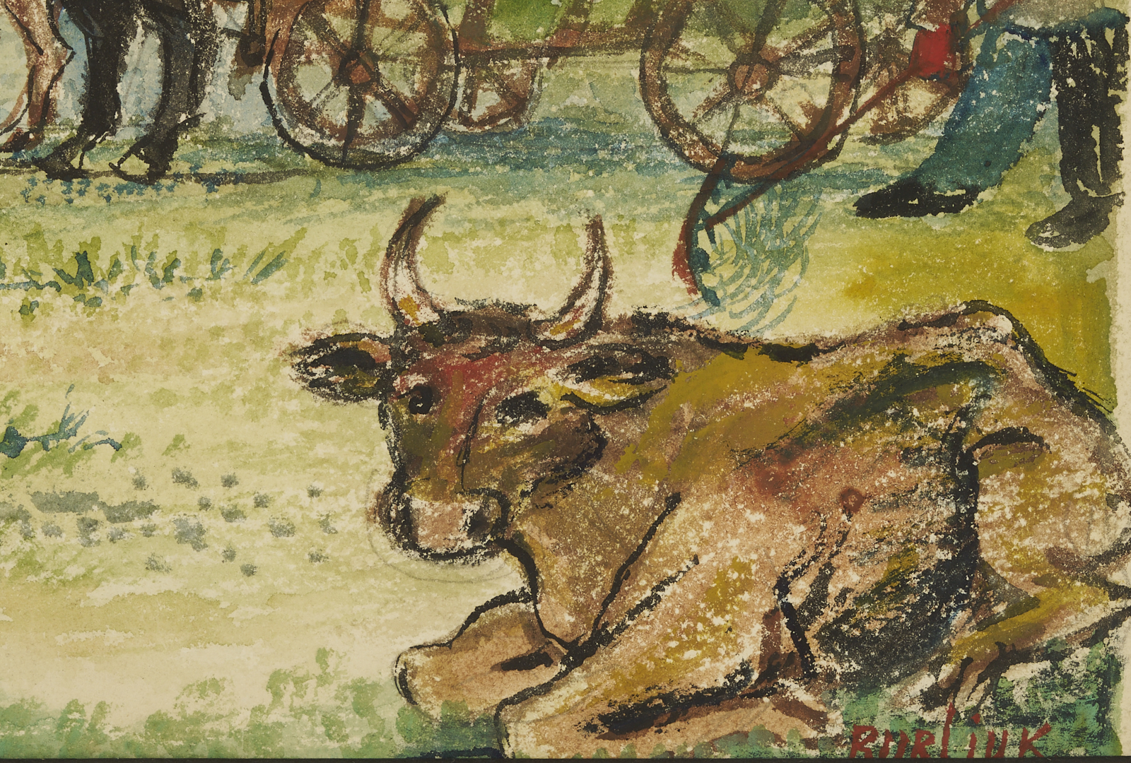 David Davidovich Burliuk (New York/Russian Federation/Ukraine, 1882-1967) watercolor on paper farm landscape painting with a dark-haired woman at left and two farmers who pile fresh hay into a horse-drawn cart at right. A cow rests on the ground below the farmers. Above, a crescent moon hangs in the sky while in the background a house stands before a row of trees. Signed lower right. Housed under glass in a wormy chestnut frame with gray mat. Sight: 10 1/4 in. H x 14 3/4 in. W. Frame: 19 in. H x 23 in. W. Biography: “Born into a privileged class of Russian Society, David Burliuk became a central figure in the history of the Russian avant-garde movement as an accomplished poet, art critic, and exhibition organizer. He studied at the Kazan School of Fine Arts in 1898, then in Odessa, Moscow, Munich, and in Paris at the Ecole des Beaux Arts, however, as a breaker of artistic tradition, he found himself expelled from the Moscow Institute in 1911. His early works were Fauve-like and were exhibited with the Blue Riders in Munich. With the advent of World War I, he left Russia and traveled for four years. He moved to America in 1922 and settled on Long Island where he continued to paint until his death in 1967.” (Source: Michael David Zellman, 300 Years of American Art)
