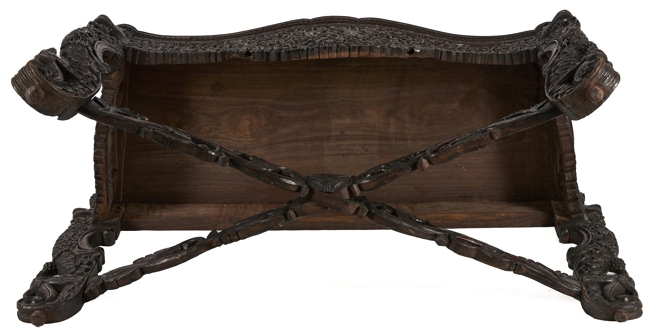 19th-century Anglo-Indian hardwood console table, serpentine-shaped top with rounded front corners, extensive carving throughout, including a foliate pierced and carved gallery and apron, joined by pierced-carved cross stretchers, and raised on carved cabriole legs with cat/tiger masks to the upper legs and figural peacocks at the feet. 40 3/4 in. H x 47 in. W x 21 1/4 in. D.