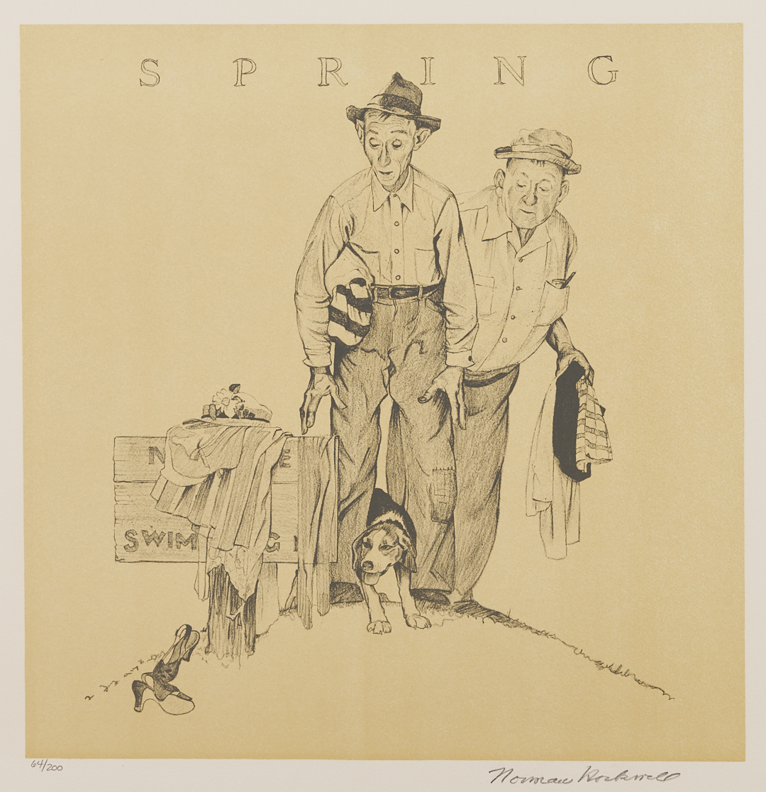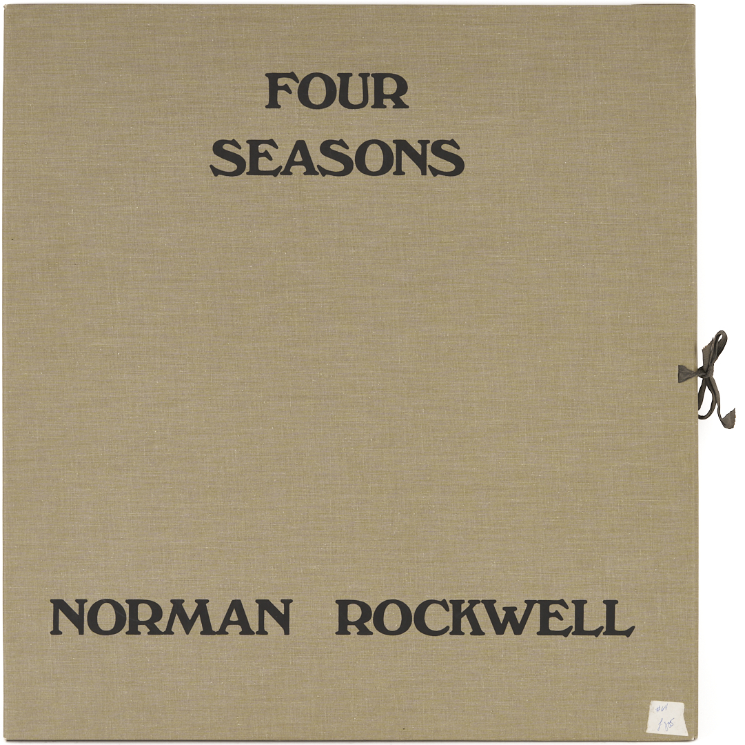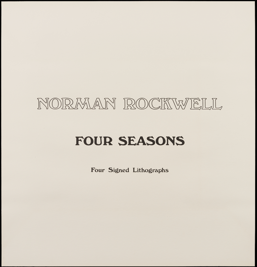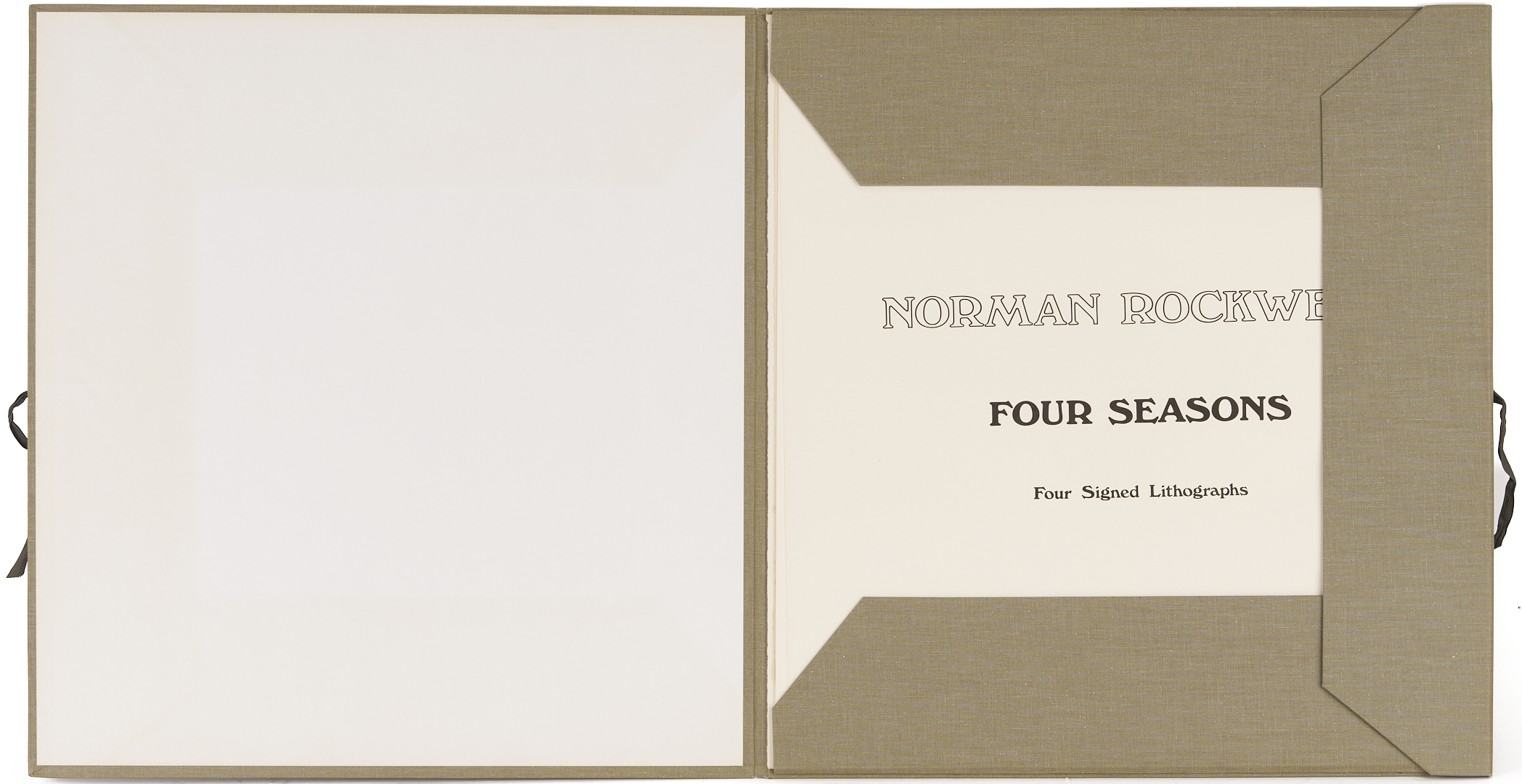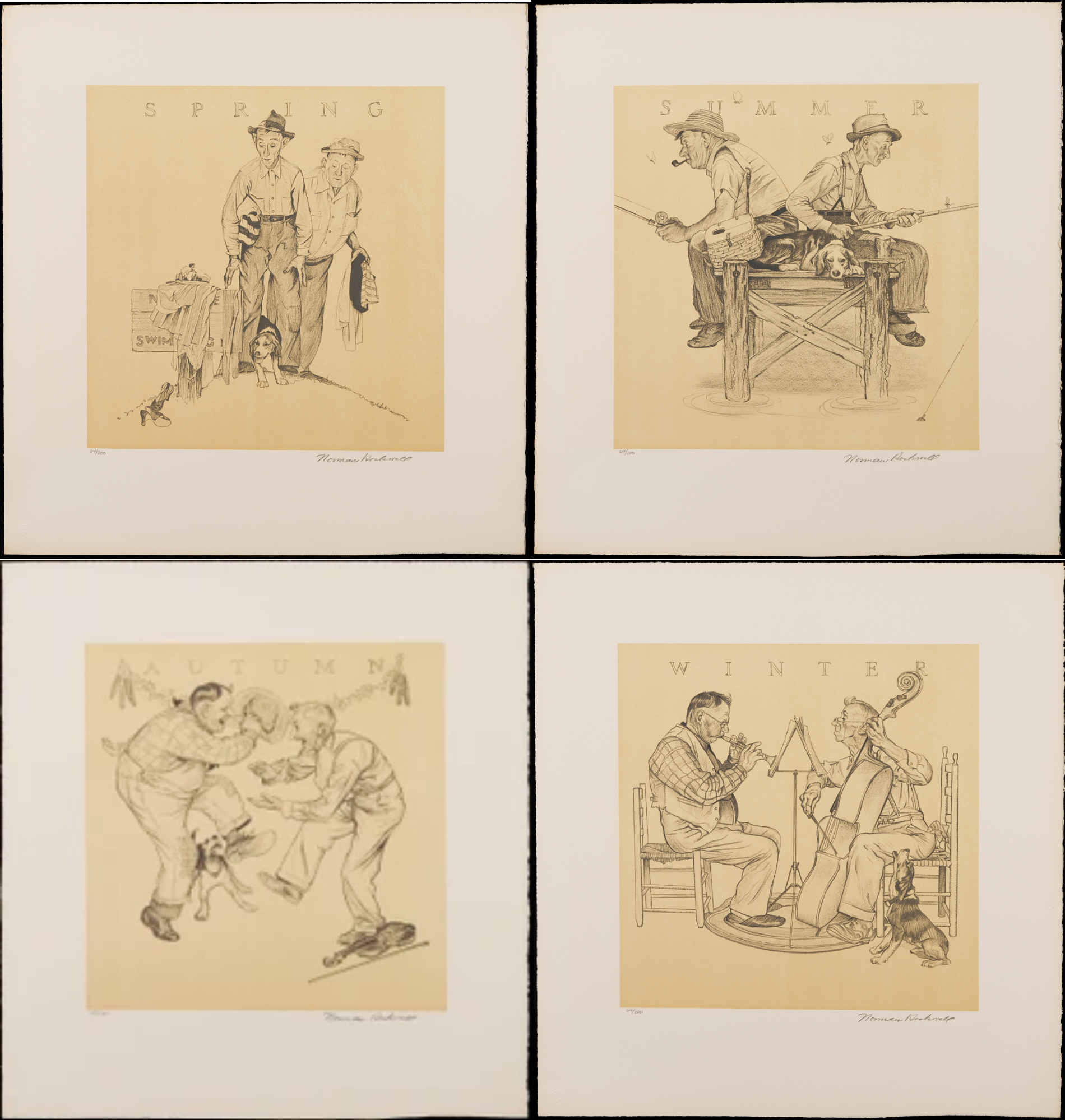 Group of four (4) Norman Perceval Rockwell (New York/Massachusetts, 1894-1978) lithographs on velin d’Arches paper, the complete Four Seasons portfolio including “Spring/Two Old Men & Dog – No Swimming,” “Summer/Two Old Men & Dog – Fishing Dock,” “Autumn/Two Old Men & Dog – Square Dance,” and “Winter/Two Old Men & Dog – Musicians” plus title page and colophon, 1974. Published by Circle Gallery Ltd. and printed by The American Atelier, with publisher’s blindstamp to lower left. Each signed in pencil, lower right, and numbered 64/200, lower left, along with colophon. Housed in the original green textile portfolio case. Case: 21 in. H x 19 3/4 in. W. Sheets: 20 1/2 in. H x 19 1/2 in. W. Note: Brown and Bigelow commissioned Rockwell to illustrate their Four Seasons calendars from 1948-1964. The present images were originally created for the 1953 calendar.