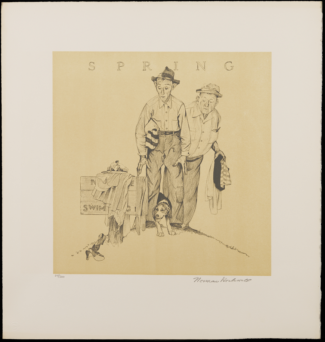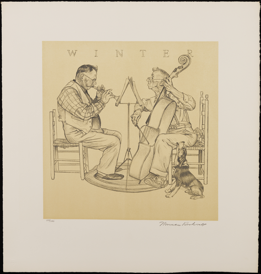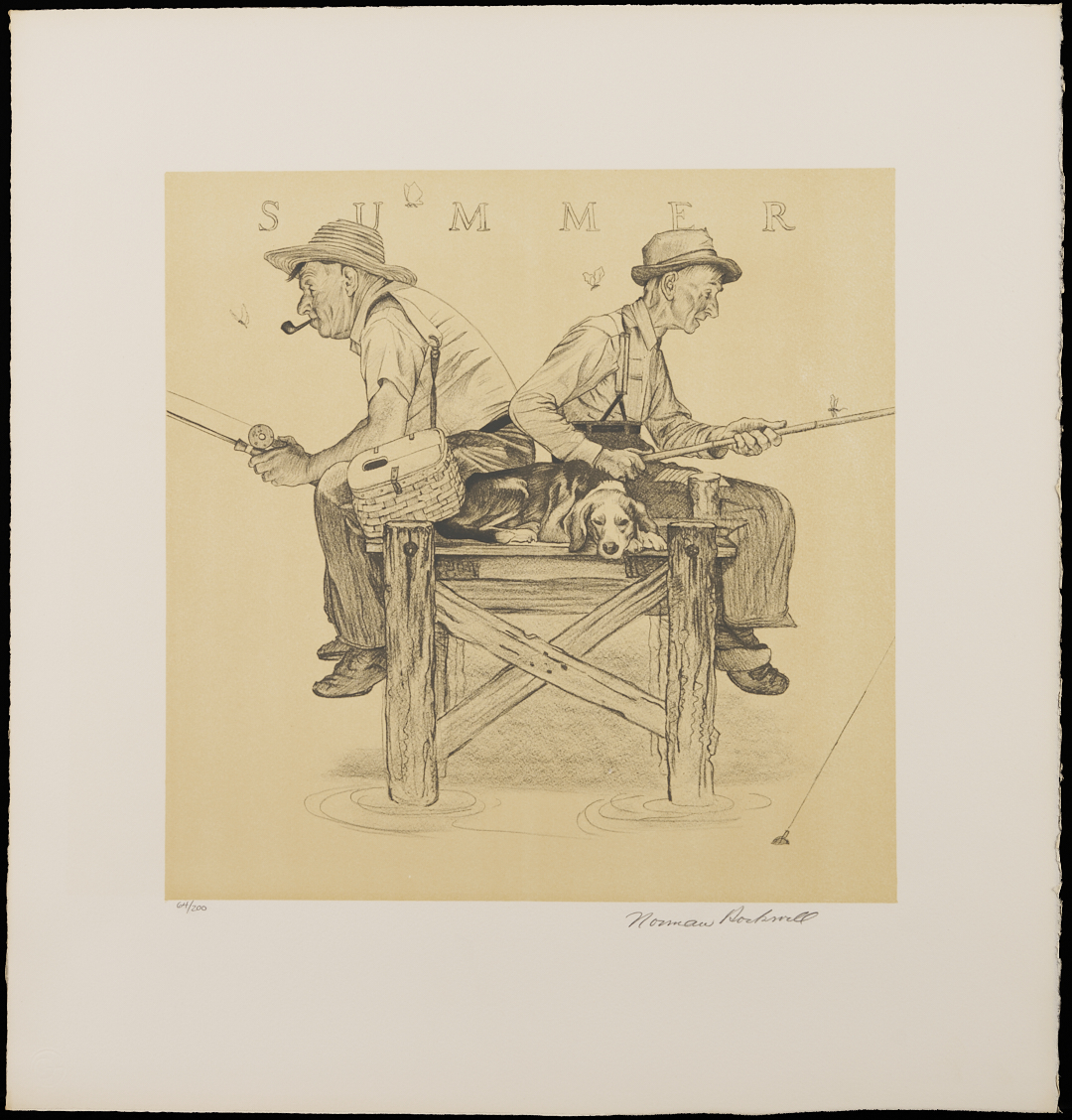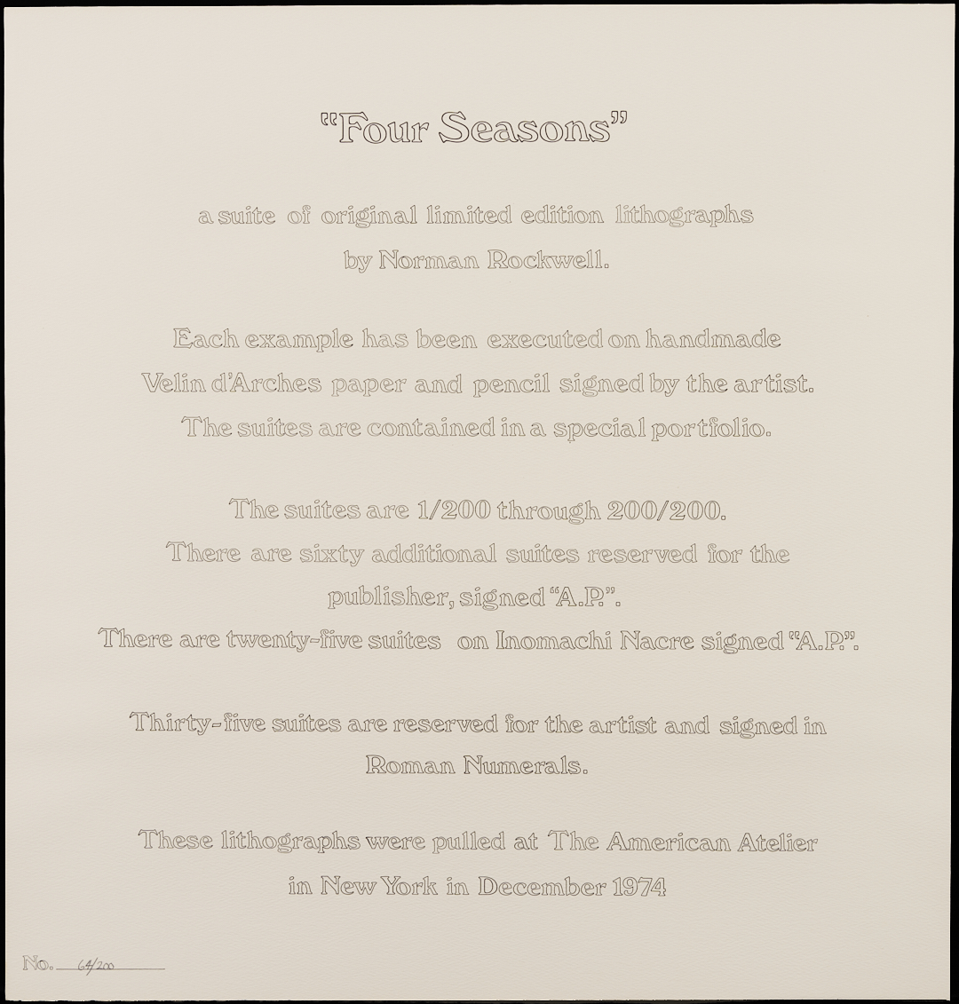 Group of four (4) Norman Perceval Rockwell (New York/Massachusetts, 1894-1978) lithographs on velin d’Arches paper, the complete Four Seasons portfolio including “Spring/Two Old Men & Dog – No Swimming,” “Summer/Two Old Men & Dog – Fishing Dock,” “Autumn/Two Old Men & Dog – Square Dance,” and “Winter/Two Old Men & Dog – Musicians” plus title page and colophon, 1974. Published by Circle Gallery Ltd. and printed by The American Atelier, with publisher’s blindstamp to lower left. Each signed in pencil, lower right, and numbered 64/200, lower left, along with colophon. Housed in the original green textile portfolio case. Case: 21 in. H x 19 3/4 in. W. Sheets: 20 1/2 in. H x 19 1/2 in. W. Note: Brown and Bigelow commissioned Rockwell to illustrate their Four Seasons calendars from 1948-1964. The present images were originally created for the 1953 calendar.
