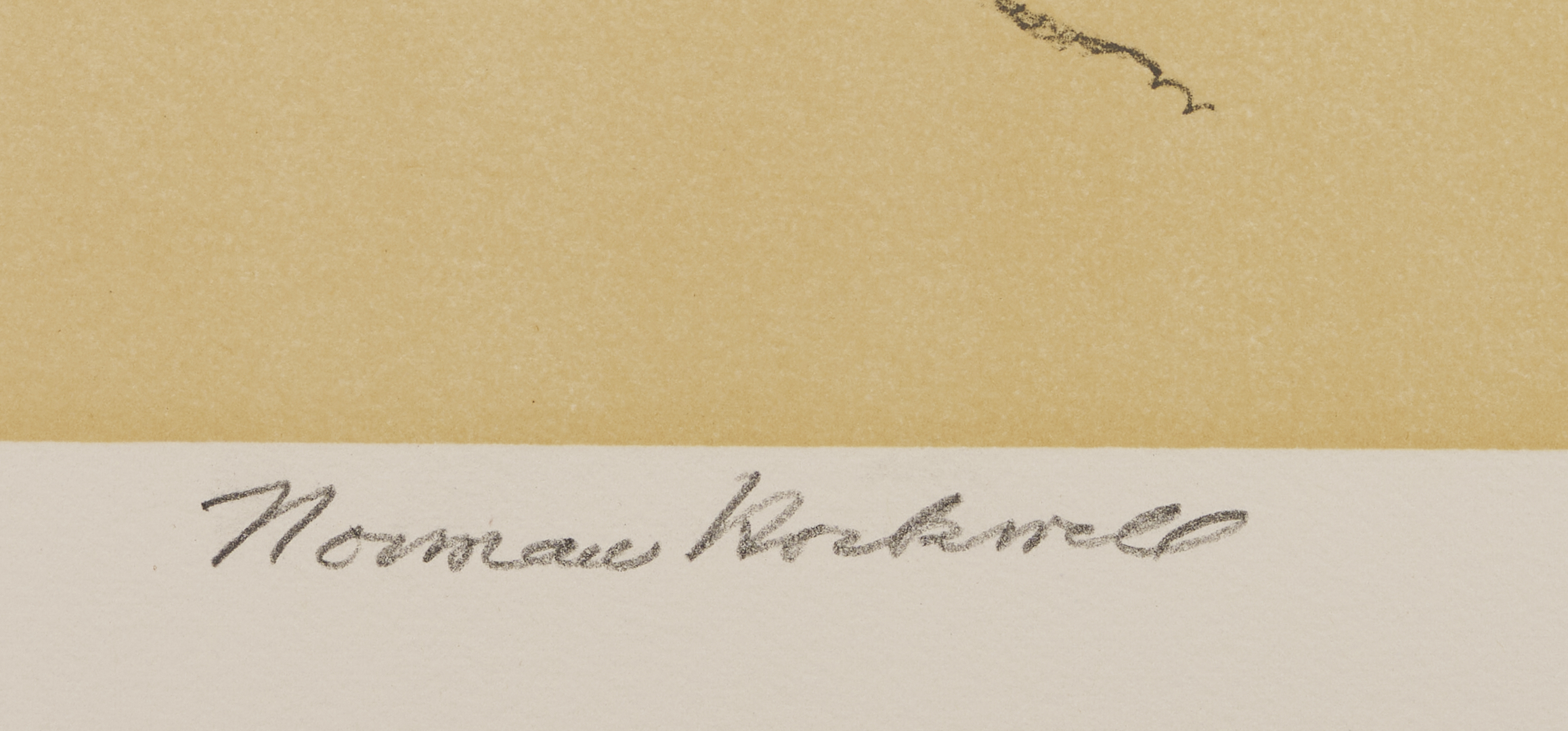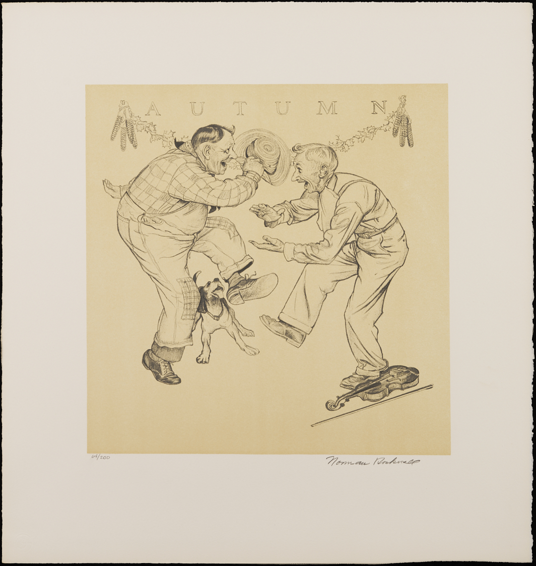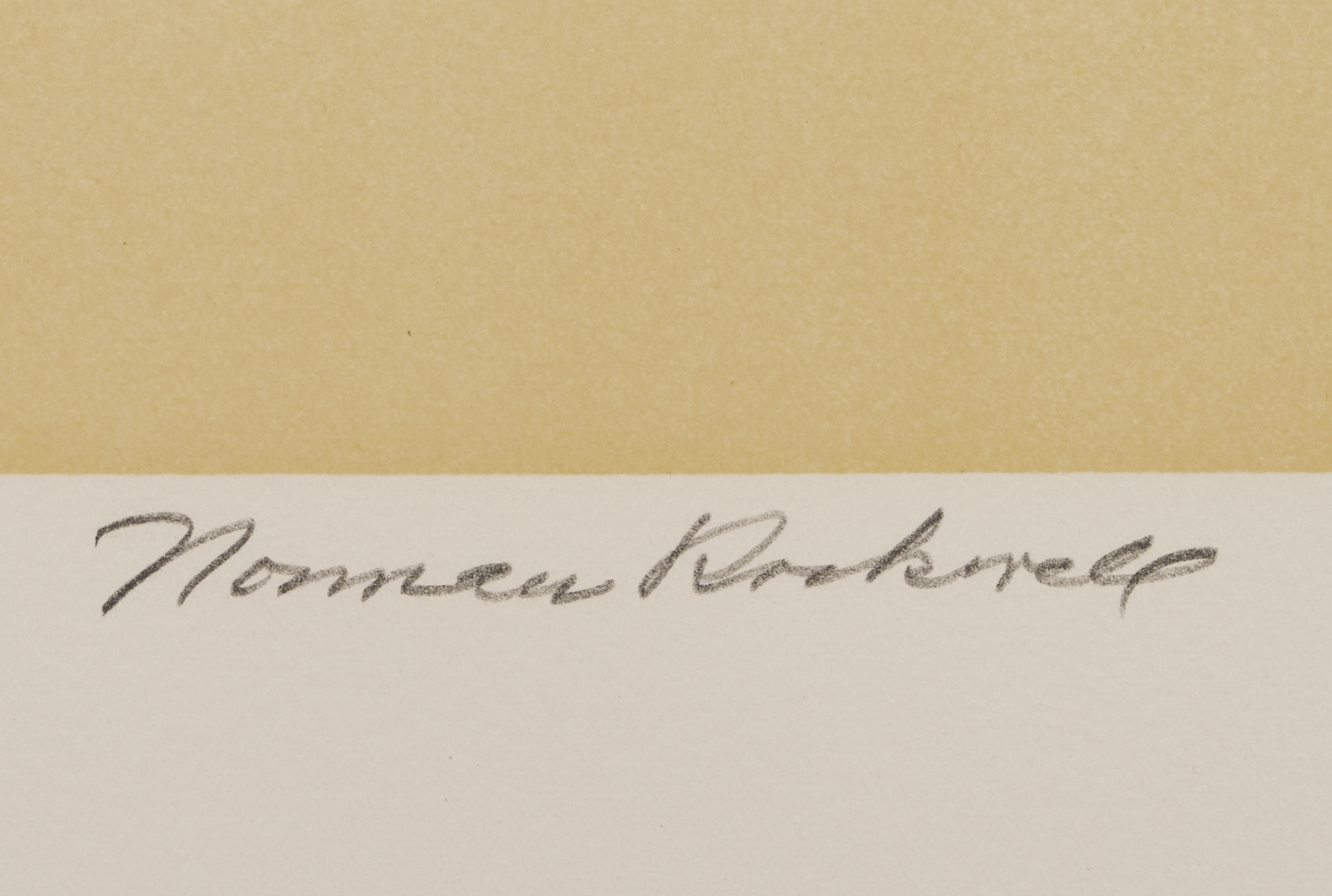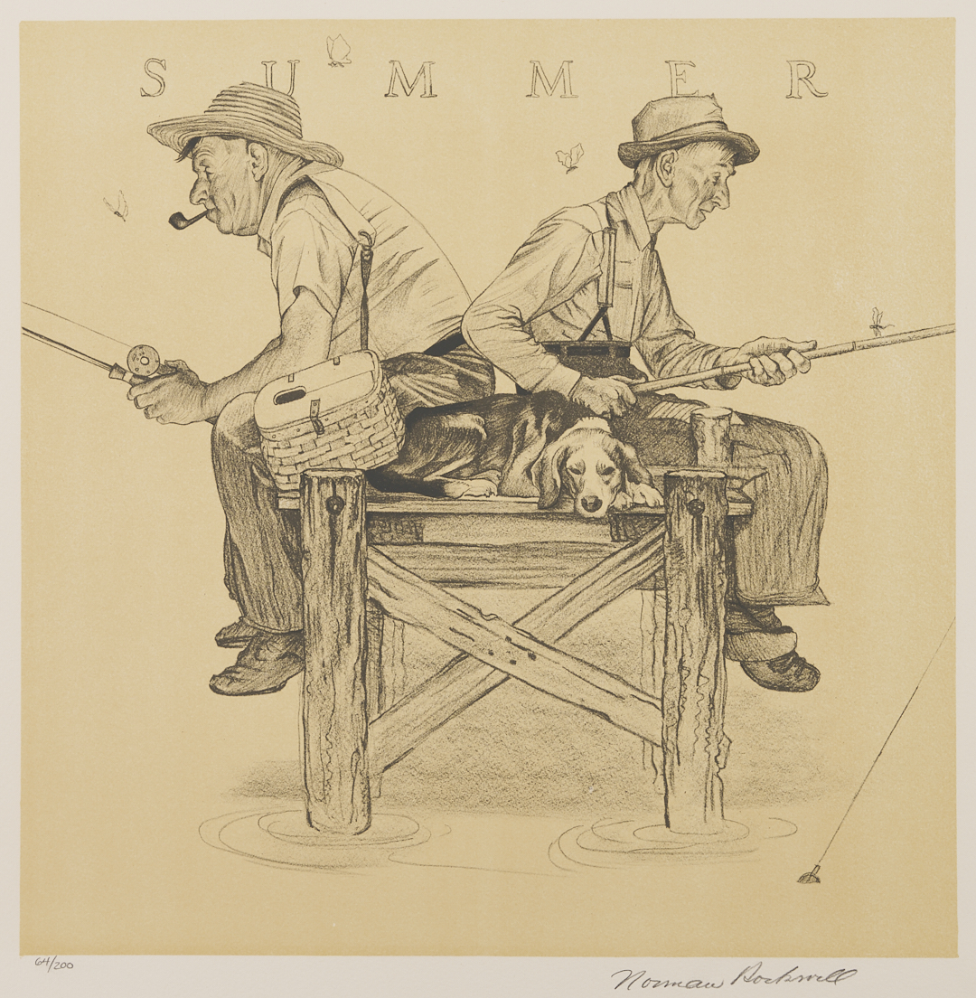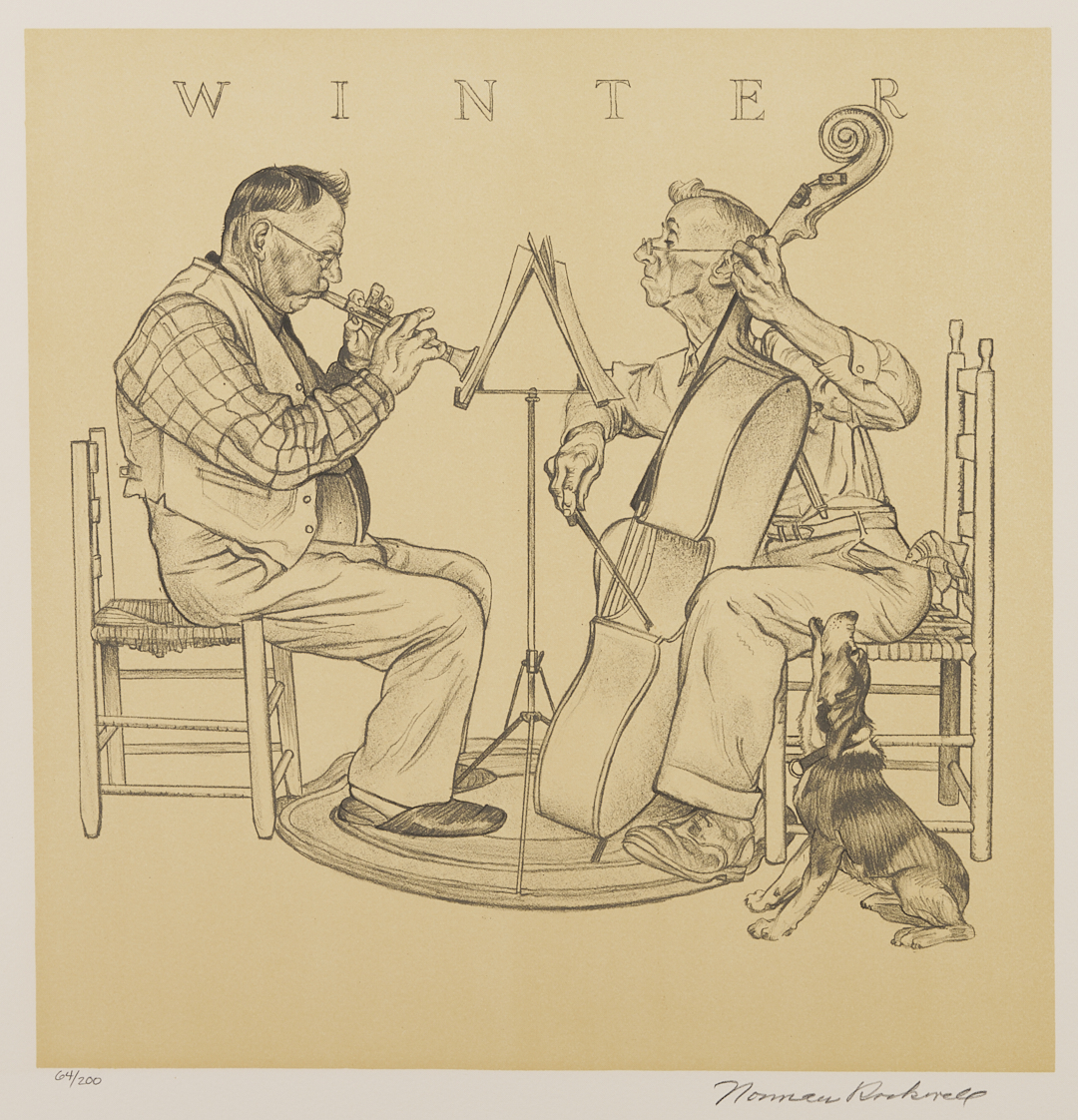 Group of four (4) Norman Perceval Rockwell (New York/Massachusetts, 1894-1978) lithographs on velin d’Arches paper, the complete Four Seasons portfolio including “Spring/Two Old Men & Dog – No Swimming,” “Summer/Two Old Men & Dog – Fishing Dock,” “Autumn/Two Old Men & Dog – Square Dance,” and “Winter/Two Old Men & Dog – Musicians” plus title page and colophon, 1974. Published by Circle Gallery Ltd. and printed by The American Atelier, with publisher’s blindstamp to lower left. Each signed in pencil, lower right, and numbered 64/200, lower left, along with colophon. Housed in the original green textile portfolio case. Case: 21 in. H x 19 3/4 in. W. Sheets: 20 1/2 in. H x 19 1/2 in. W. Note: Brown and Bigelow commissioned Rockwell to illustrate their Four Seasons calendars from 1948-1964. The present images were originally created for the 1953 calendar.