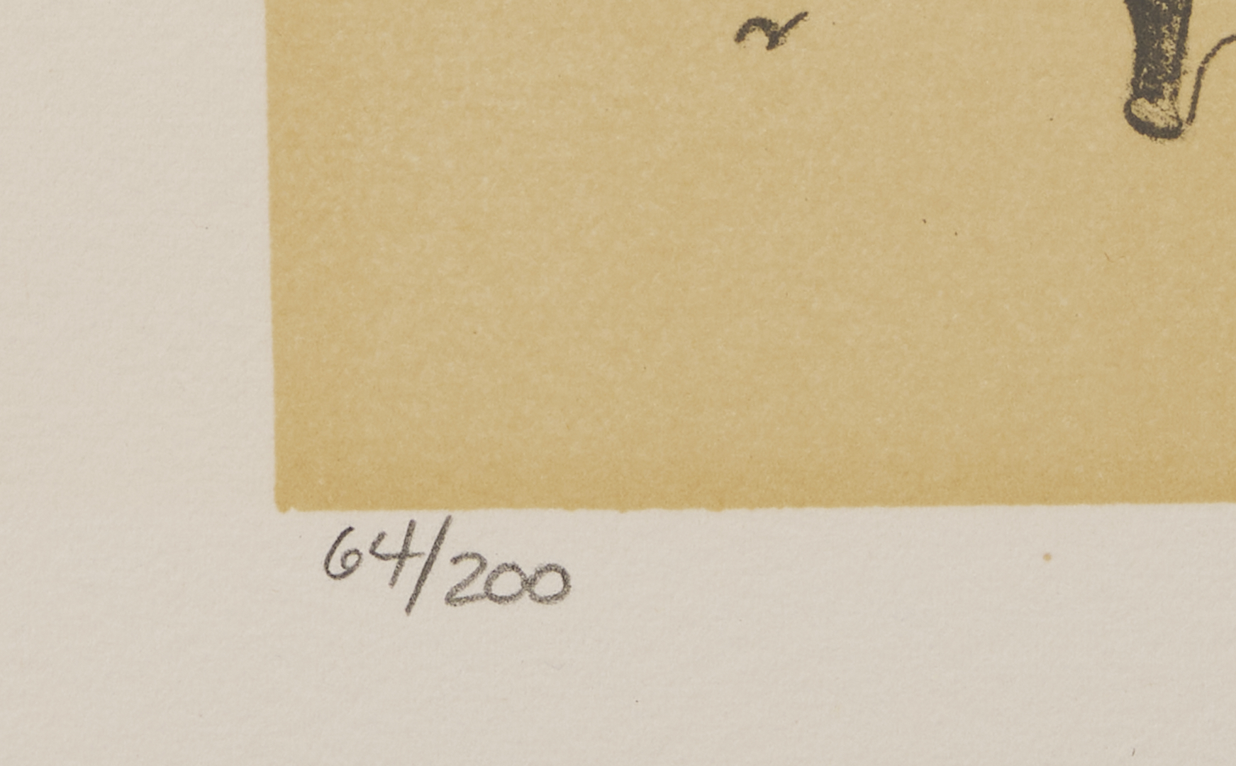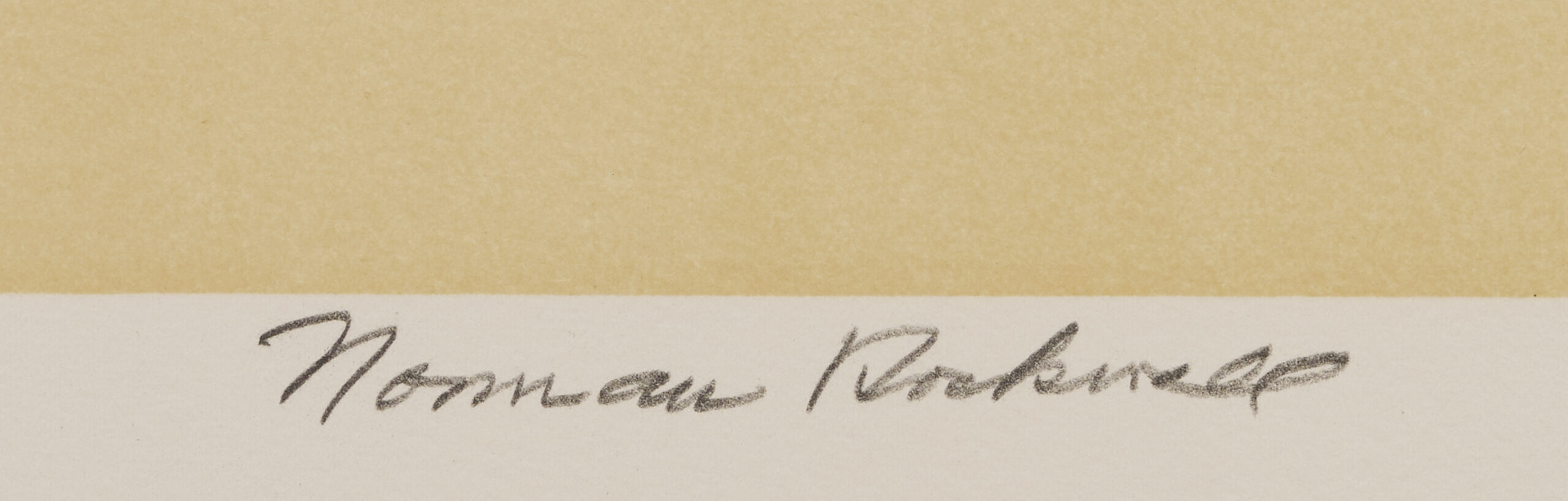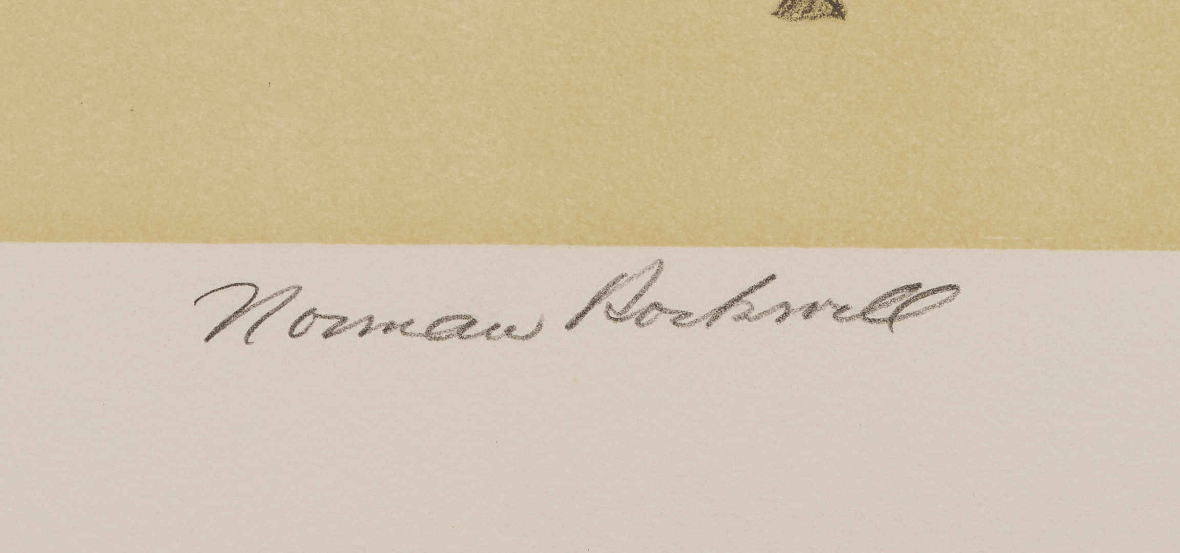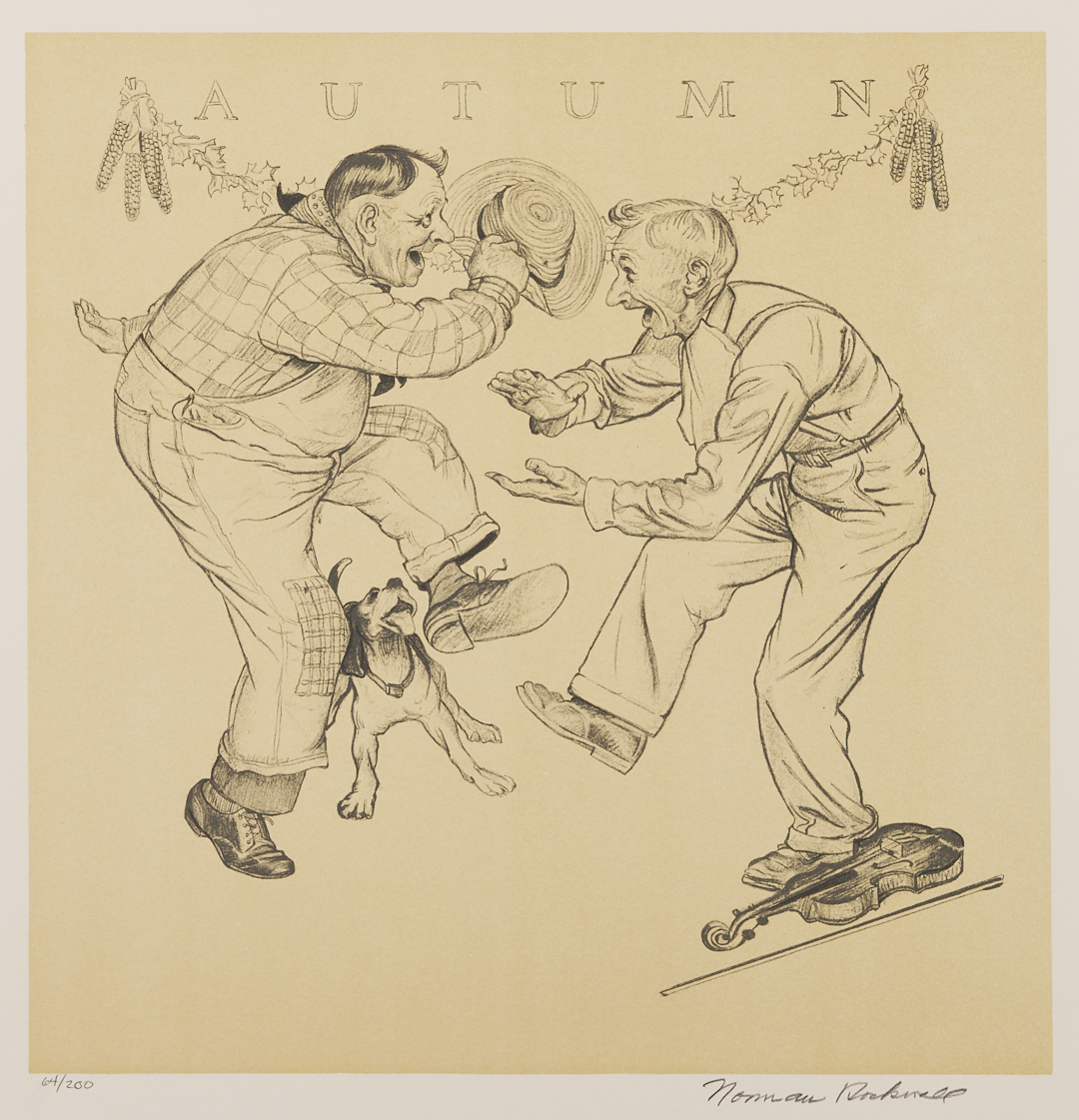 Group of four (4) Norman Perceval Rockwell (New York/Massachusetts, 1894-1978) lithographs on velin d’Arches paper, the complete Four Seasons portfolio including “Spring/Two Old Men & Dog – No Swimming,” “Summer/Two Old Men & Dog – Fishing Dock,” “Autumn/Two Old Men & Dog – Square Dance,” and “Winter/Two Old Men & Dog – Musicians” plus title page and colophon, 1974. Published by Circle Gallery Ltd. and printed by The American Atelier, with publisher’s blindstamp to lower left. Each signed in pencil, lower right, and numbered 64/200, lower left, along with colophon. Housed in the original green textile portfolio case. Case: 21 in. H x 19 3/4 in. W. Sheets: 20 1/2 in. H x 19 1/2 in. W. Note: Brown and Bigelow commissioned Rockwell to illustrate their Four Seasons calendars from 1948-1964. The present images were originally created for the 1953 calendar.