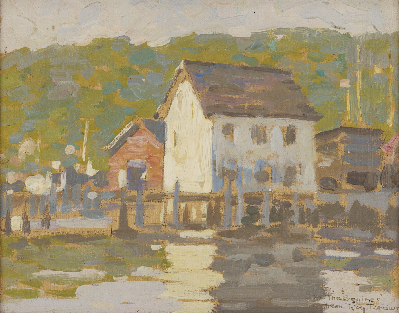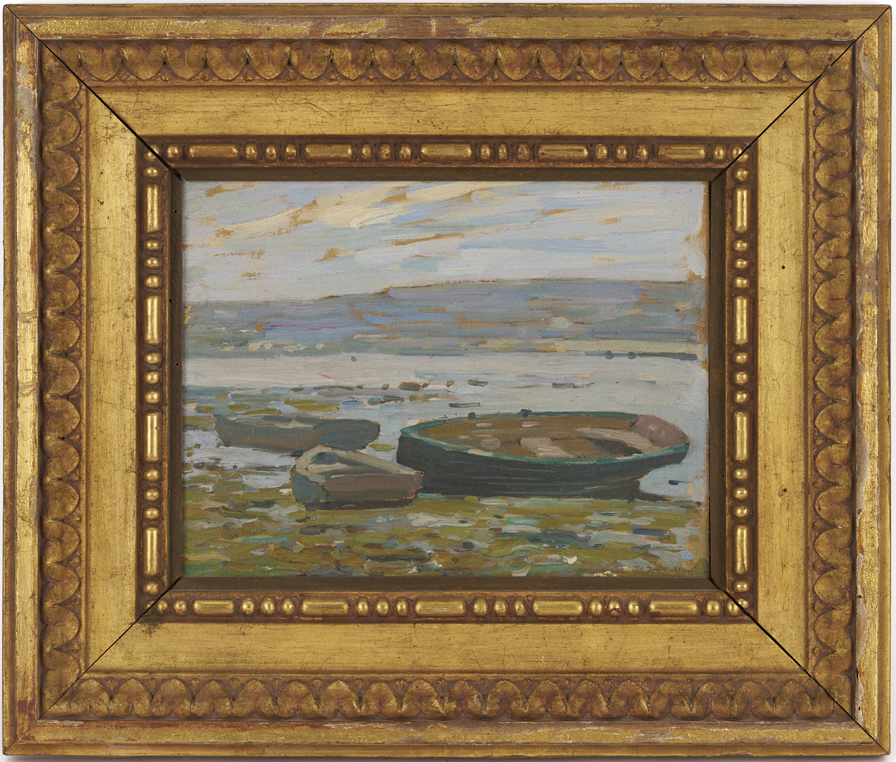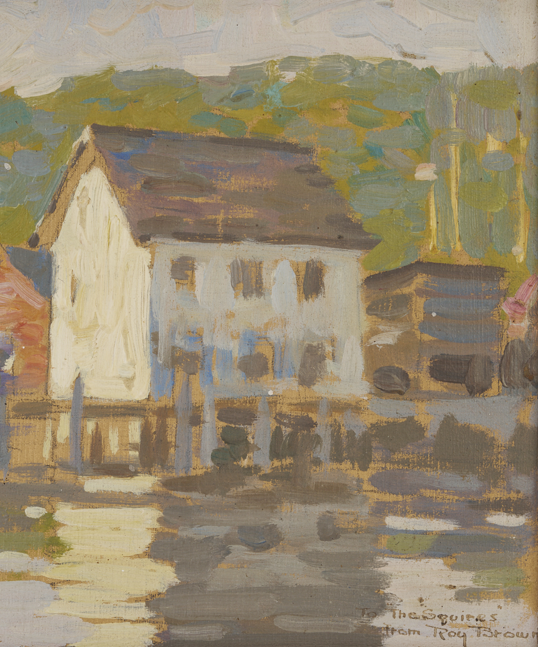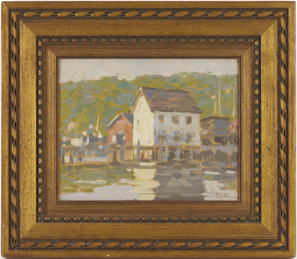 Roy Henry Brown (American, 1879-1956), two small oil on board impressionist landscape paintings in giltwood molded frames. 1st item: Painting of a white house and other buildings beside a pier, reflected in the water below. Signed lower right, “To The Squires from Roy Brown”. Sight: 7 1/2 in. H x 9 1/2 in. W. Frame: 13 1/2 in. H x 15 1/2 in. W. 2nd item: Painting depicting three rowboats beached along a coastline under a gray sky, with inscription lower right, “To the Coltons”. Unsigned. Sight: 7 in. H x 9 in. W. Frame: 13 in. H x 15 1/2 in. W.