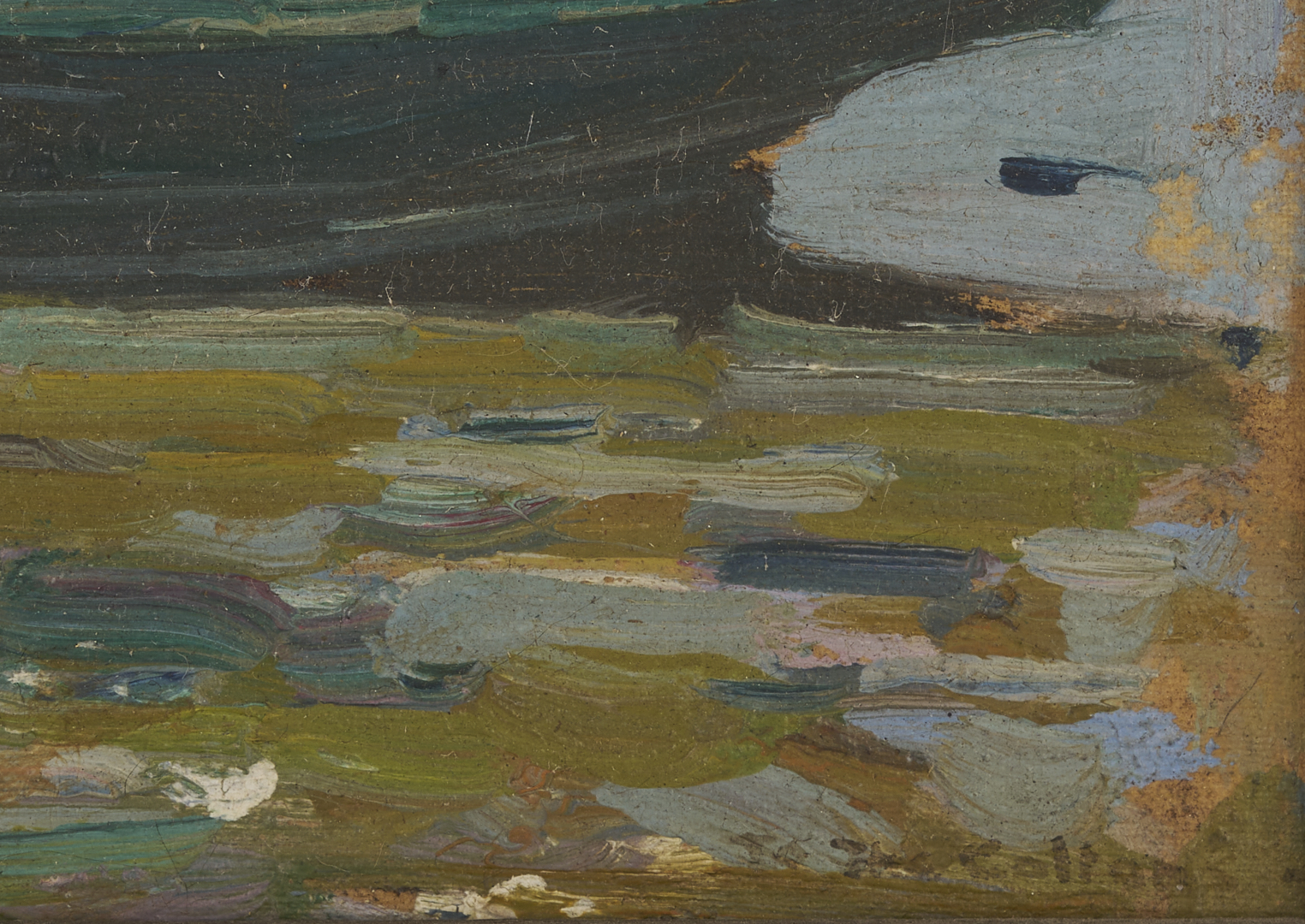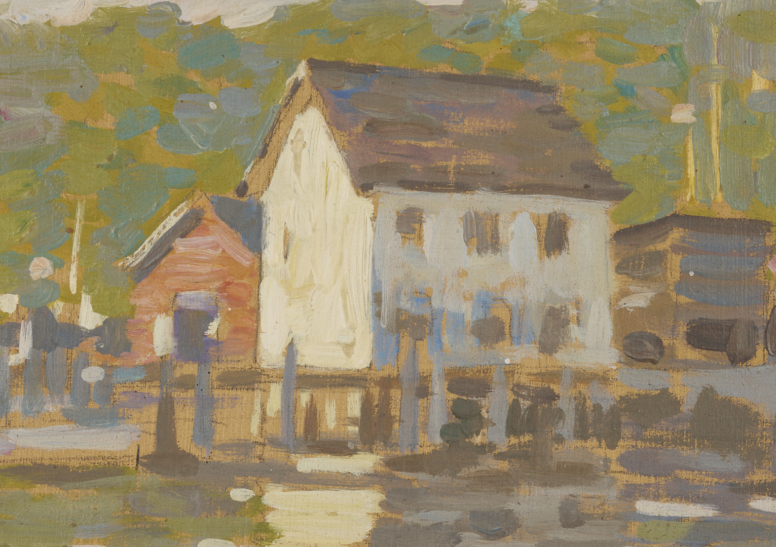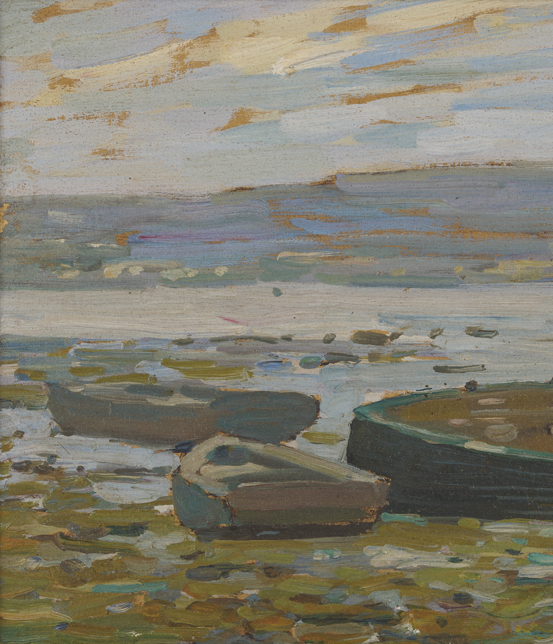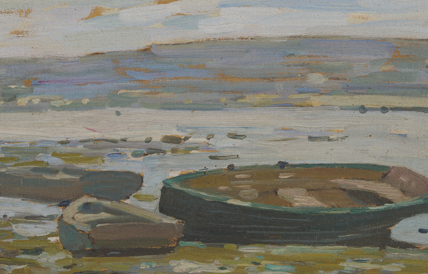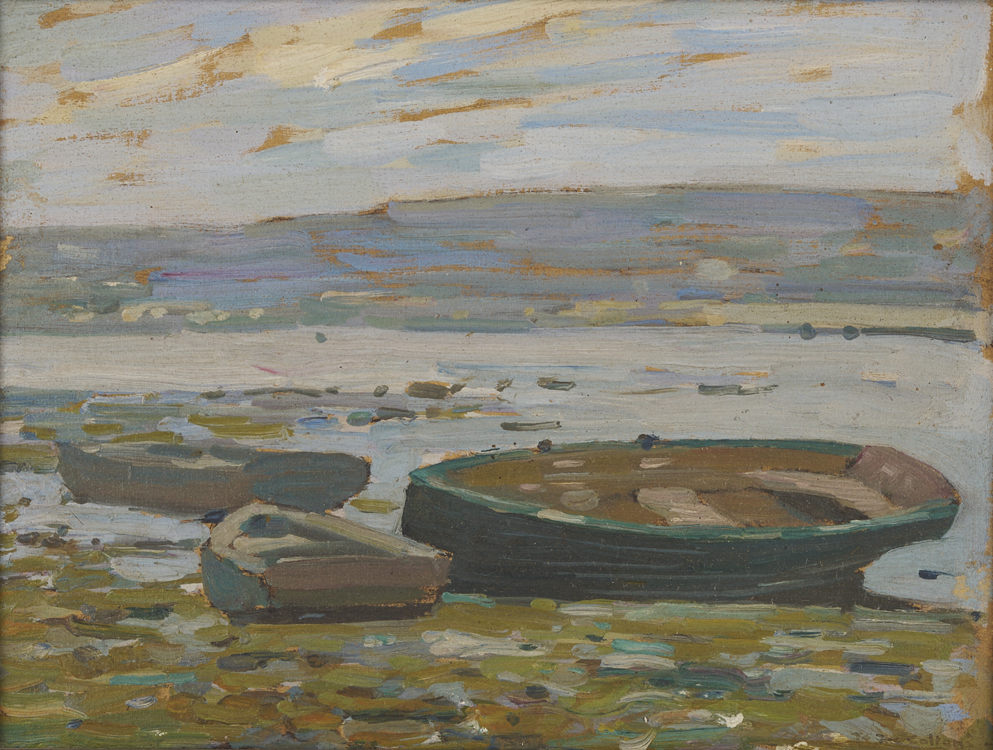 Roy Henry Brown (American, 1879-1956), two small oil on board impressionist landscape paintings in giltwood molded frames. 1st item: Painting of a white house and other buildings beside a pier, reflected in the water below. Signed lower right, “To The Squires from Roy Brown”. Sight: 7 1/2 in. H x 9 1/2 in. W. Frame: 13 1/2 in. H x 15 1/2 in. W. 2nd item: Painting depicting three rowboats beached along a coastline under a gray sky, with inscription lower right, “To the Coltons”. Unsigned. Sight: 7 in. H x 9 in. W. Frame: 13 in. H x 15 1/2 in. W.