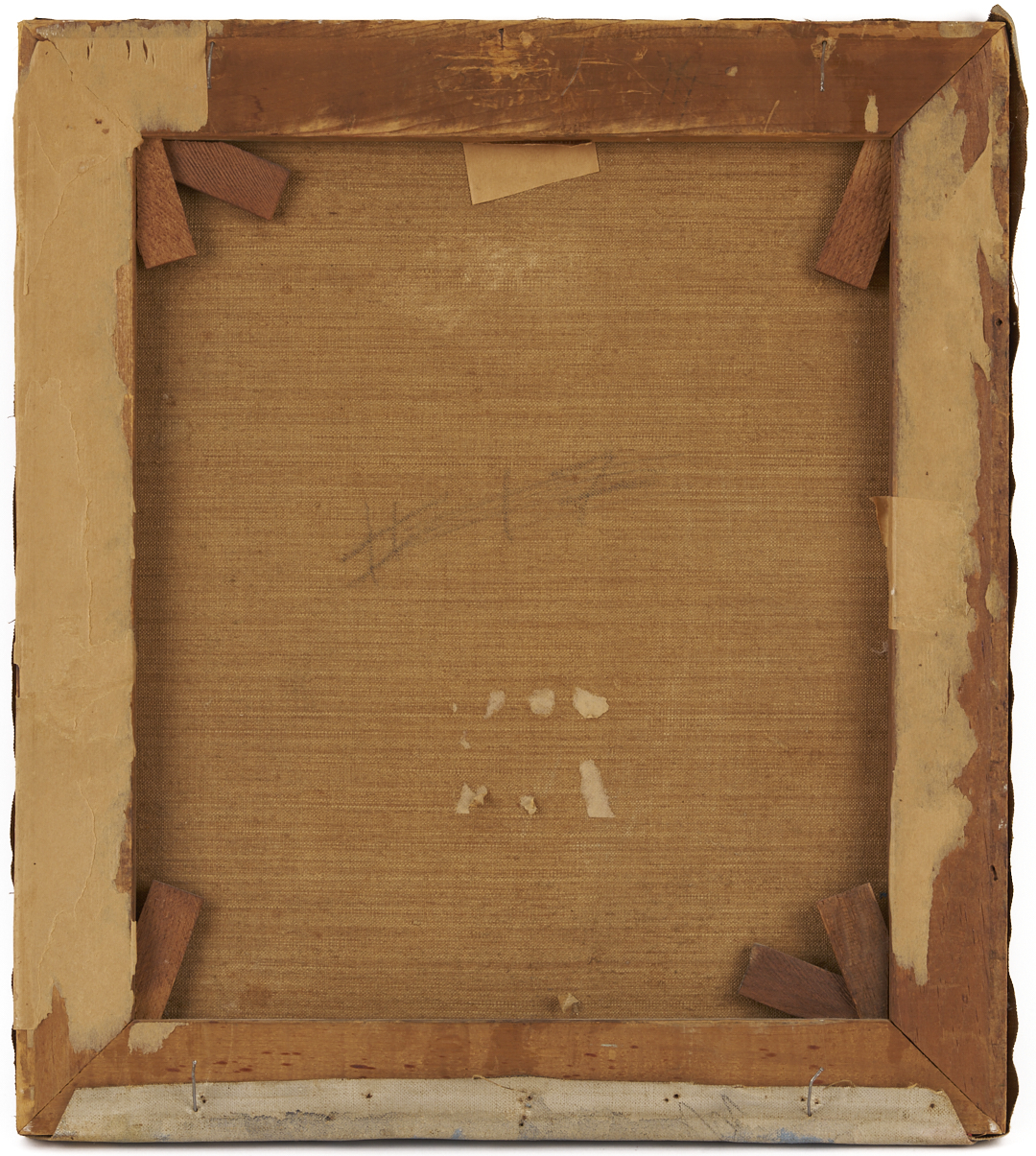 Overall good condition with some light grime; 1/2 in. dent to canvas at subject’s right shoulder; couple of scattered areas of buckling/creasing to canvas. Frame has some wear to painted surface and to corners.