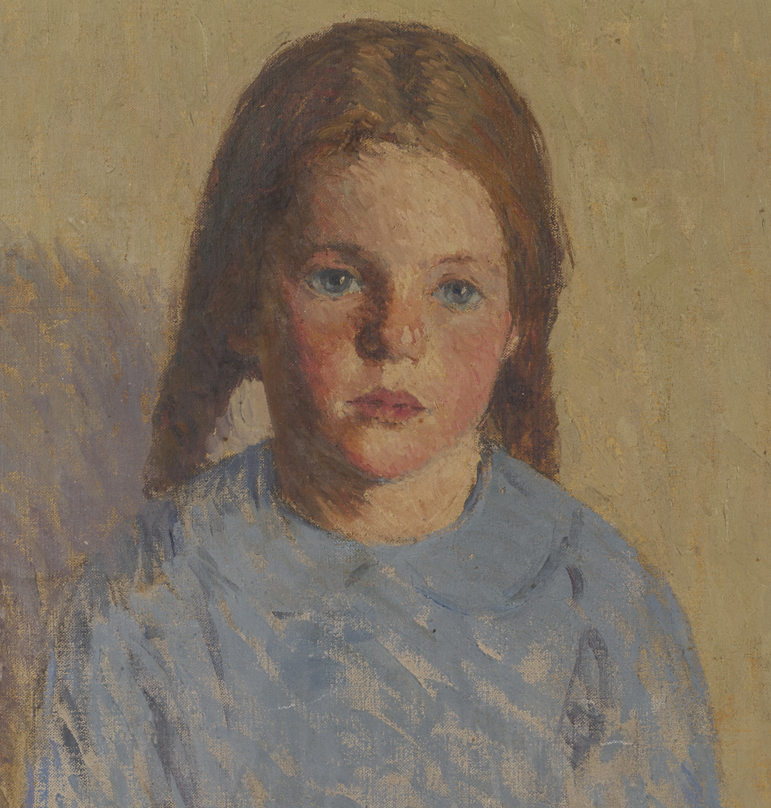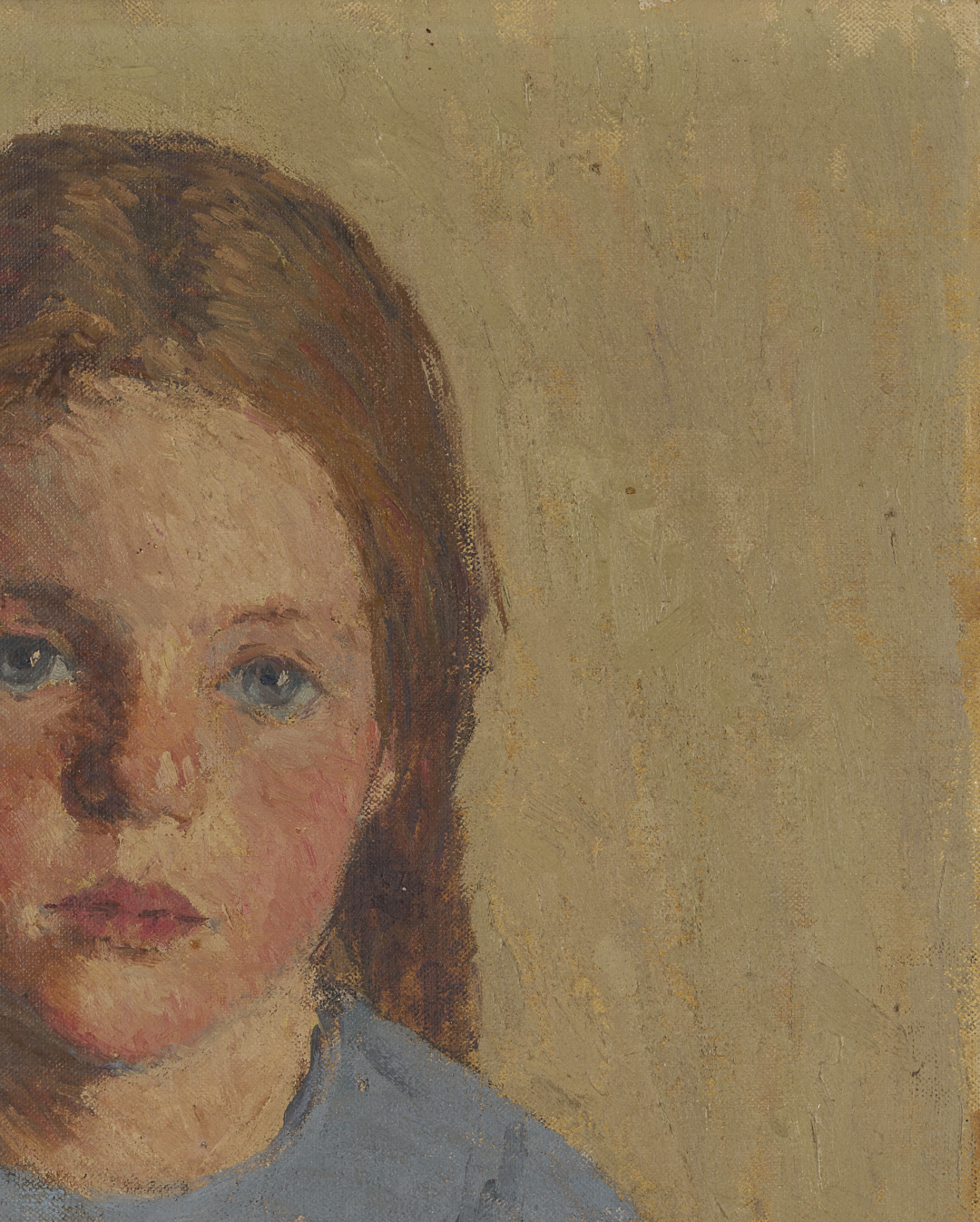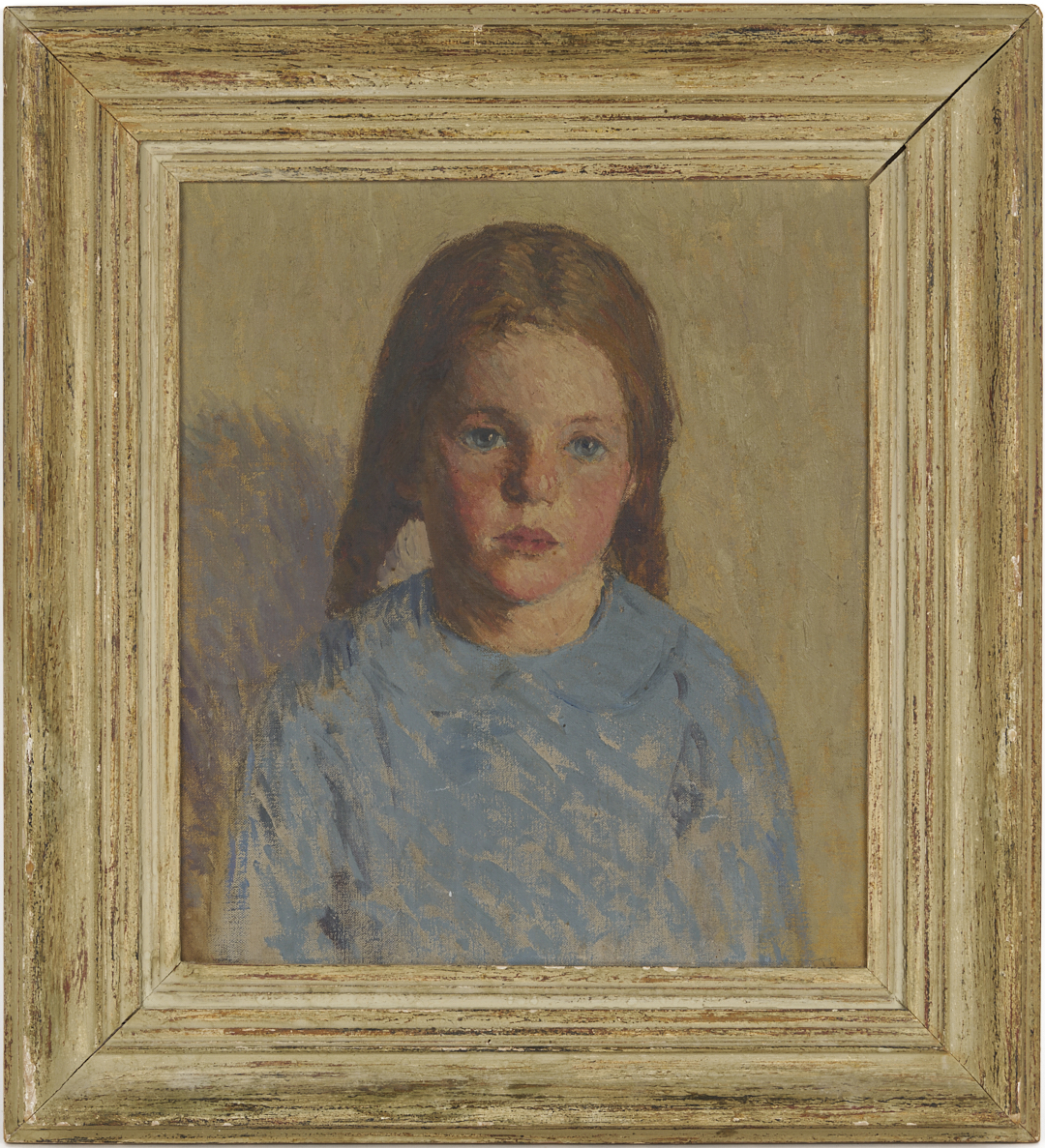 American School, circa 1920, oil on canvas portrait of Nancy Winslow Squire Hitch (b. 1913), at about age 9, wearing a blue dress with collar and her auburn hair in pigtails. Signed lower right with faint initials, possibly “J.P.” Whitewashed molded frame. Stretcher: 17 in. H x 15 in. W. Frame: 24 in. H x 22 in. W. Note: the subject was the daughter of Mr. and Mrs. Walter Squire. He was a noted Chicago-born music professor and art collector. Squire resided in France and Germany between 1908-1911 and, after his marriage, continued traveling between the two continents over the next decade, acquiring works by a variety of artists – including several he had befriended. The creator of this portrait of his daughter, however, remains unknown. Several other paintings from the Squire collection are also included in this auction.