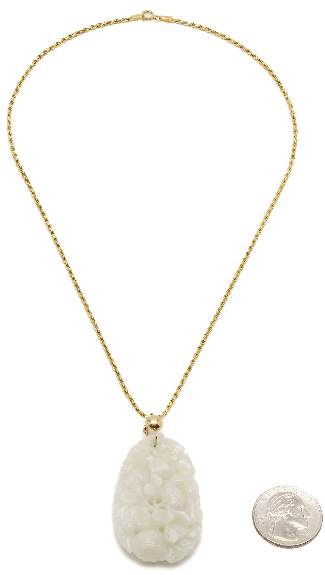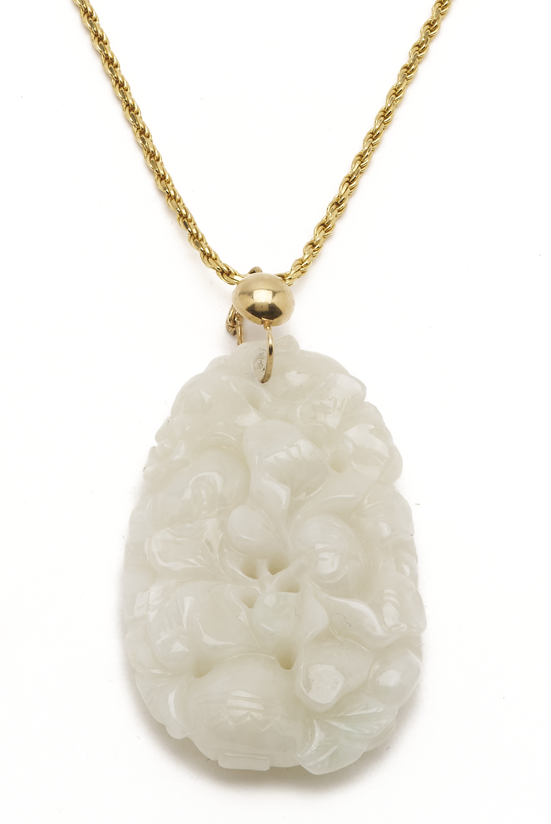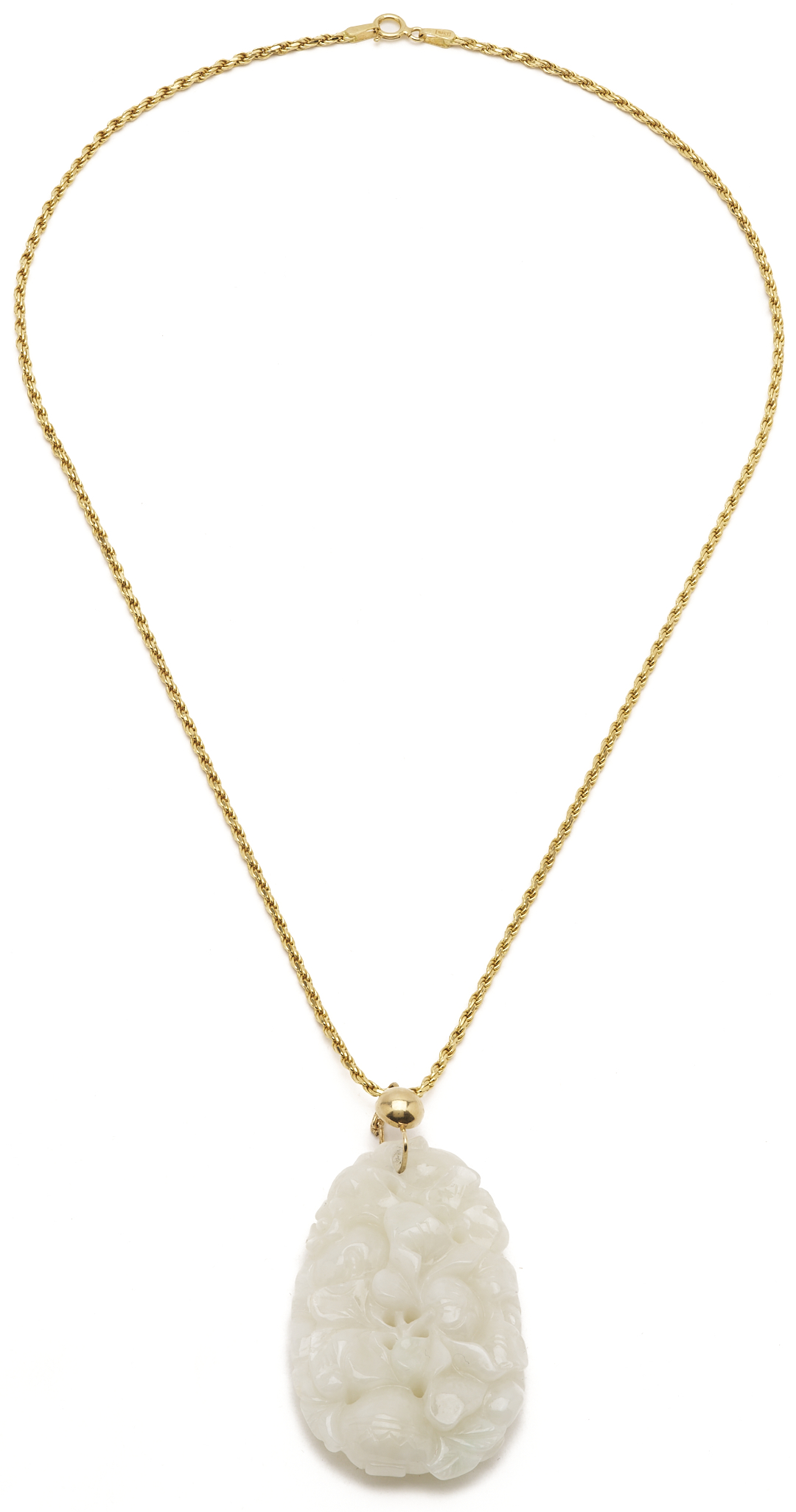 Ladies’ 18K yellow gold rope chain necklace with white jadeite jade pendant with 14K yellow gold bail. The necklace is marked “18KT 750 Italy” and XRF tests 18K gold while the bail of the pendant XRF tests 14K gold. The necklace is 19 in. L. and the pendant is 1 7/8 in. x 1 1/8 in. Weight of the necklace without the pendant is 7.49 grams.