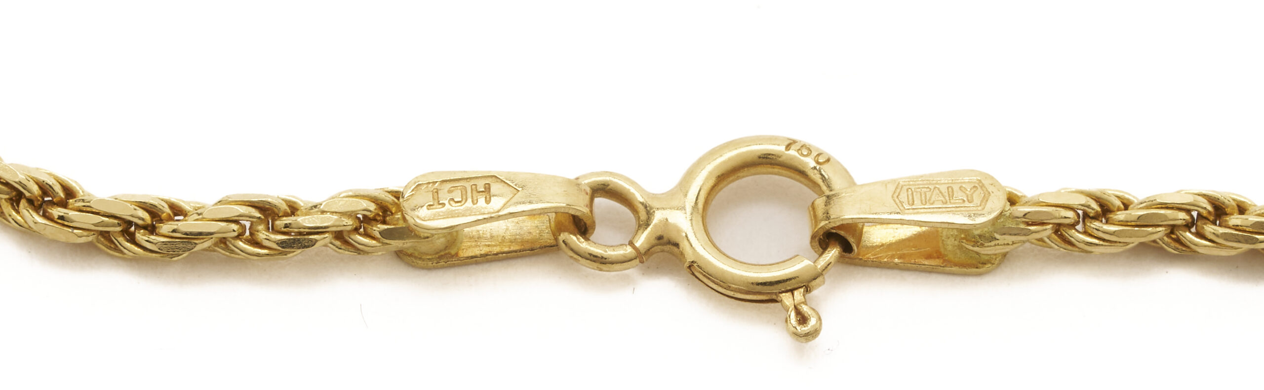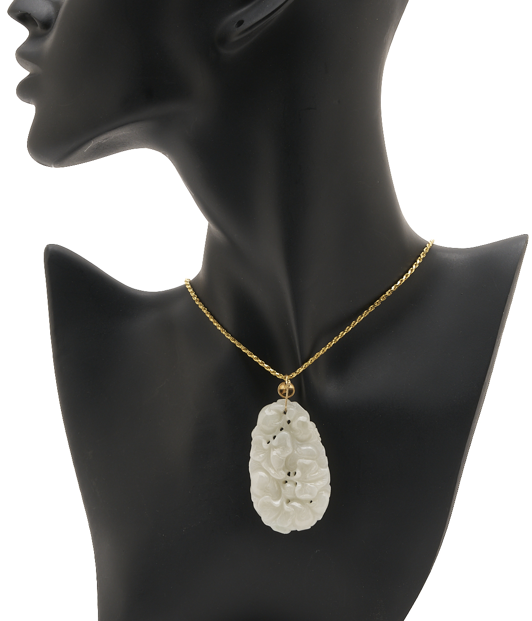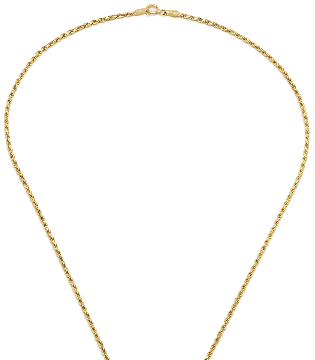 Ladies’ 18K yellow gold rope chain necklace with white jadeite jade pendant with 14K yellow gold bail. The necklace is marked “18KT 750 Italy” and XRF tests 18K gold while the bail of the pendant XRF tests 14K gold. The necklace is 19 in. L. and the pendant is 1 7/8 in. x 1 1/8 in. Weight of the necklace without the pendant is 7.49 grams.