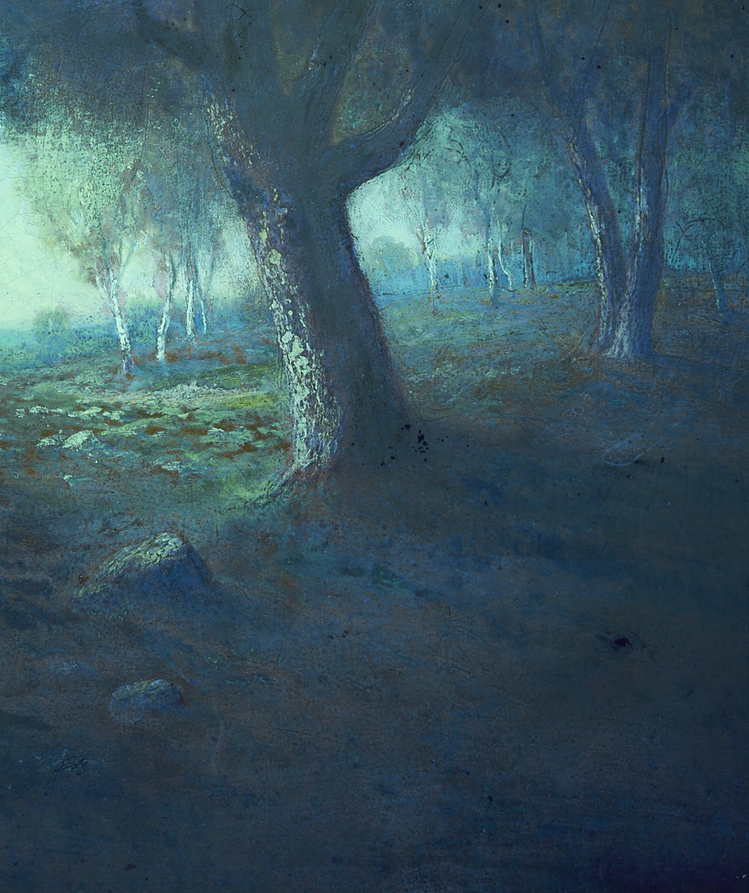CONDITION: Likely lined, with craquelure throughout. With scattered, minor retouching to lower third, largest 1/4 in. Area of overpaint fluoresces on tree trunk lower left quadrant. Losses to frame along edges, up to 2 1/2 in. L.