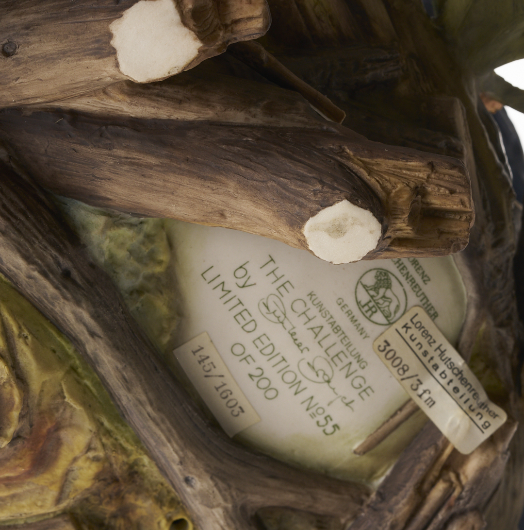 Large figural porcelain sculpture designed by the German artist Gunther Granget for Lorenz Hutschenreuther, titled “The Challenge”, depicting a pair of great blue herons in a nest. The male is modeled with outstretched wings in a protective posture, guarding a single egg in the nest. Numbered 55/200 and signed E. Zapf ’72 (1972) on base. Fitted with a round black wood stand. Sculpture: 20 1/2 in. H x approx. 18 in. W. Stand measures 3 1/2 in. H x 12 in. dia.
