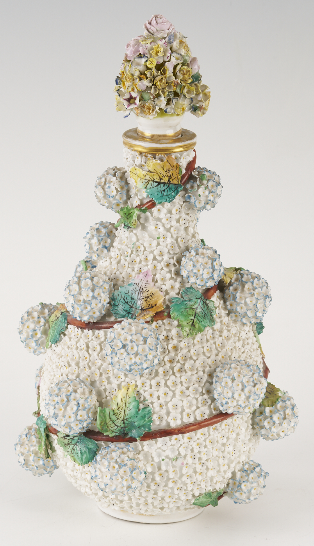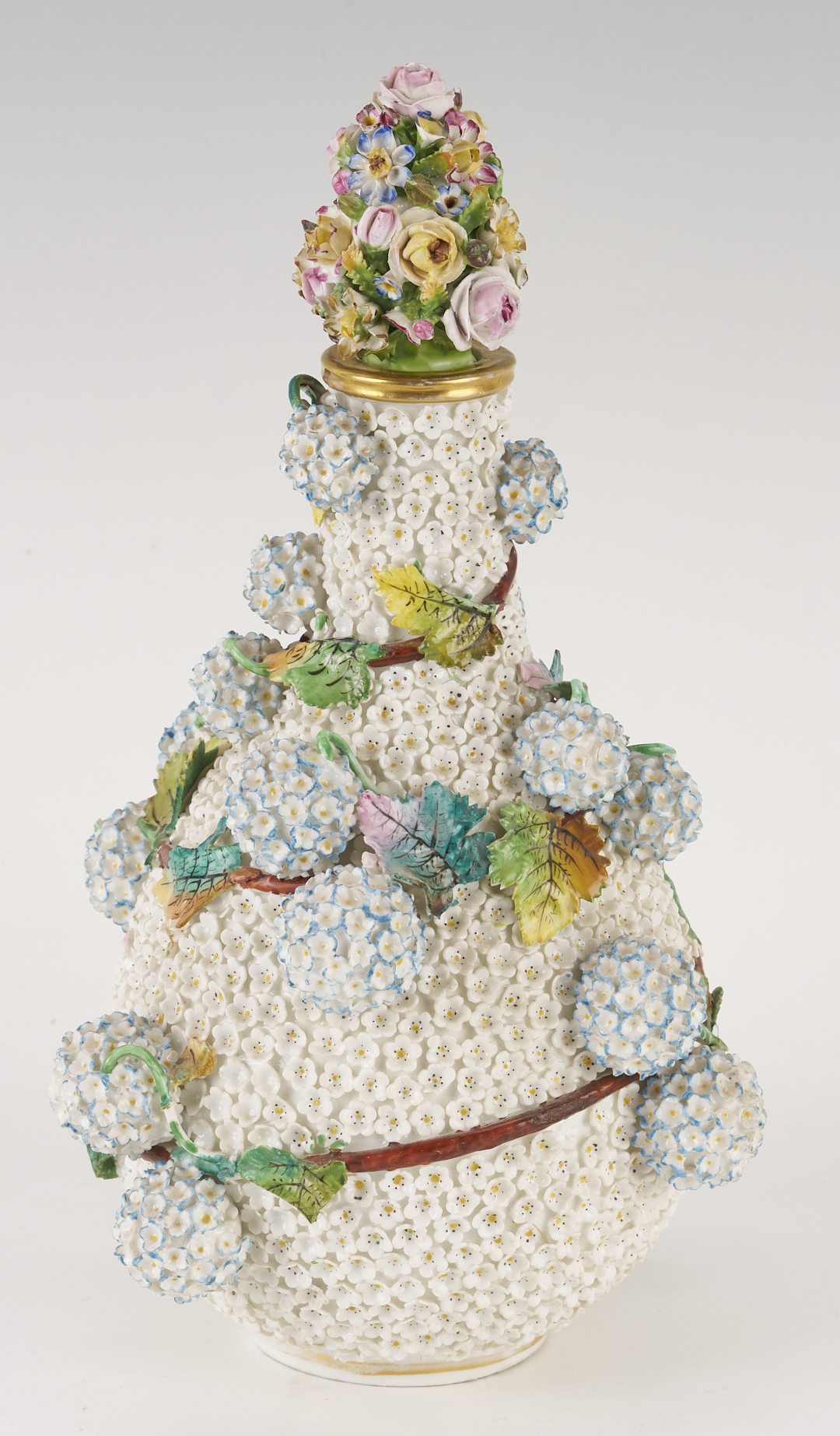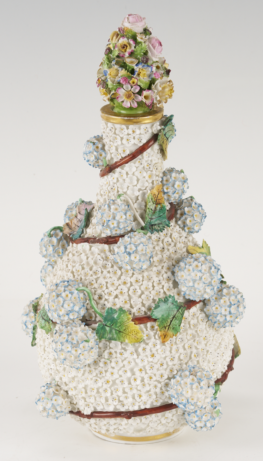 Pair of Meissen or Meissen Style porcelain “Schneeballen” (Snowball) bottle vases, covered with molded porcelain floral blossoms and enhanced with applied spiraling vines, leaves, and floral clusters, with fitted tops covered in ornate, multicolored flowers. Overglaze blue crossed swords mark to the undersides. 12 1/2 in. H x 6 1/2 in. W, with stoppers. German, late 19th to early 20th century.