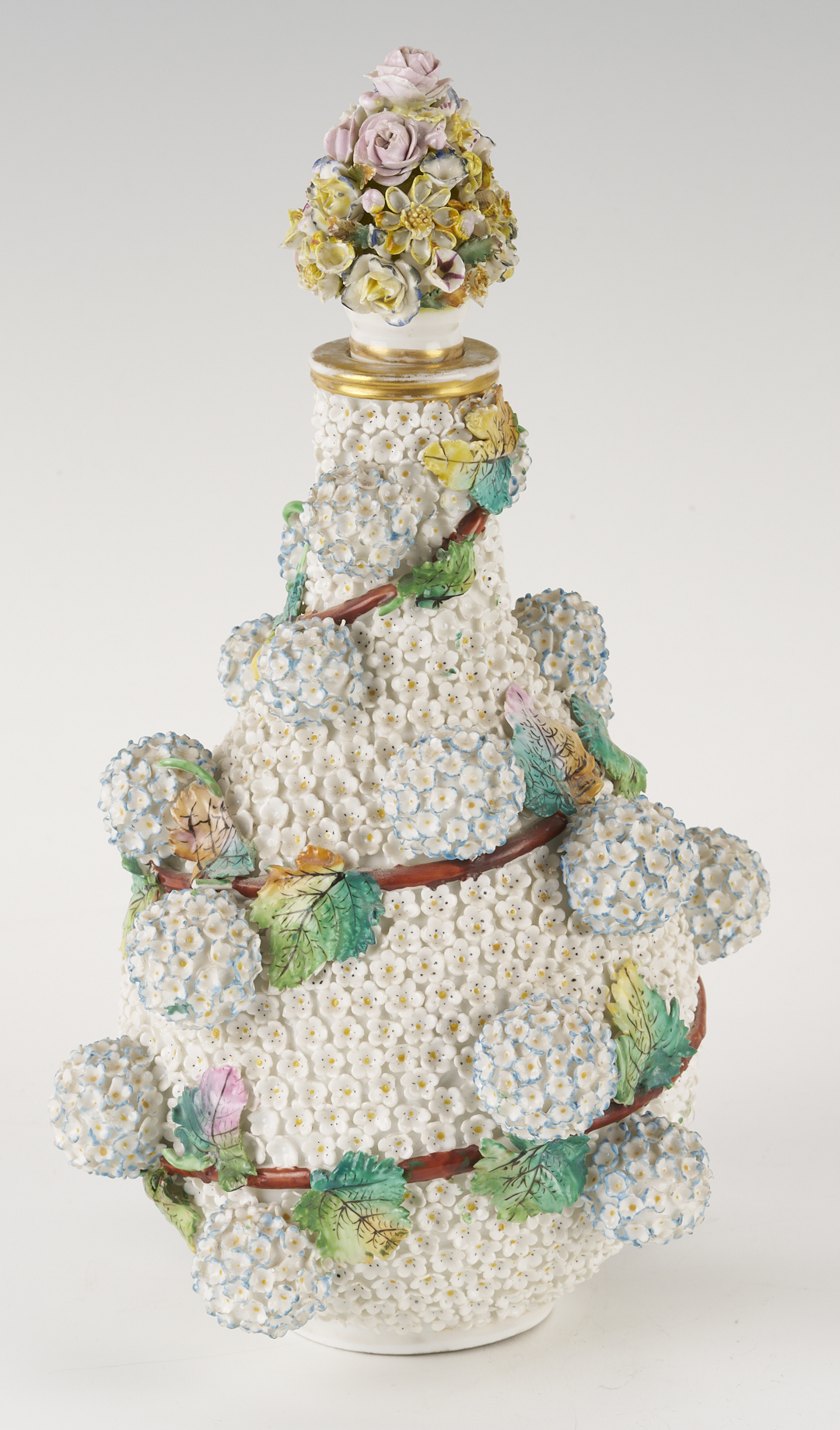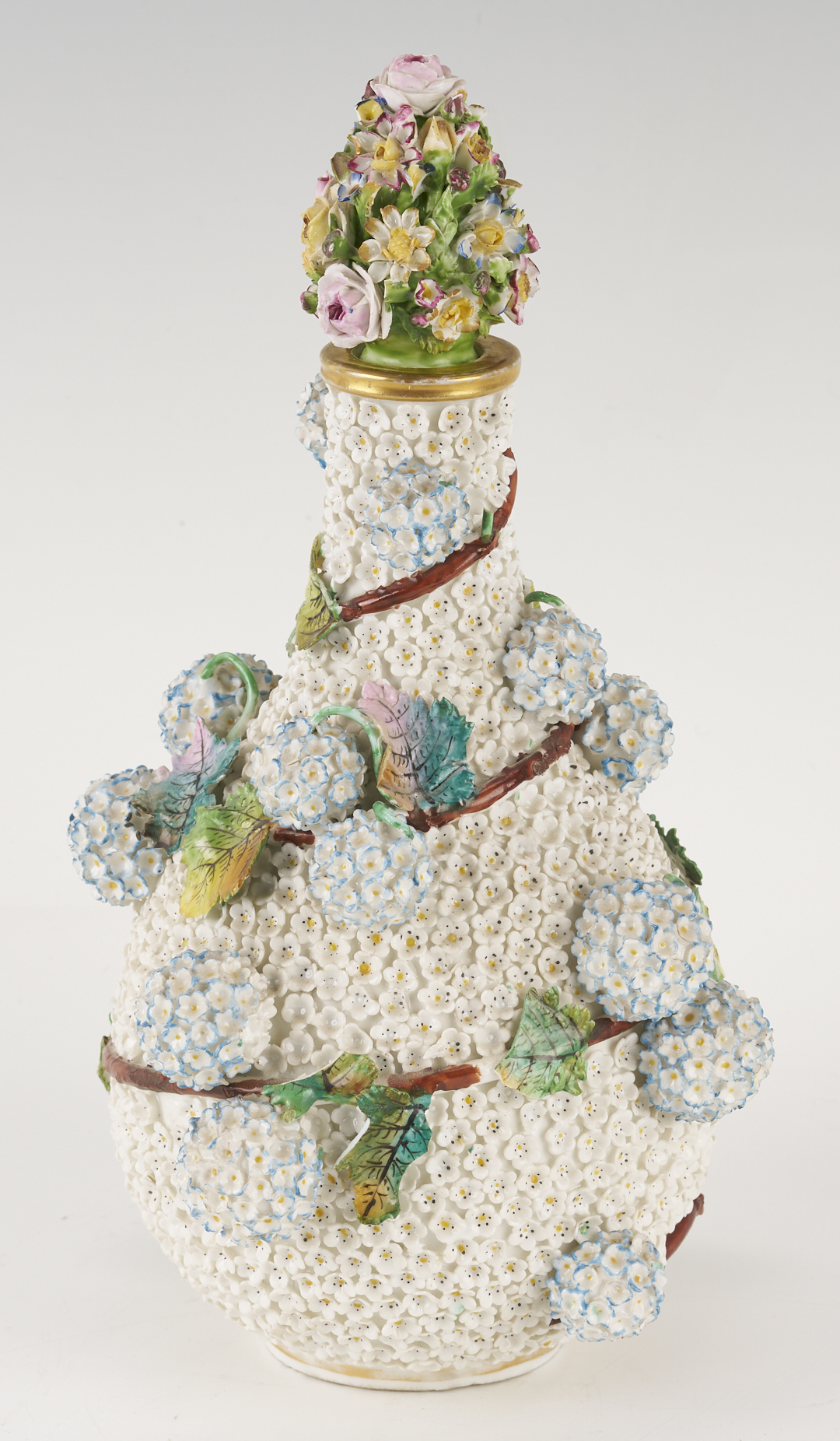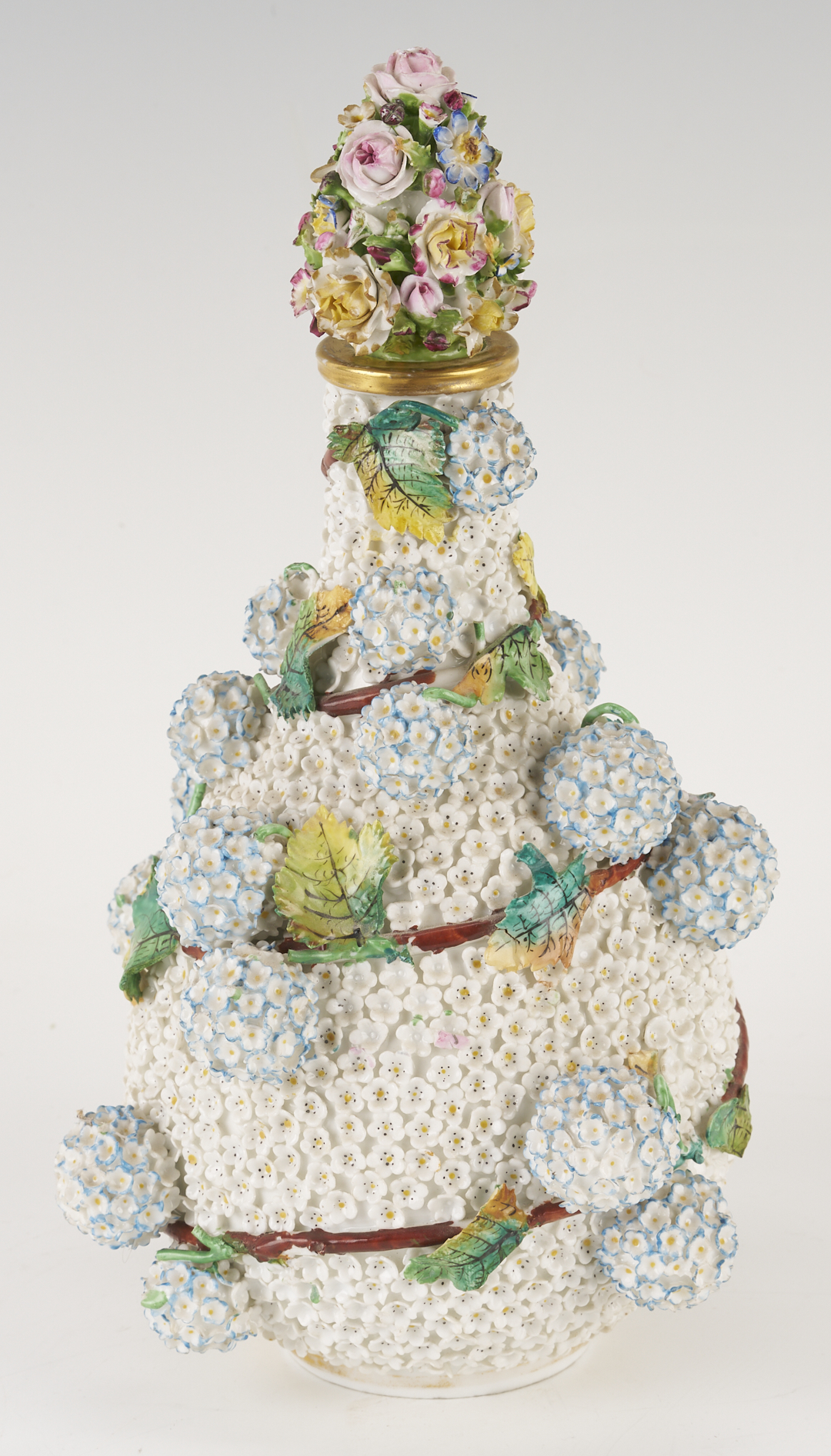Pair of Meissen or Meissen Style porcelain “Schneeballen” (Snowball) bottle vases, covered with molded porcelain floral blossoms and enhanced with applied spiraling vines, leaves, and floral clusters, with fitted tops covered in ornate, multicolored flowers. Overglaze blue crossed swords mark to the undersides. 12 1/2 in. H x 6 1/2 in. W, with stoppers. German, late 19th to early 20th century.