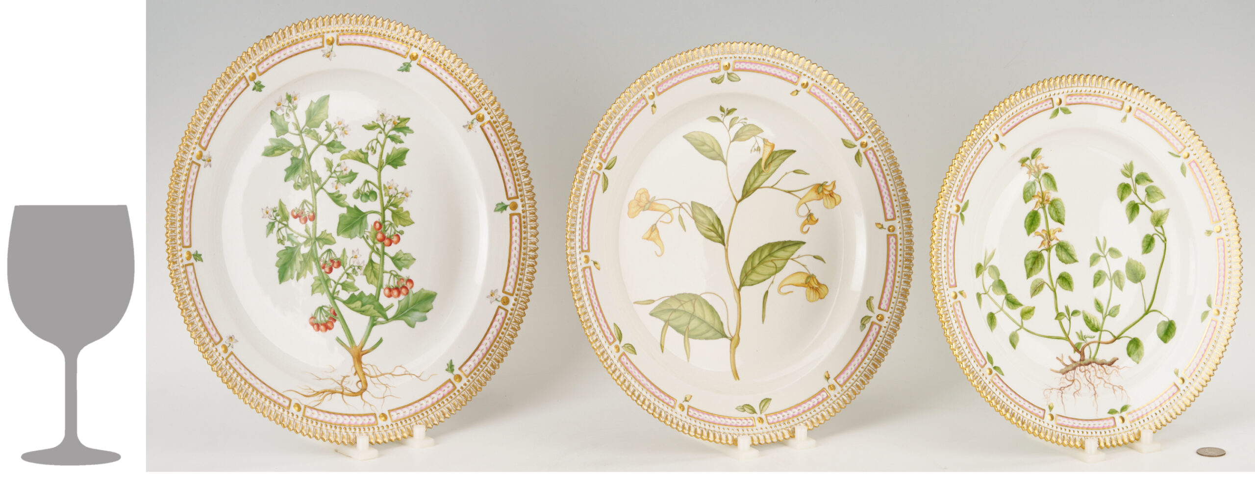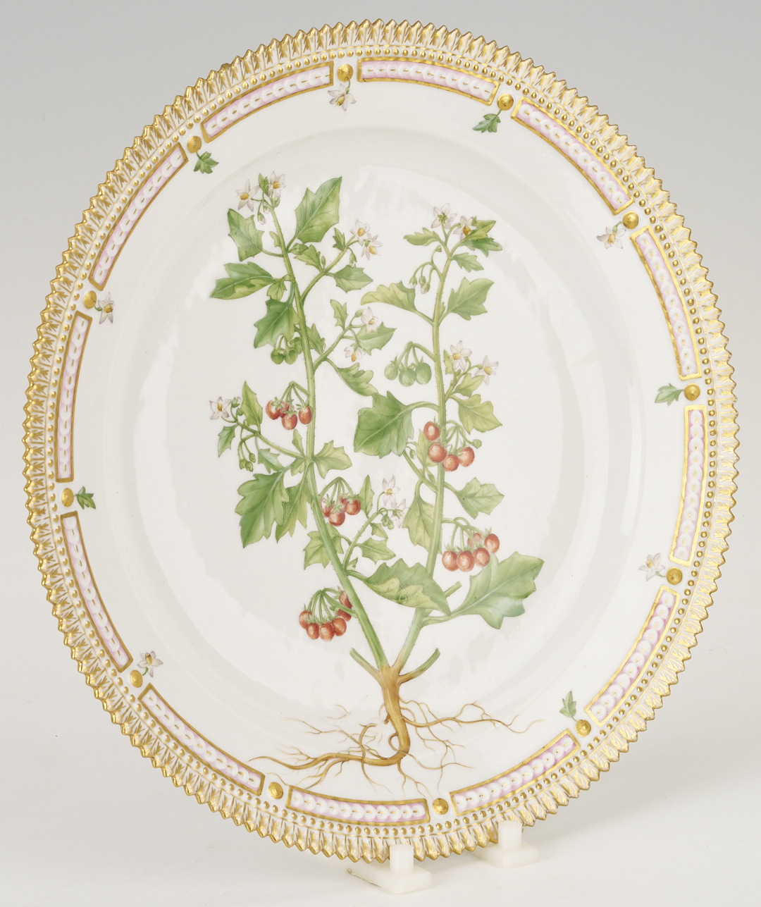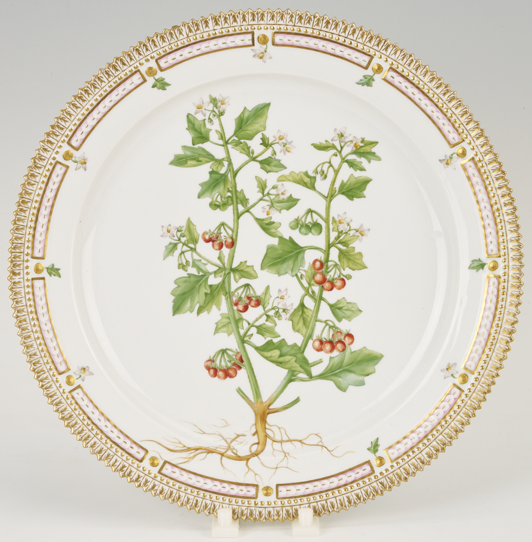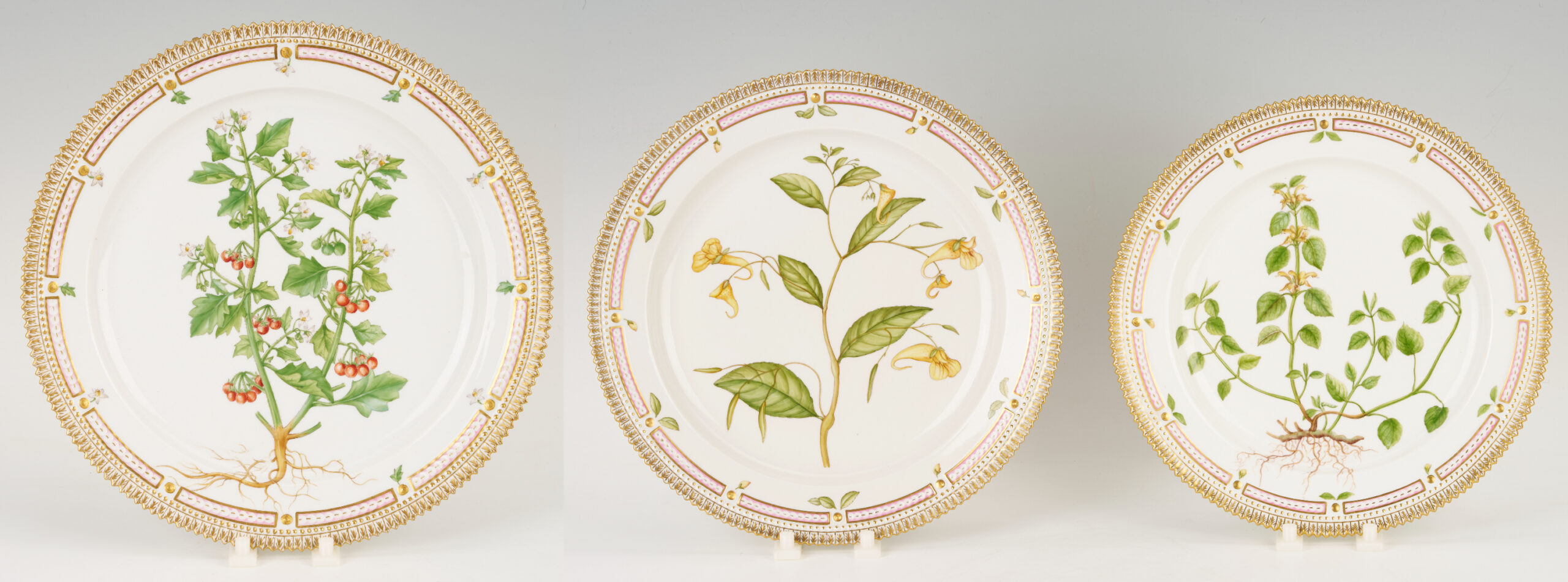 Assortment of three (3) Royal Copenhagen Flora Danica serving platters, each with a gilt-rimmed edge and marked on the underside with the Latin botanical name. One (1) round platter (14 in. dia.) marked “Solanum miniatum Bernh.”; one (1) round platter (13 1/4 in. dia.) marked “Impatiens Noli tangere L.”; and one (1) round platter (12 1/4 in. dia.) marked “Galeobdolon luteum Huds.” All are marked on the underside “Royal Copenhagen Denmark.”