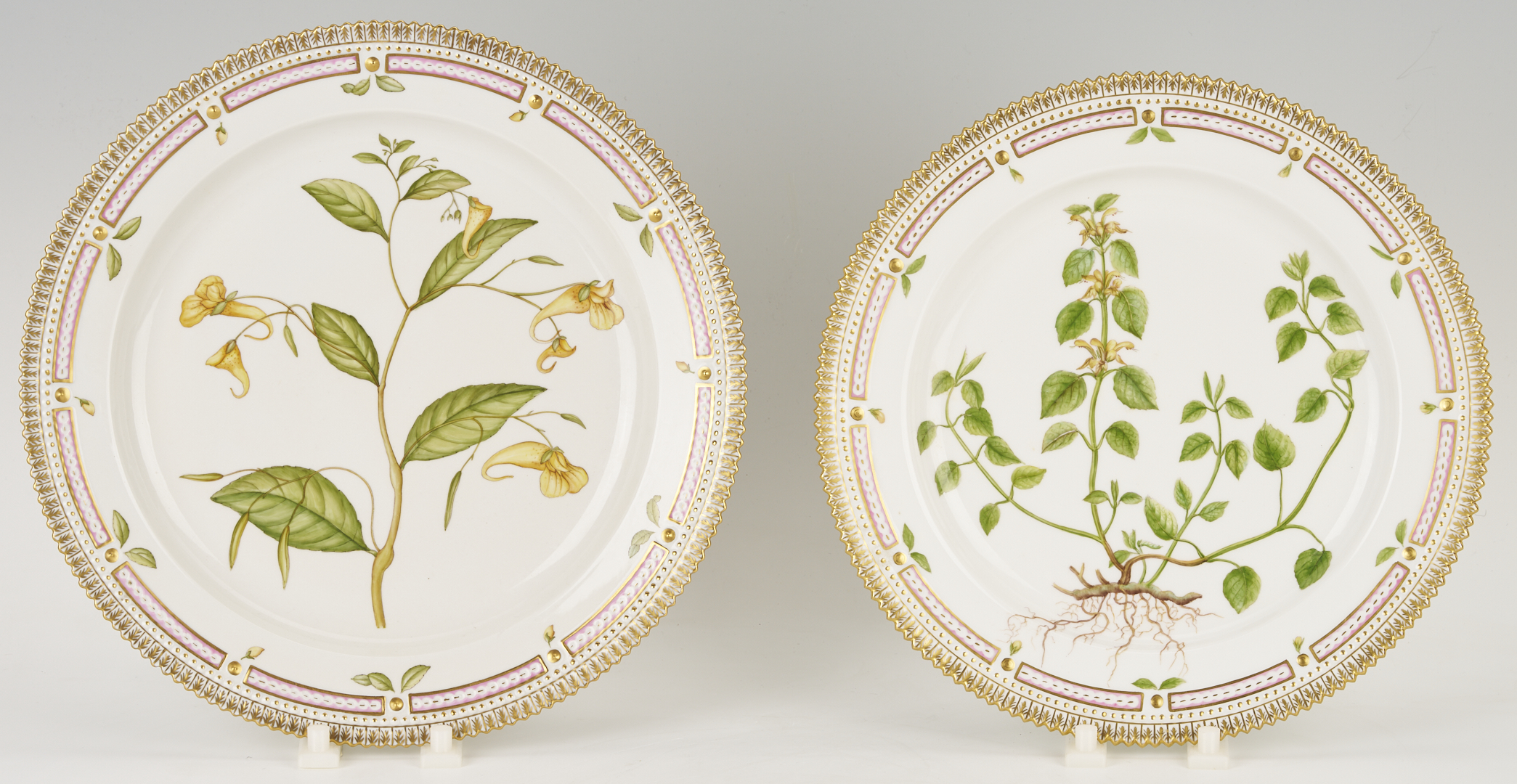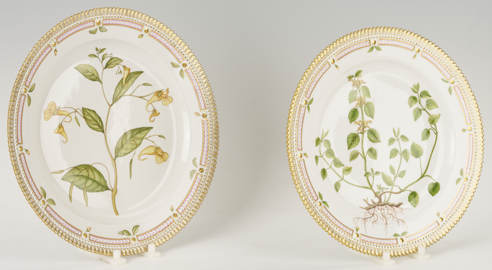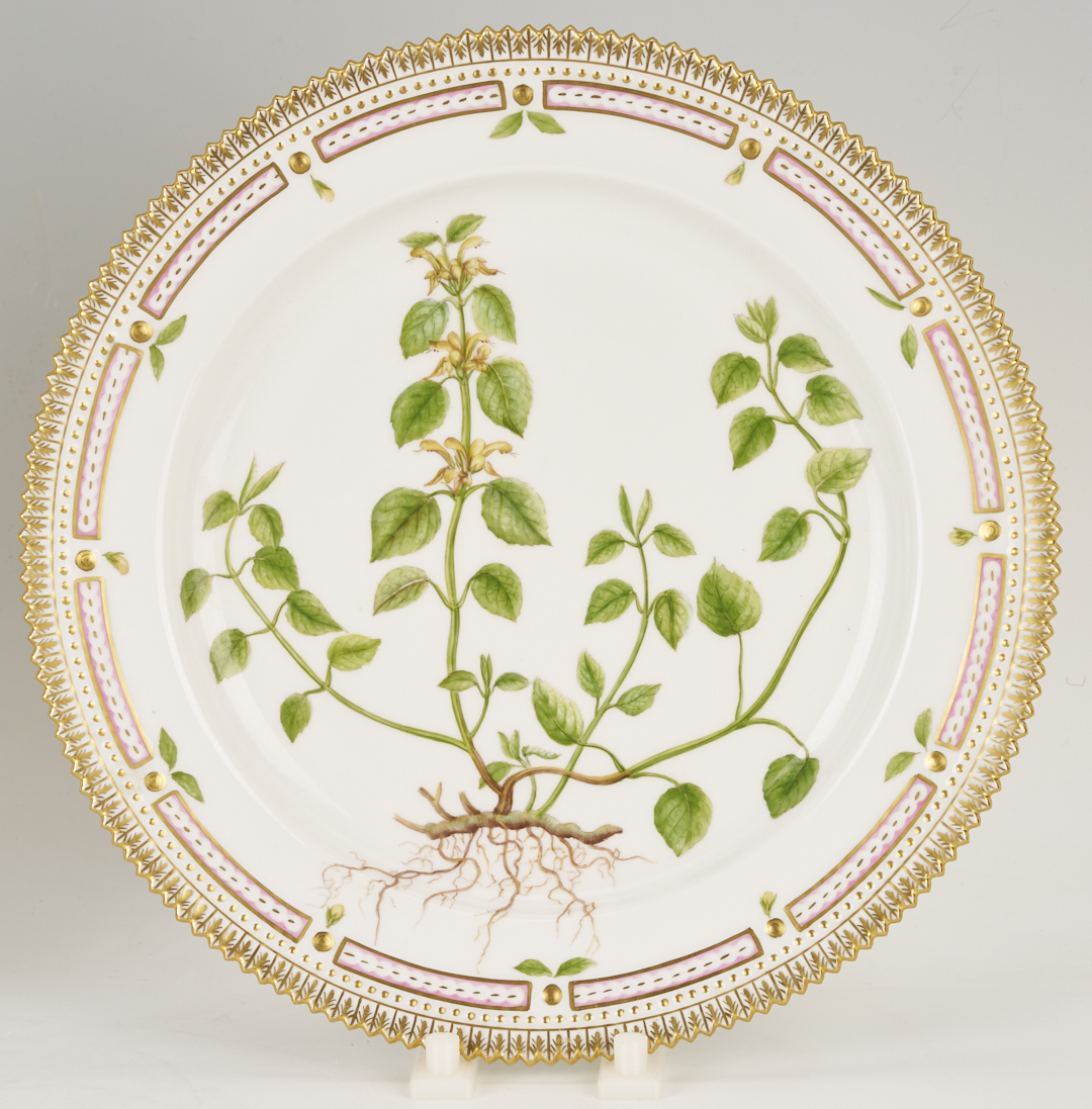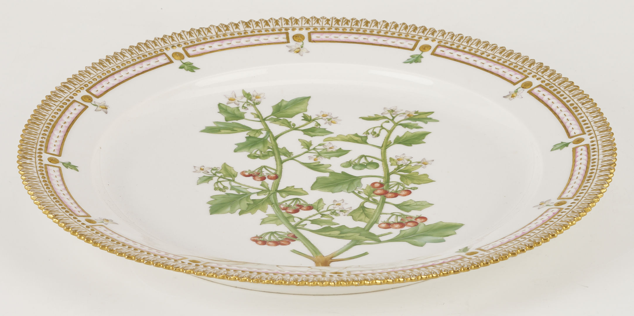 Assortment of three (3) Royal Copenhagen Flora Danica serving platters, each with a gilt-rimmed edge and marked on the underside with the Latin botanical name. One (1) round platter (14 in. dia.) marked “Solanum miniatum Bernh.”; one (1) round platter (13 1/4 in. dia.) marked “Impatiens Noli tangere L.”; and one (1) round platter (12 1/4 in. dia.) marked “Galeobdolon luteum Huds.” All are marked on the underside “Royal Copenhagen Denmark.”
