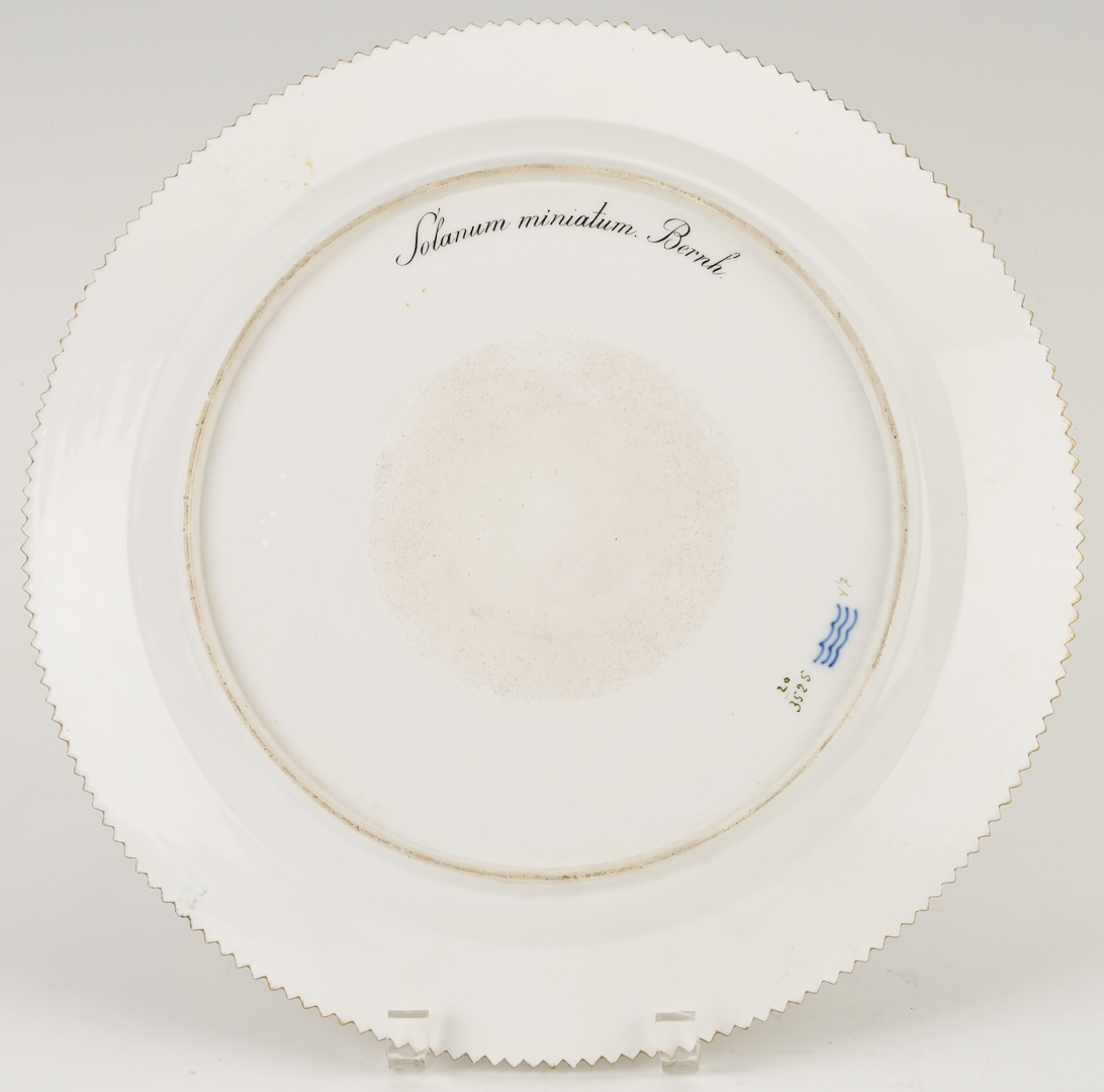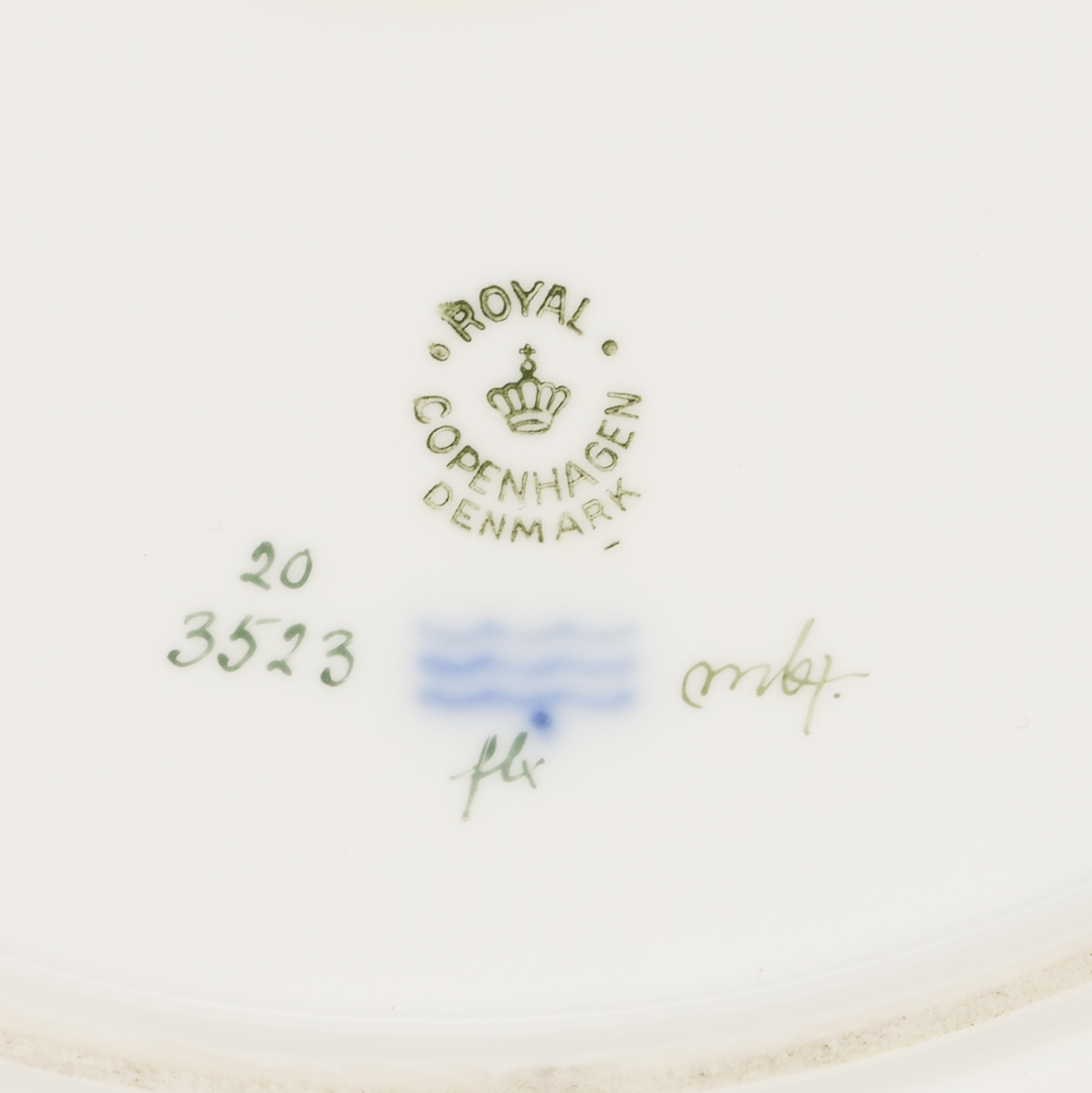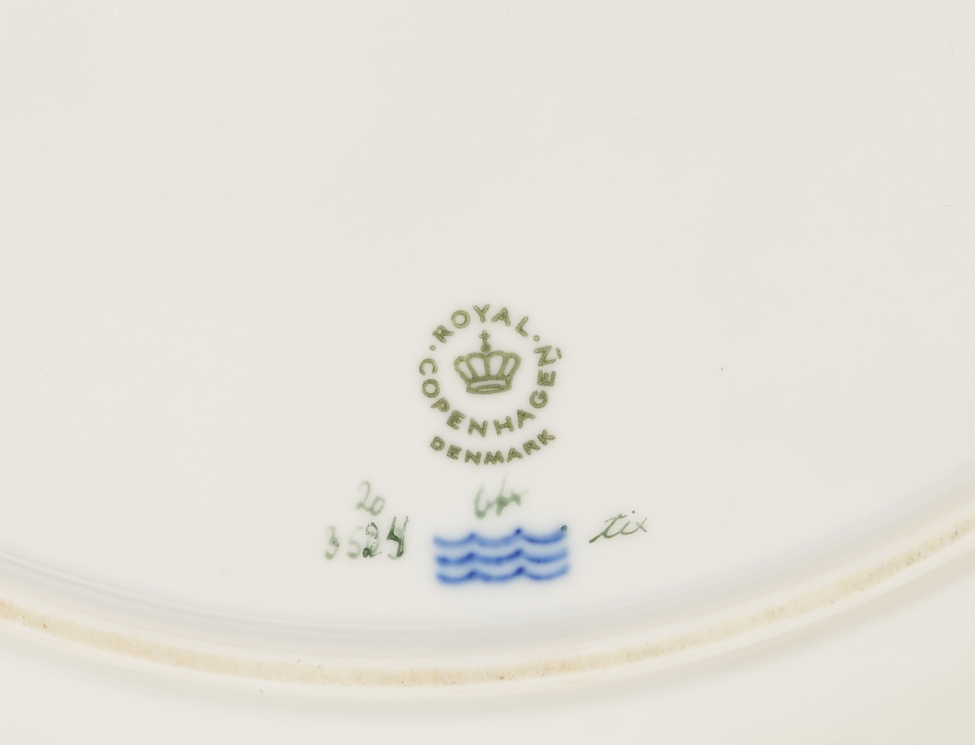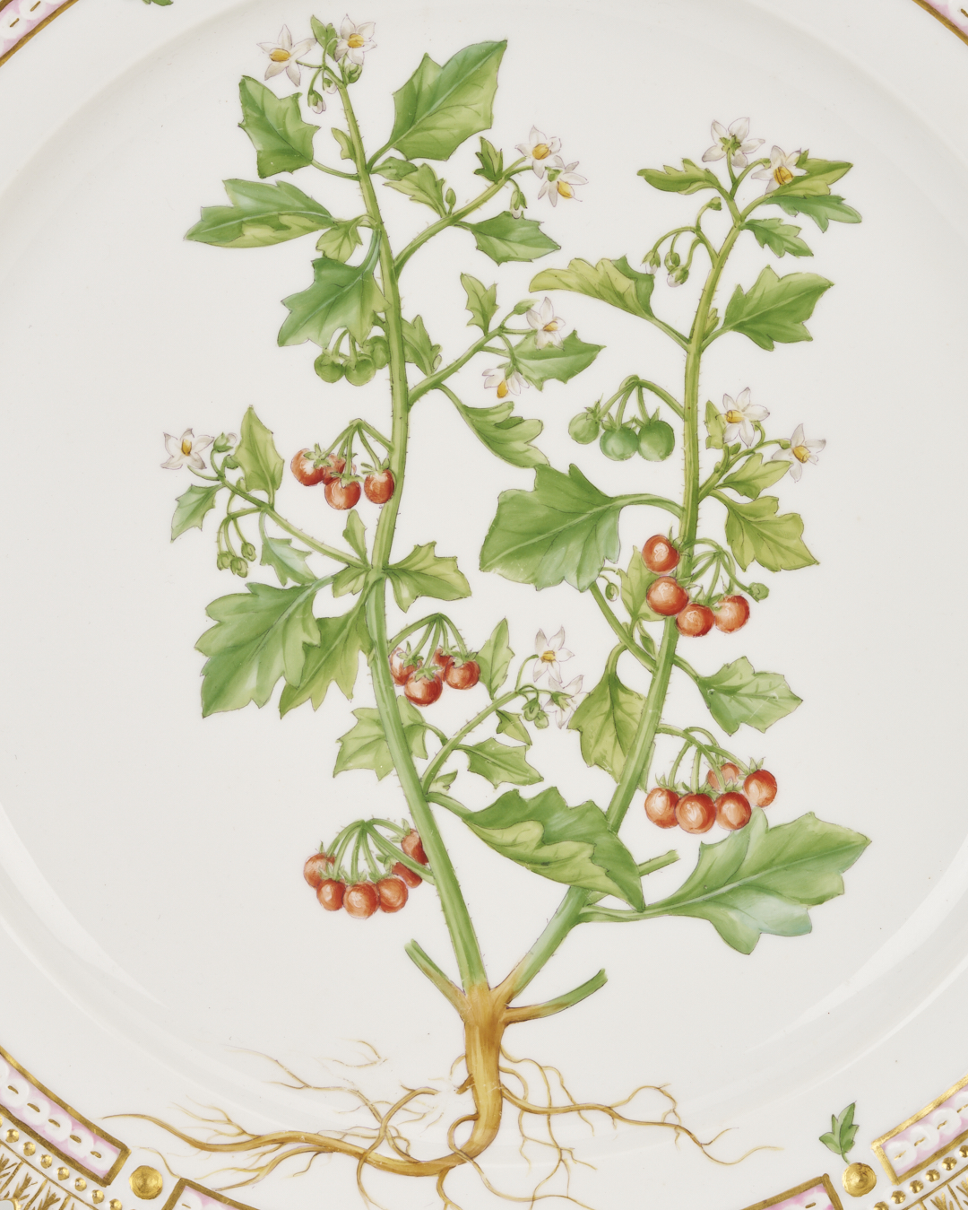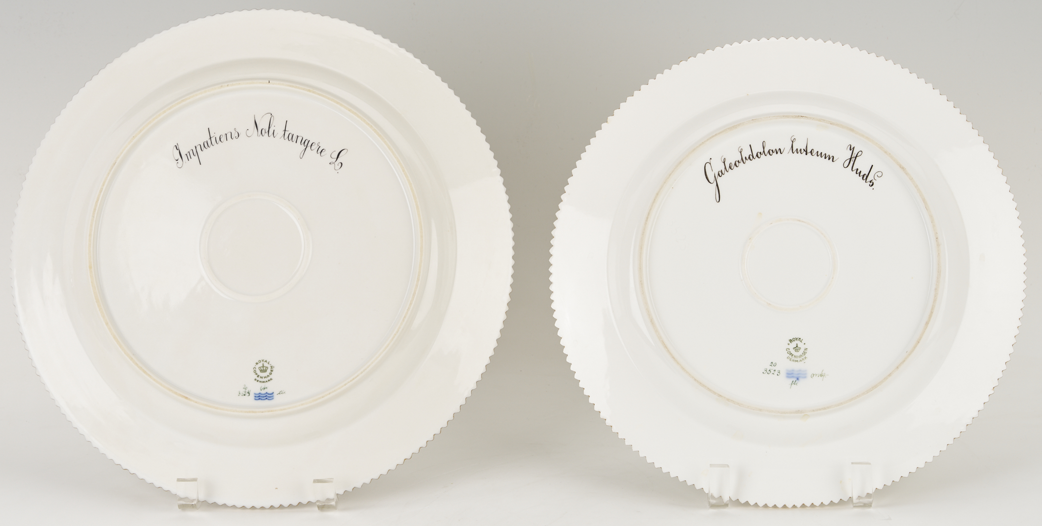 Assortment of three (3) Royal Copenhagen Flora Danica serving platters, each with a gilt-rimmed edge and marked on the underside with the Latin botanical name. One (1) round platter (14 in. dia.) marked “Solanum miniatum Bernh.”; one (1) round platter (13 1/4 in. dia.) marked “Impatiens Noli tangere L.”; and one (1) round platter (12 1/4 in. dia.) marked “Galeobdolon luteum Huds.” All are marked on the underside “Royal Copenhagen Denmark.”