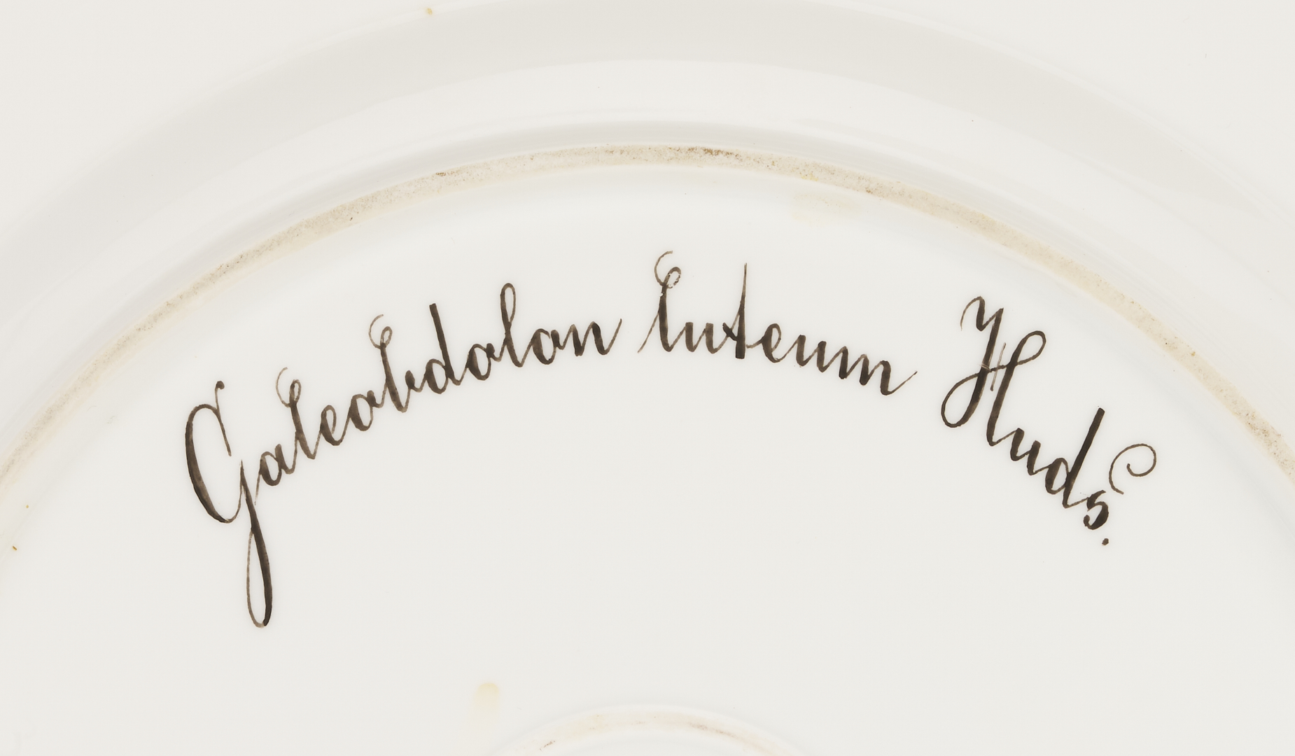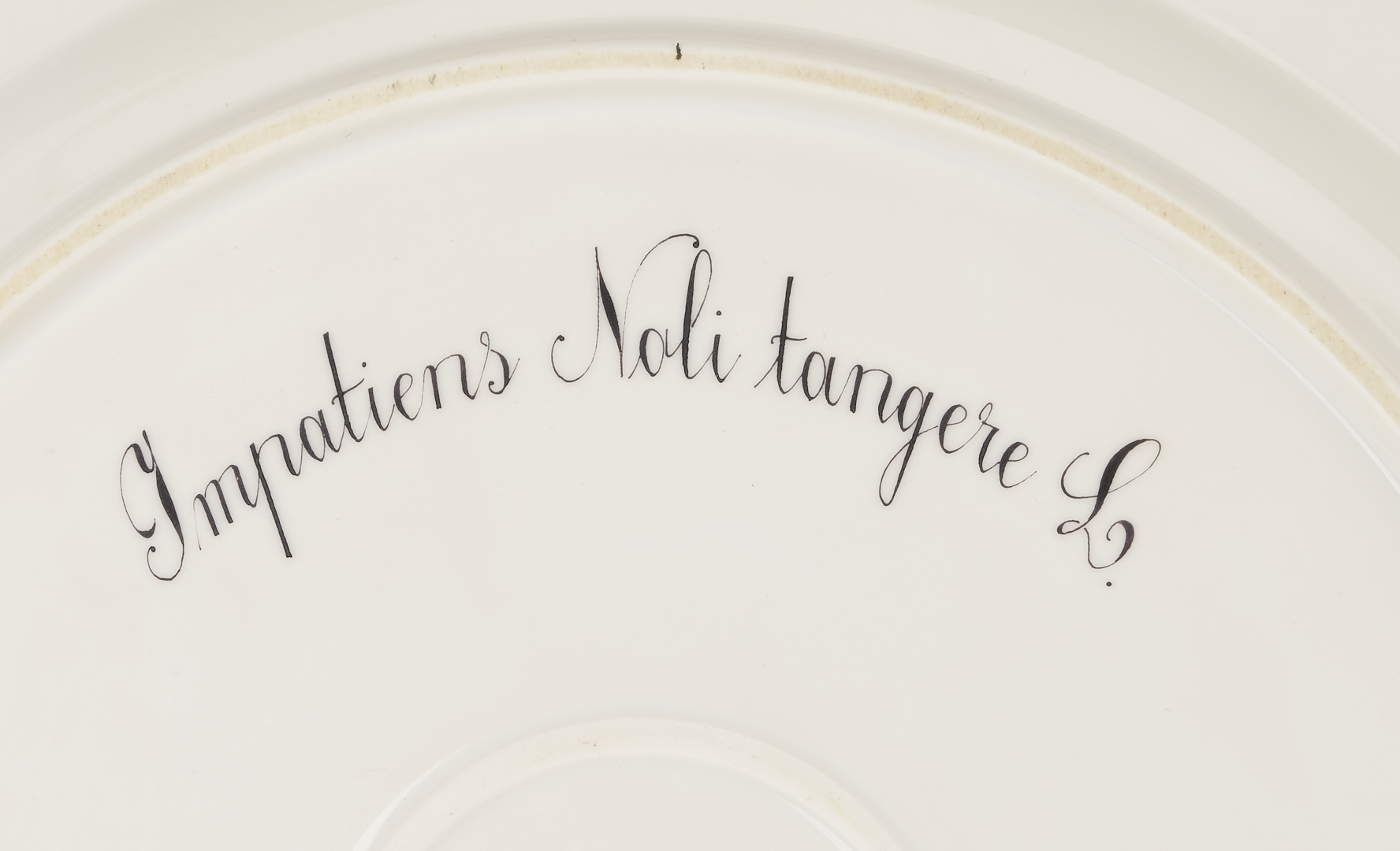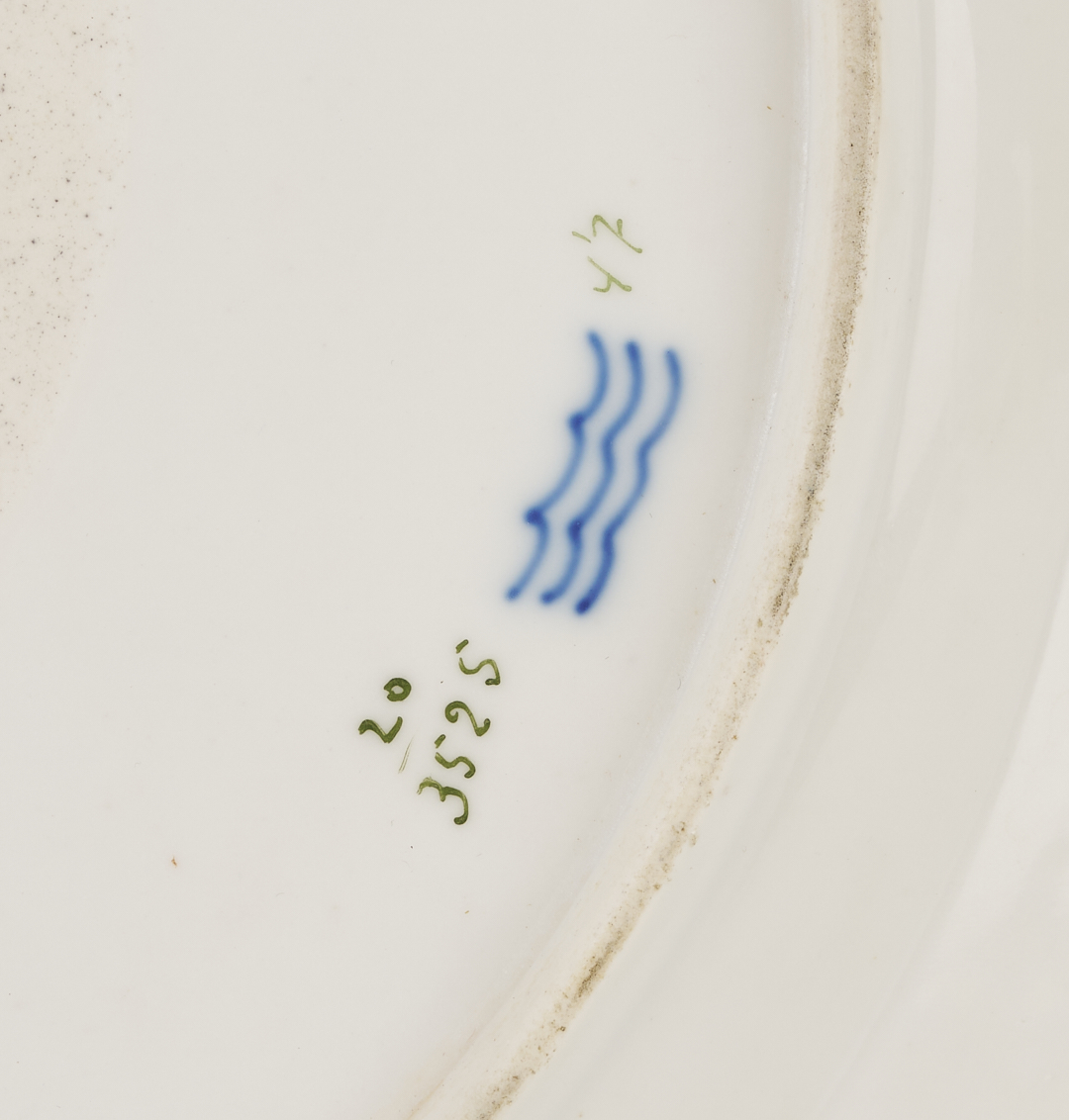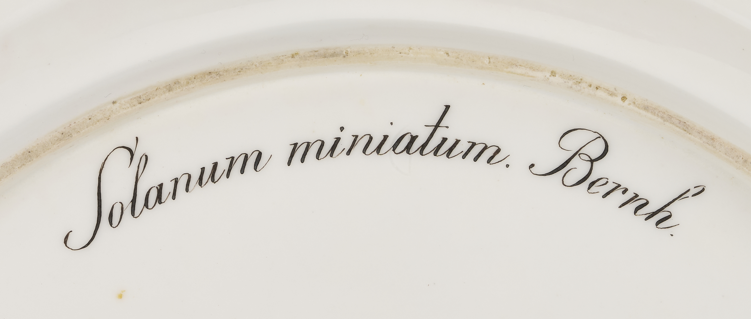 Assortment of three (3) Royal Copenhagen Flora Danica serving platters, each with a gilt-rimmed edge and marked on the underside with the Latin botanical name. One (1) round platter (14 in. dia.) marked “Solanum miniatum Bernh.”; one (1) round platter (13 1/4 in. dia.) marked “Impatiens Noli tangere L.”; and one (1) round platter (12 1/4 in. dia.) marked “Galeobdolon luteum Huds.” All are marked on the underside “Royal Copenhagen Denmark.”