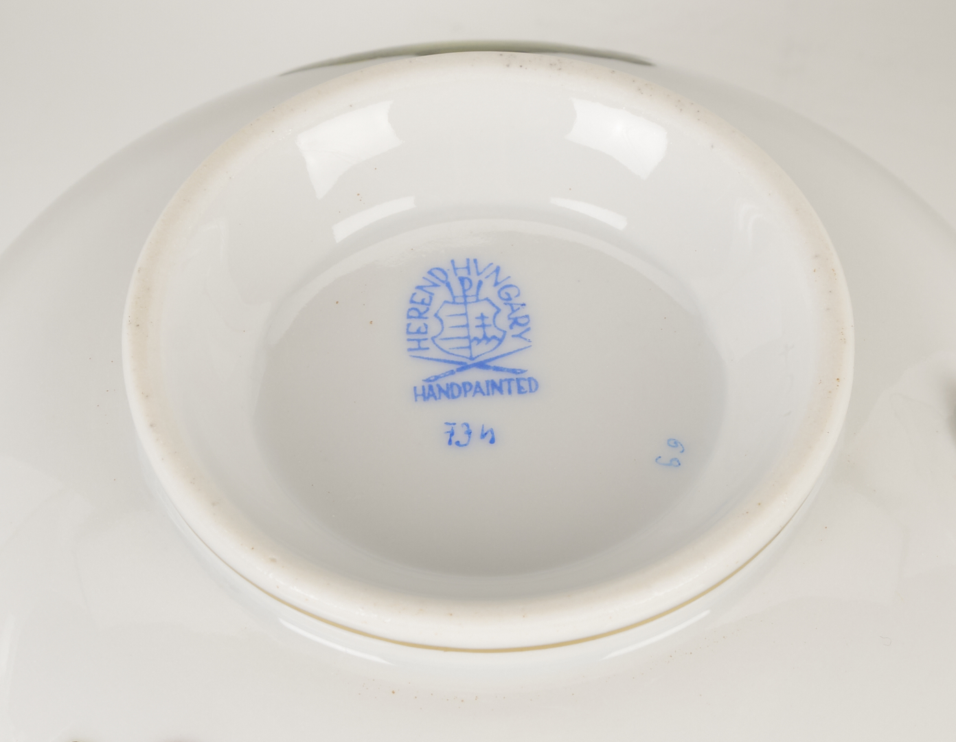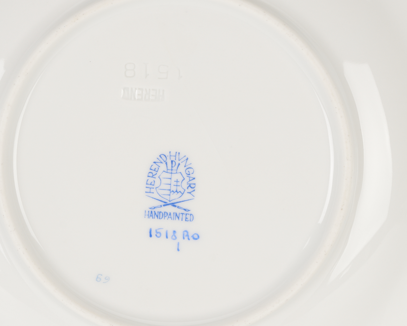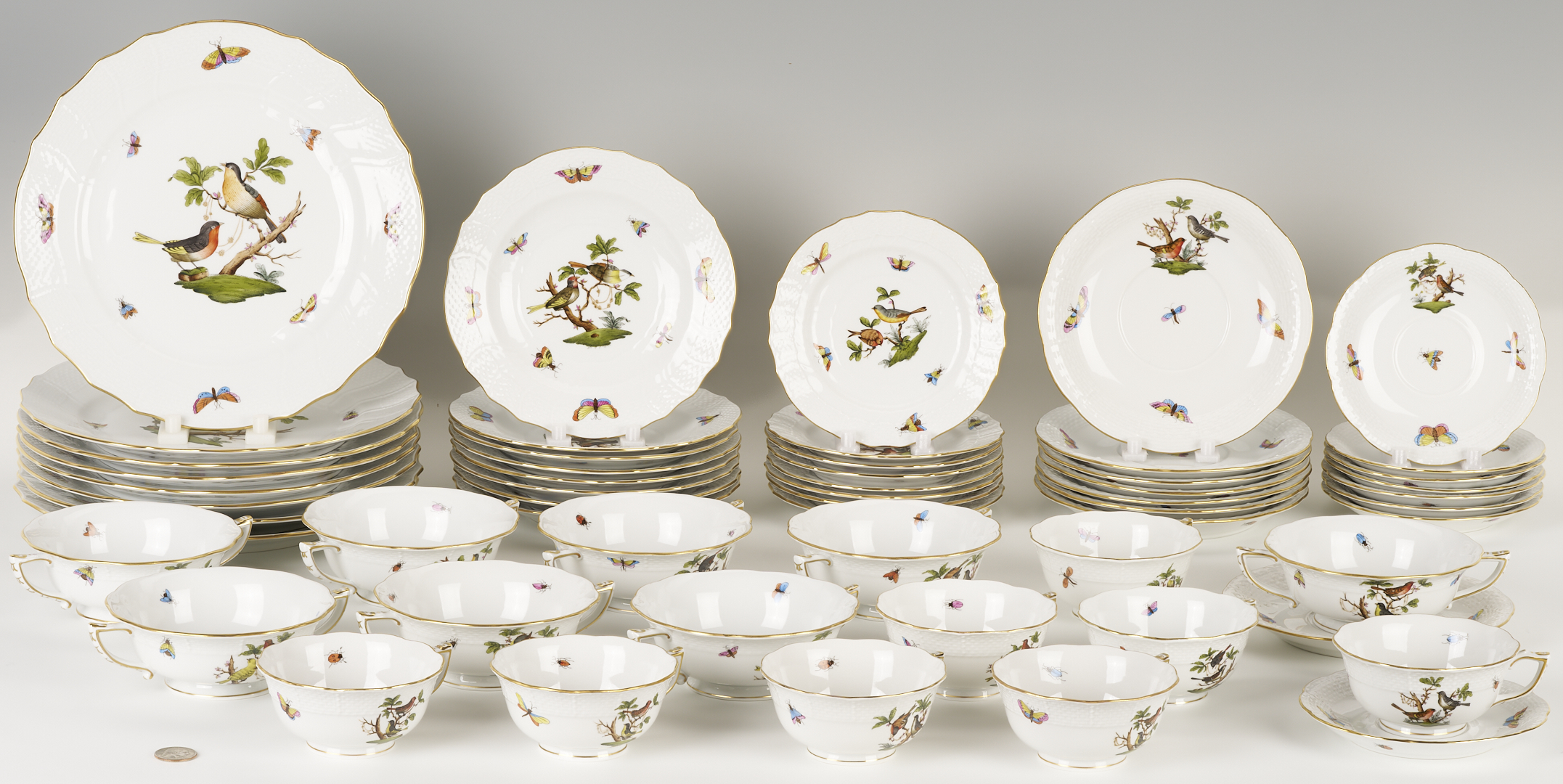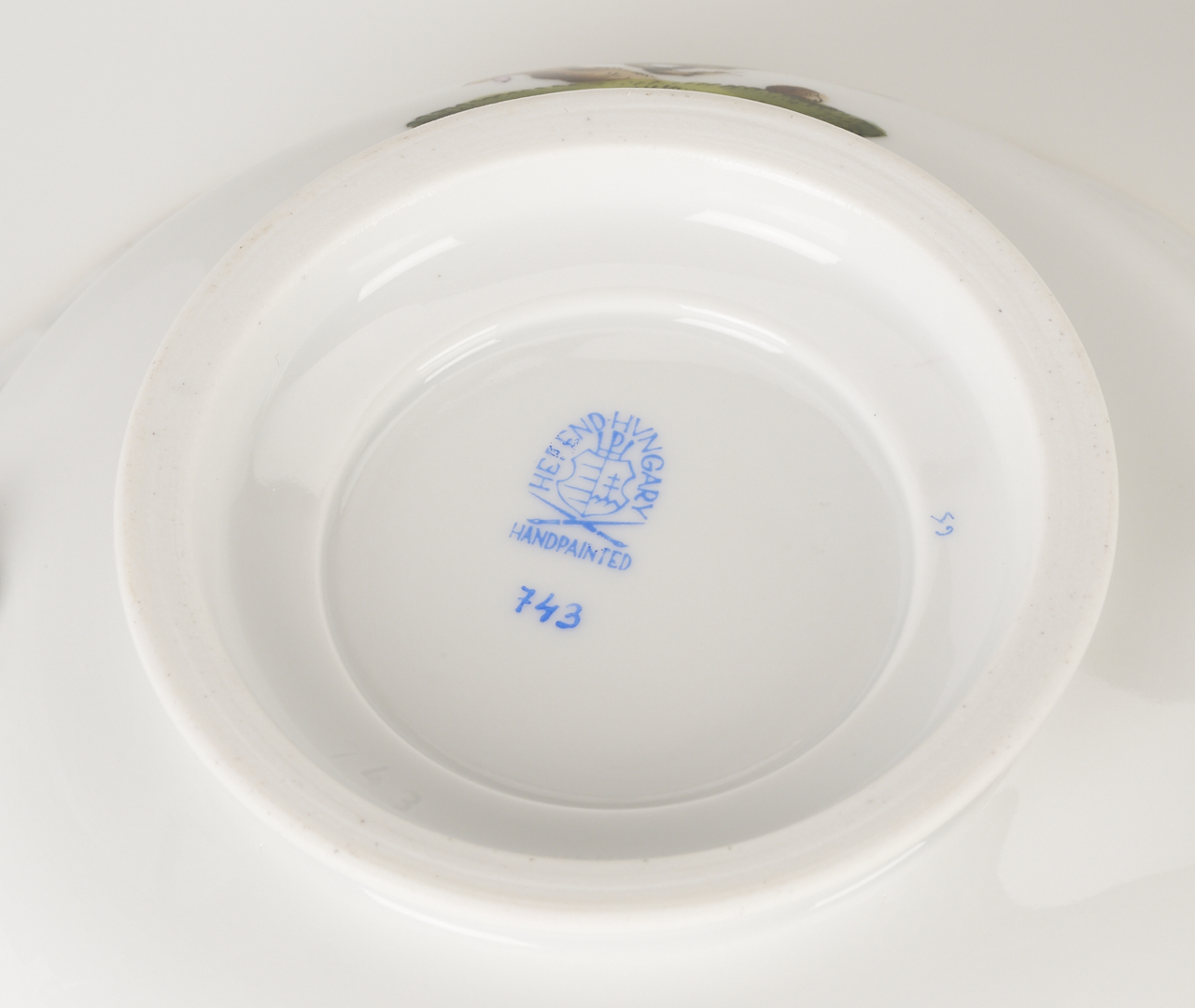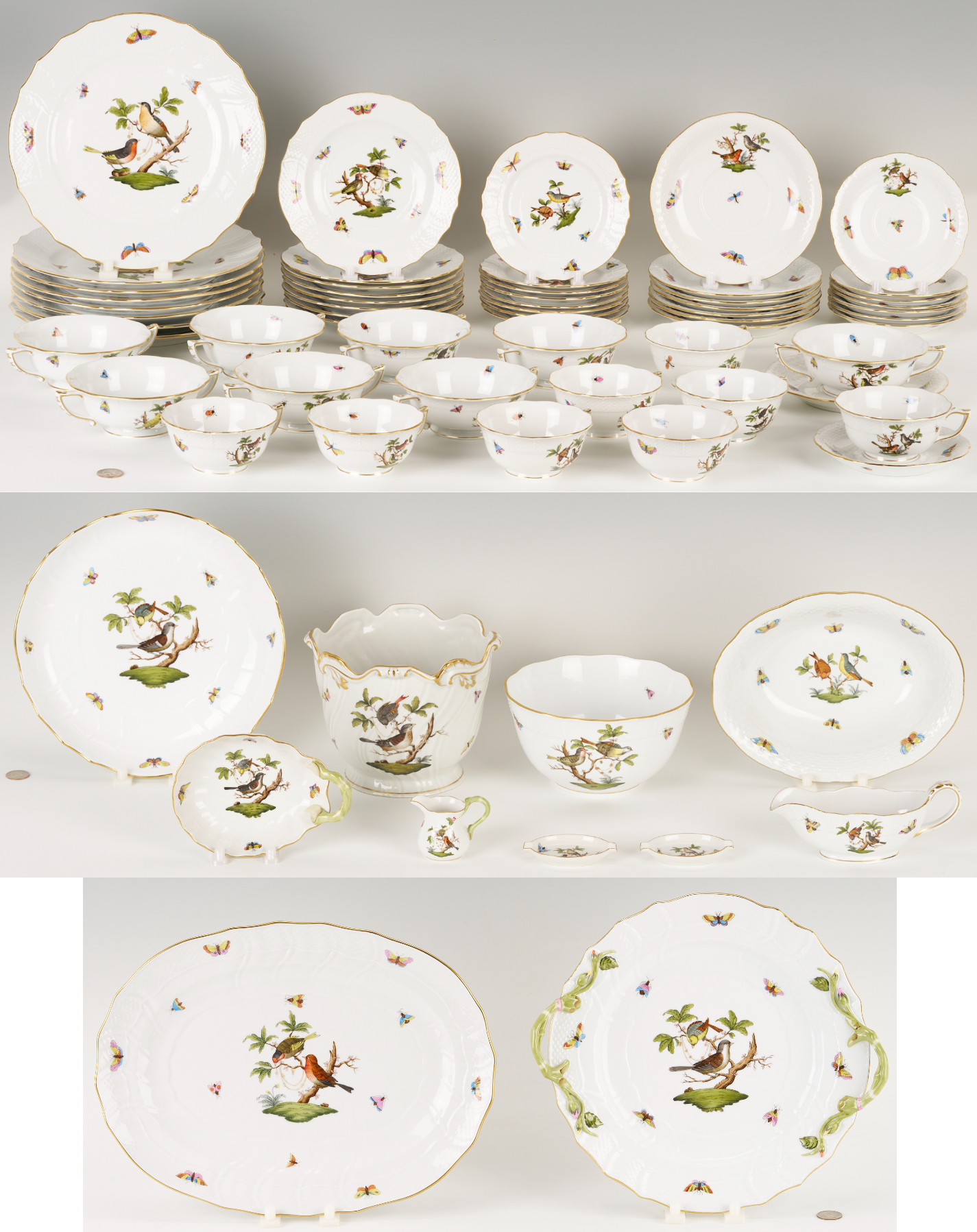 Sixty-nine (69) pieces Herend Rothschild Bird porcelain dinnerware, service for 8, including 8 dinner plates, 8 dessert or salad plates, 8 bread & butter plates, 8 tea cups with saucers, 8 cream soup cups with saucers, 1 large shallow round serving dish, 1 round handled serving platter, 1 oval serving platter, 1 wine cooler, 1 oval serving bowl, 1 small serving bowl, 1 individual creamer, 1 gravy boat, 1 handled shell form dish, 2 ashtrays, 1 oval serving platter, and 1 round serving platter with handles. All pieces have blue Herend marks stamped on the underside. Ranging in size 2 2/4 in. D x 3 1/2 in. W to 2 1/4 in. H x 15 in. W.