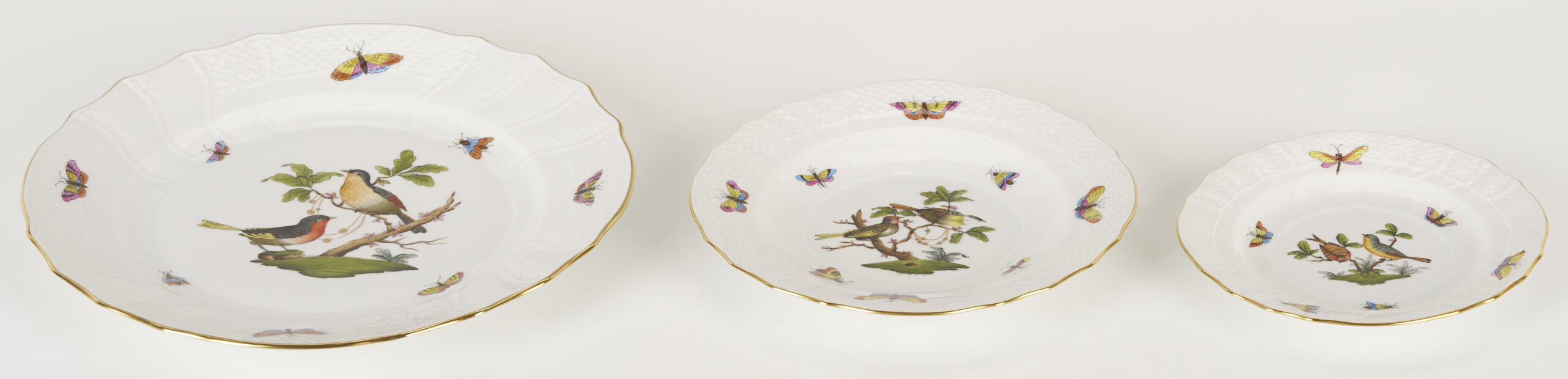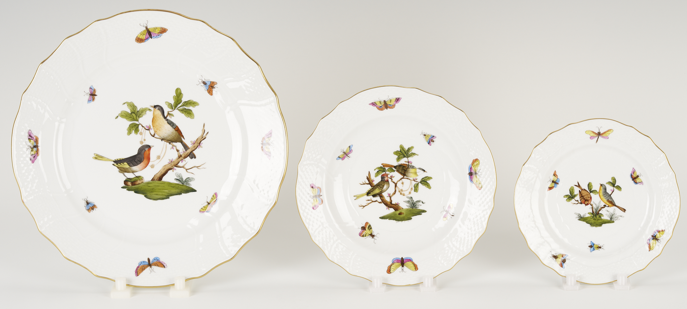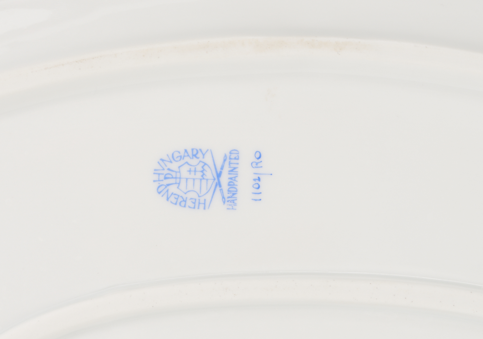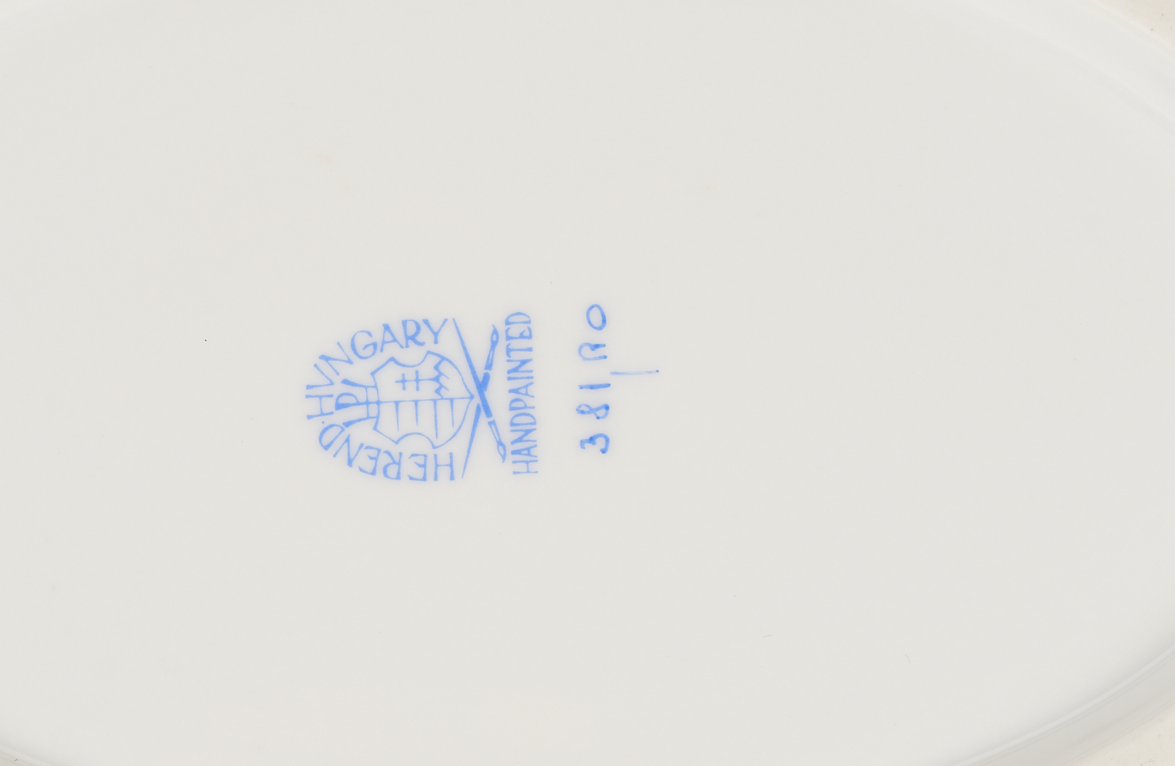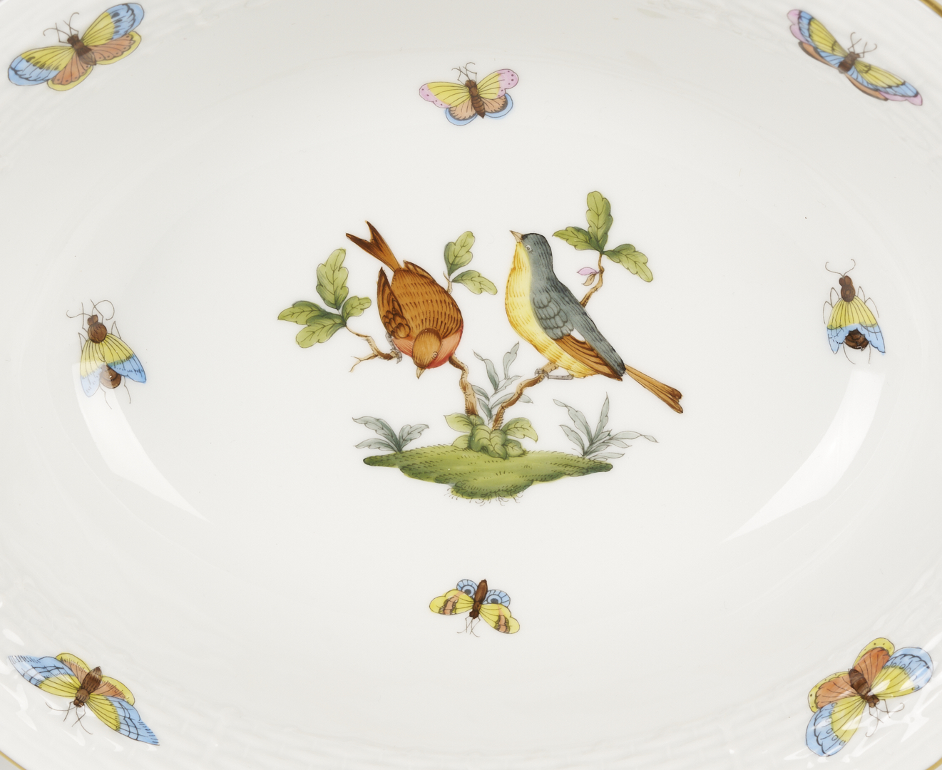 Sixty-nine (69) pieces Herend Rothschild Bird porcelain dinnerware, service for 8, including 8 dinner plates, 8 dessert or salad plates, 8 bread & butter plates, 8 tea cups with saucers, 8 cream soup cups with saucers, 1 large shallow round serving dish, 1 round handled serving platter, 1 oval serving platter, 1 wine cooler, 1 oval serving bowl, 1 small serving bowl, 1 individual creamer, 1 gravy boat, 1 handled shell form dish, 2 ashtrays, 1 oval serving platter, and 1 round serving platter with handles. All pieces have blue Herend marks stamped on the underside. Ranging in size 2 2/4 in. D x 3 1/2 in. W to 2 1/4 in. H x 15 in. W.