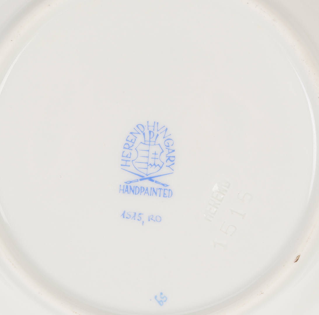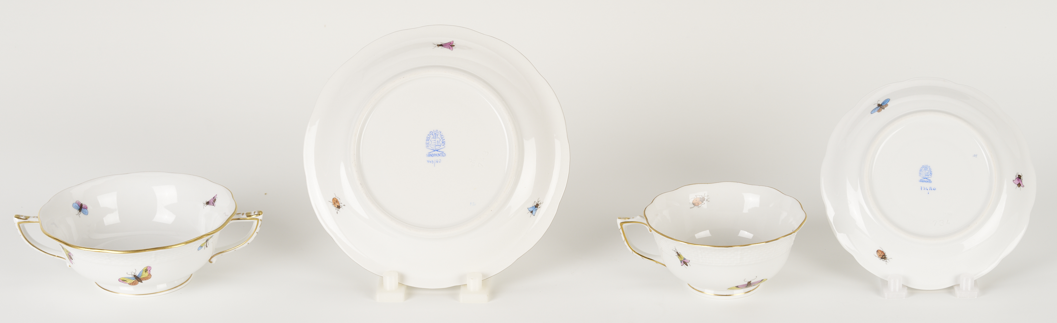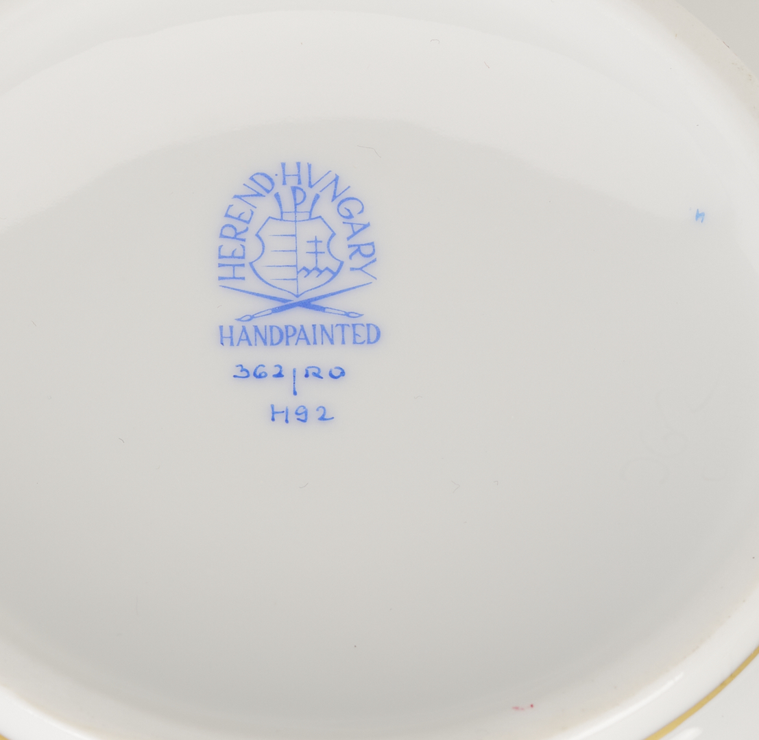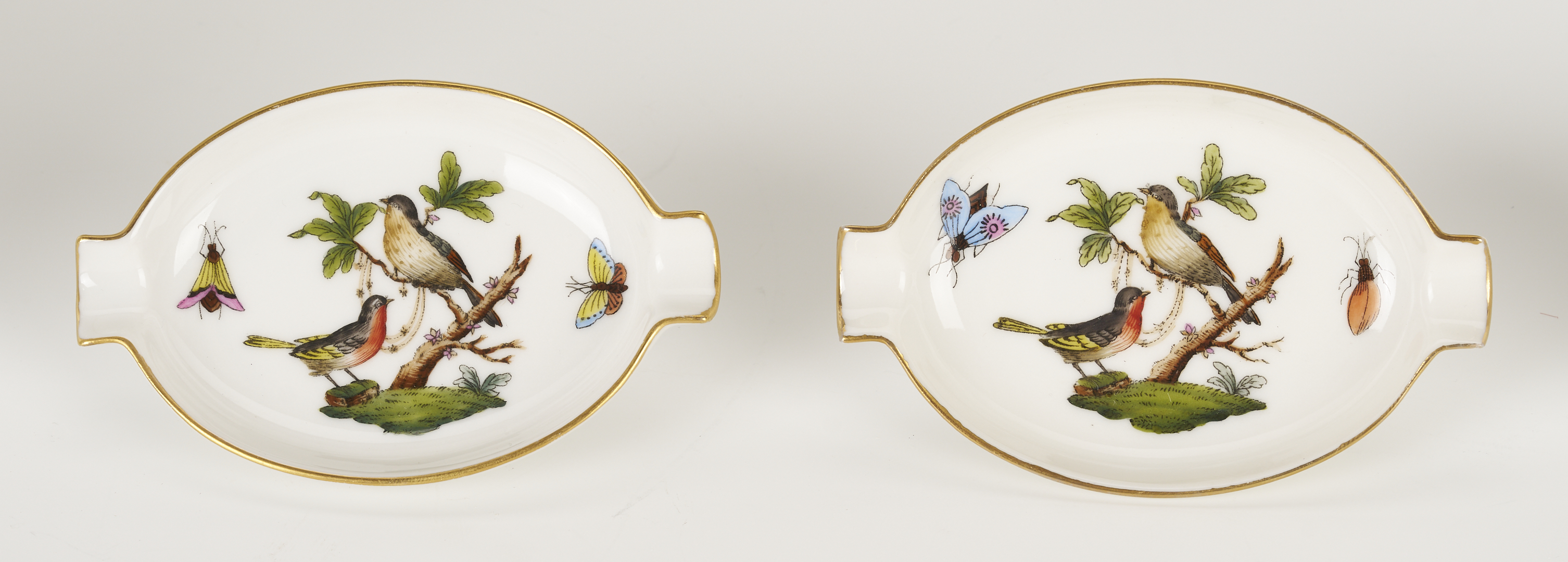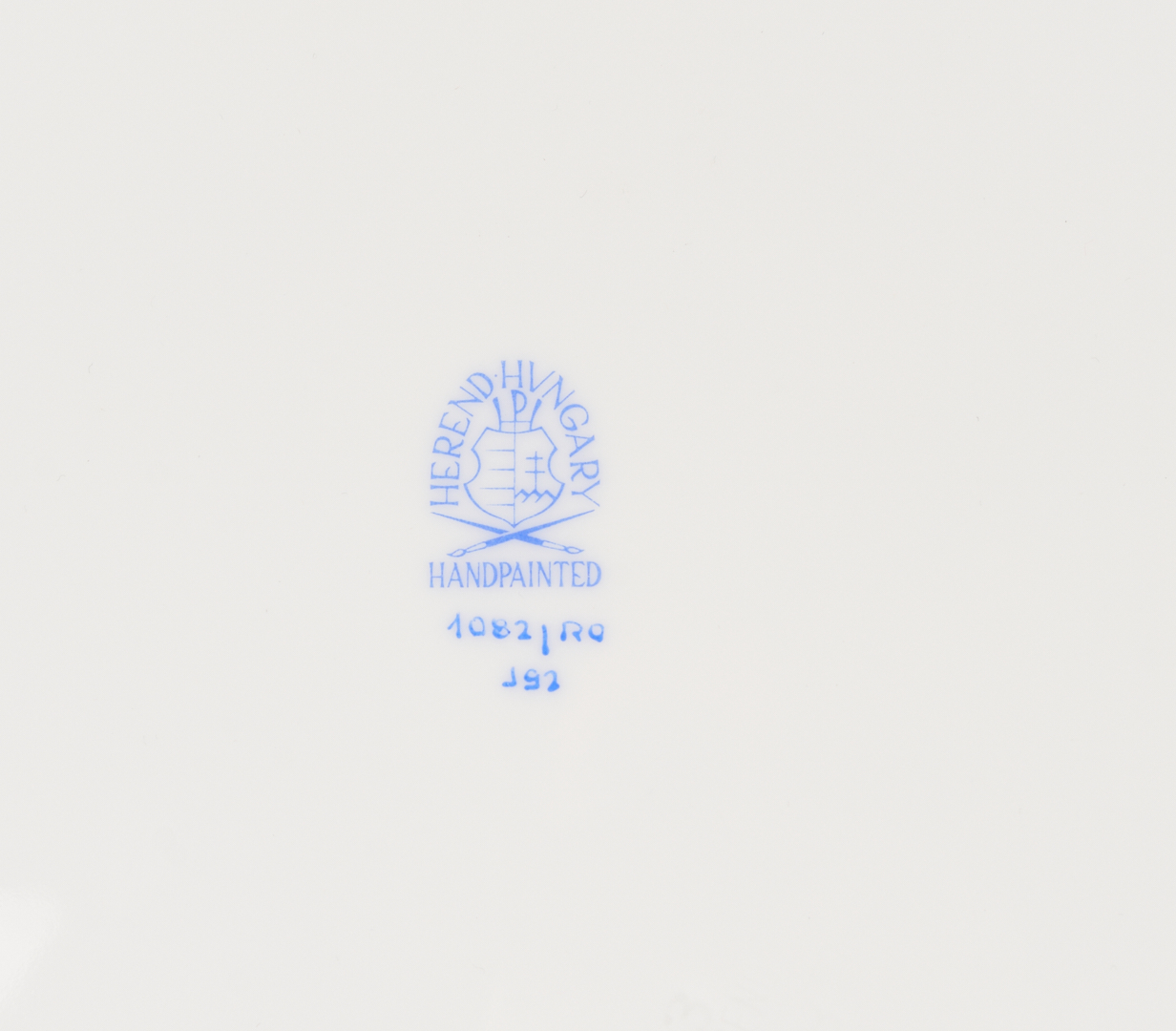 Sixty-nine (69) pieces Herend Rothschild Bird porcelain dinnerware, service for 8, including 8 dinner plates, 8 dessert or salad plates, 8 bread & butter plates, 8 tea cups with saucers, 8 cream soup cups with saucers, 1 large shallow round serving dish, 1 round handled serving platter, 1 oval serving platter, 1 wine cooler, 1 oval serving bowl, 1 small serving bowl, 1 individual creamer, 1 gravy boat, 1 handled shell form dish, 2 ashtrays, 1 oval serving platter, and 1 round serving platter with handles. All pieces have blue Herend marks stamped on the underside. Ranging in size 2 2/4 in. D x 3 1/2 in. W to 2 1/4 in. H x 15 in. W.