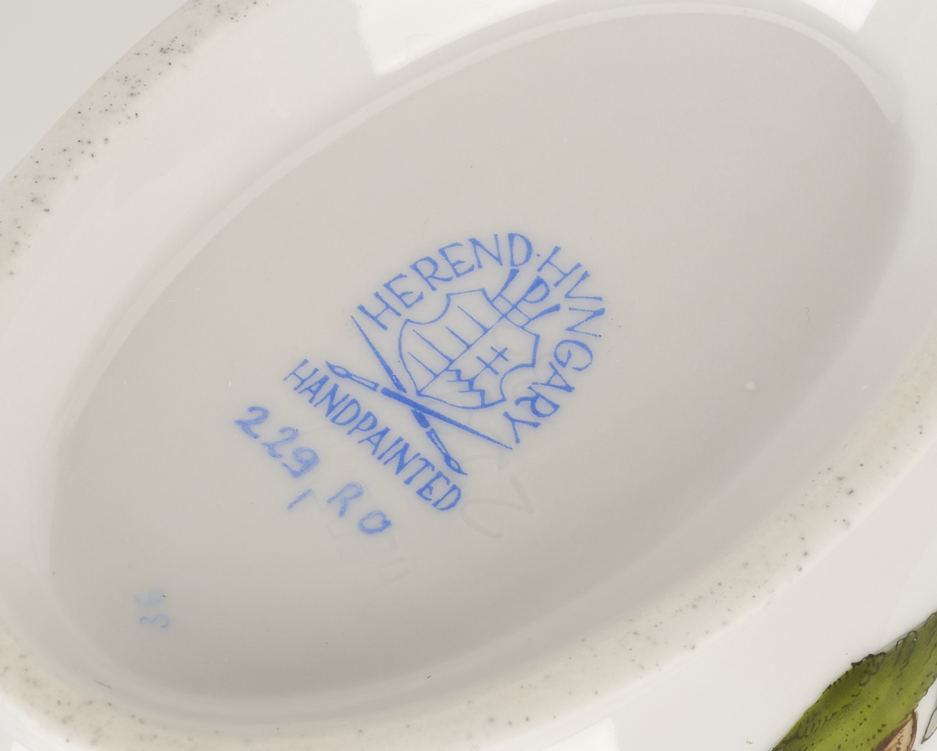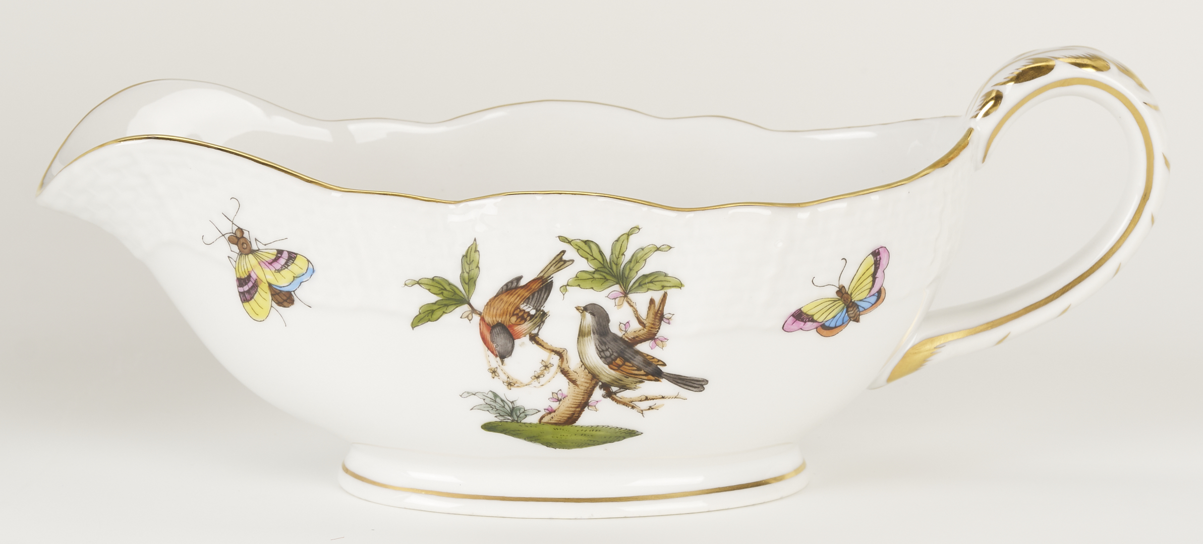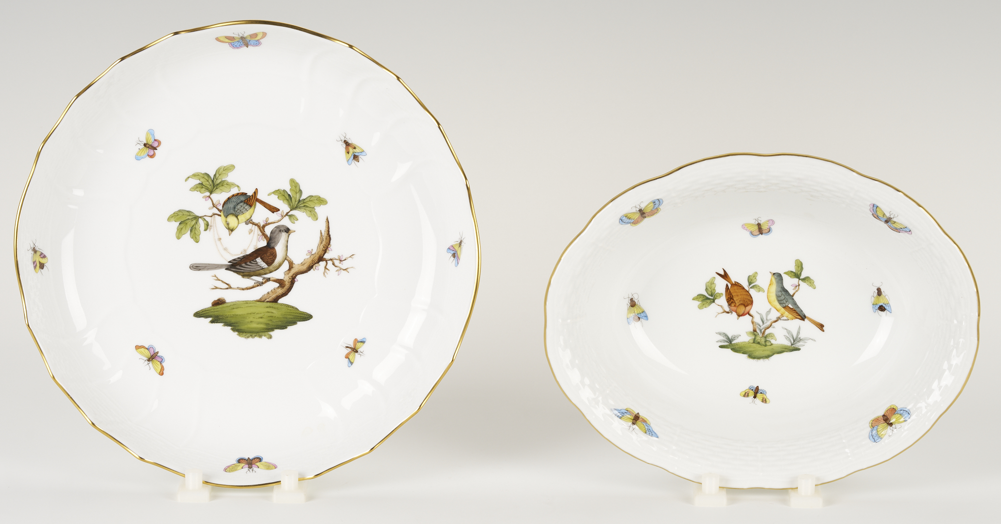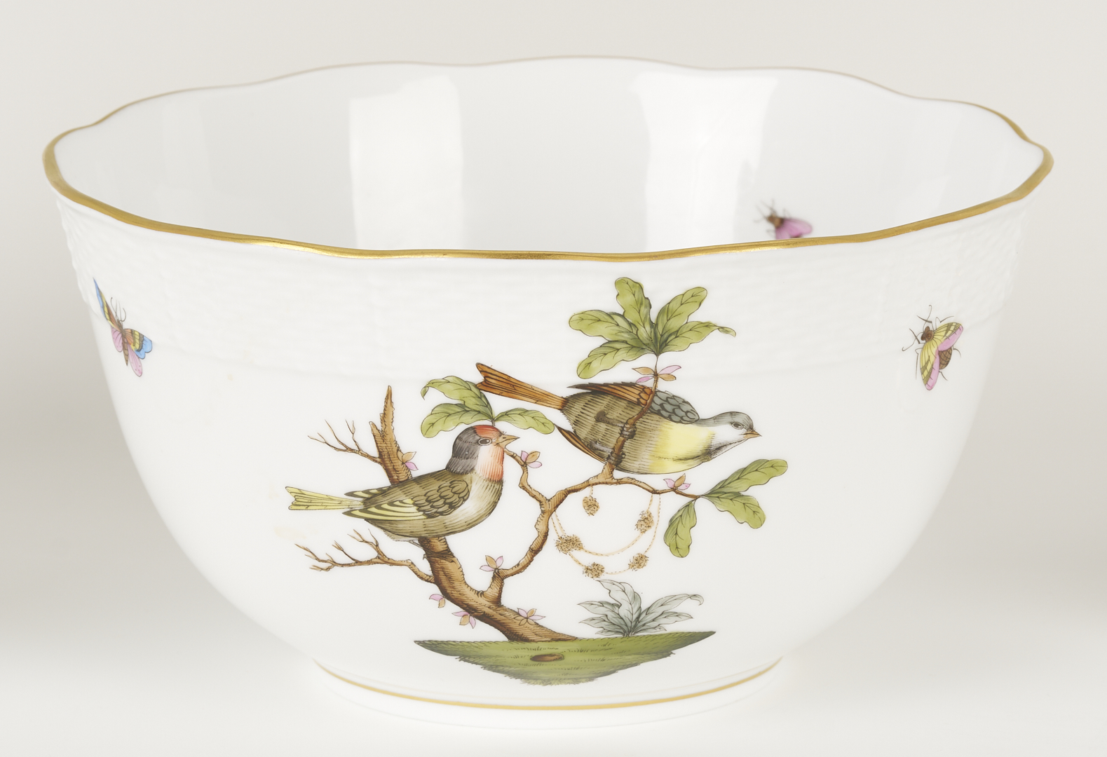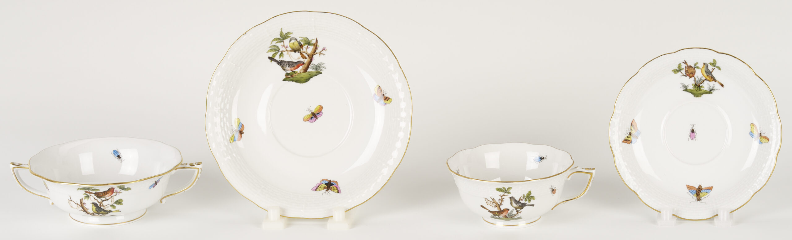 Sixty-nine (69) pieces Herend Rothschild Bird porcelain dinnerware, service for 8, including 8 dinner plates, 8 dessert or salad plates, 8 bread & butter plates, 8 tea cups with saucers, 8 cream soup cups with saucers, 1 large shallow round serving dish, 1 round handled serving platter, 1 oval serving platter, 1 wine cooler, 1 oval serving bowl, 1 small serving bowl, 1 individual creamer, 1 gravy boat, 1 handled shell form dish, 2 ashtrays, 1 oval serving platter, and 1 round serving platter with handles. All pieces have blue Herend marks stamped on the underside. Ranging in size 2 2/4 in. D x 3 1/2 in. W to 2 1/4 in. H x 15 in. W.