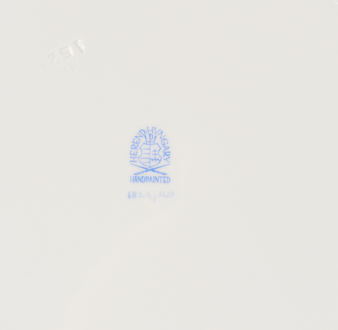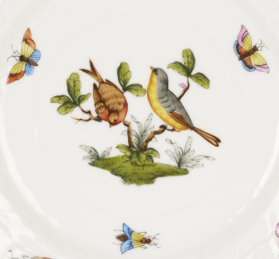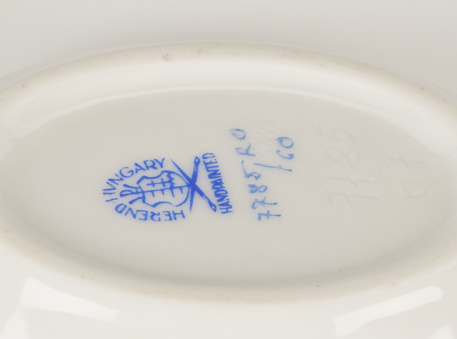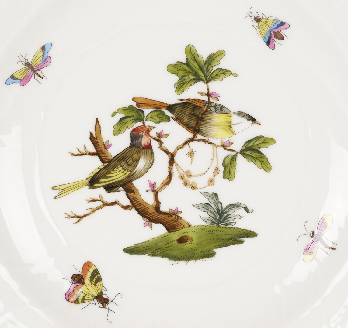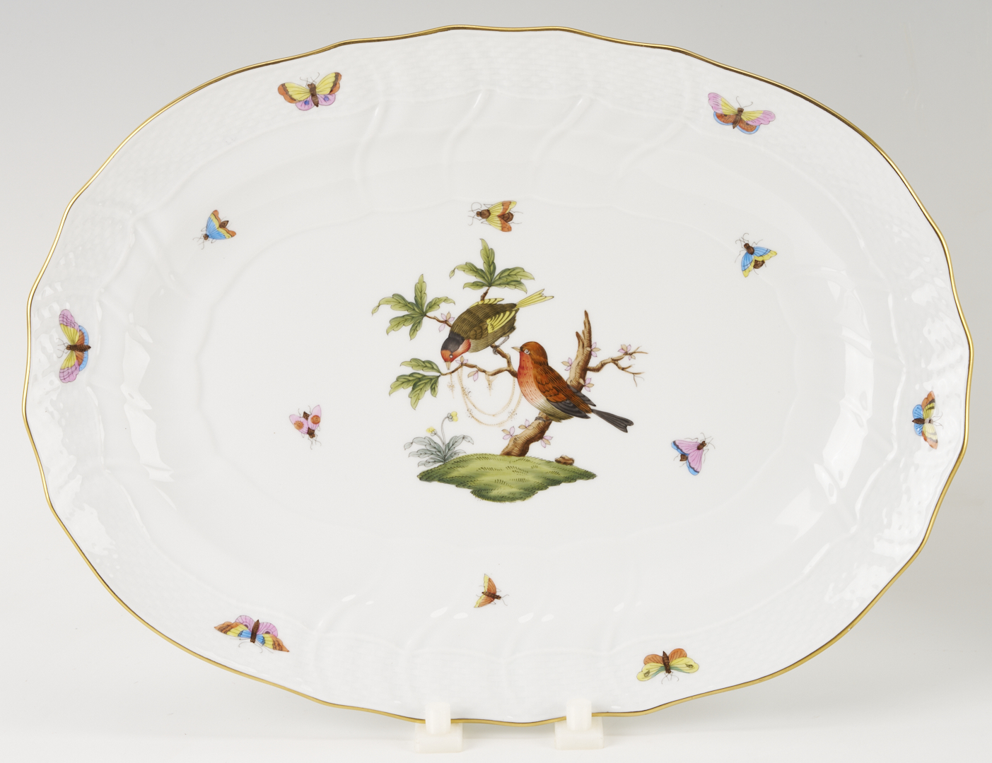 Sixty-nine (69) pieces Herend Rothschild Bird porcelain dinnerware, service for 8, including 8 dinner plates, 8 dessert or salad plates, 8 bread & butter plates, 8 tea cups with saucers, 8 cream soup cups with saucers, 1 large shallow round serving dish, 1 round handled serving platter, 1 oval serving platter, 1 wine cooler, 1 oval serving bowl, 1 small serving bowl, 1 individual creamer, 1 gravy boat, 1 handled shell form dish, 2 ashtrays, 1 oval serving platter, and 1 round serving platter with handles. All pieces have blue Herend marks stamped on the underside. Ranging in size 2 2/4 in. D x 3 1/2 in. W to 2 1/4 in. H x 15 in. W.