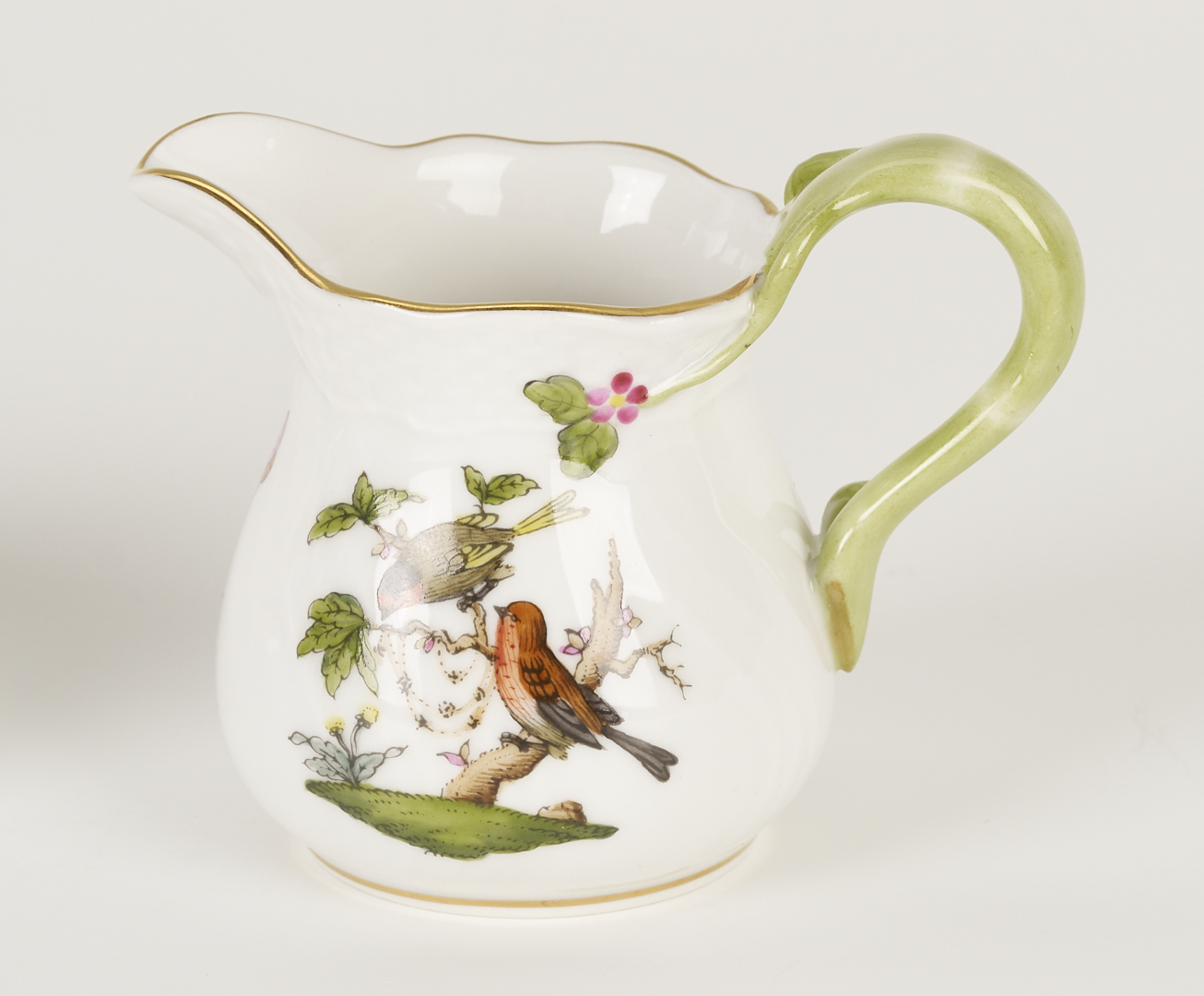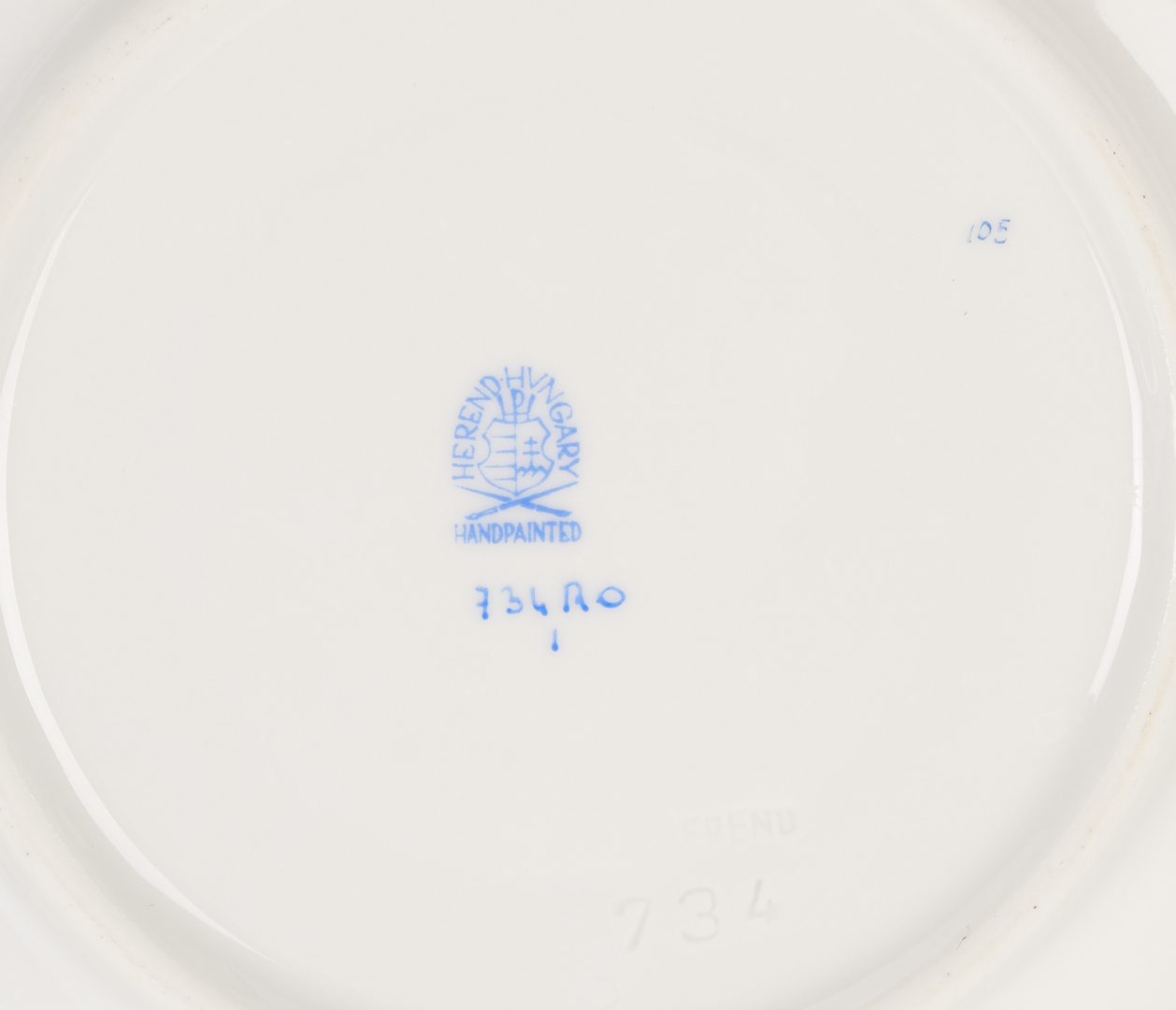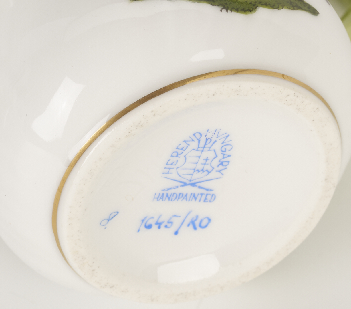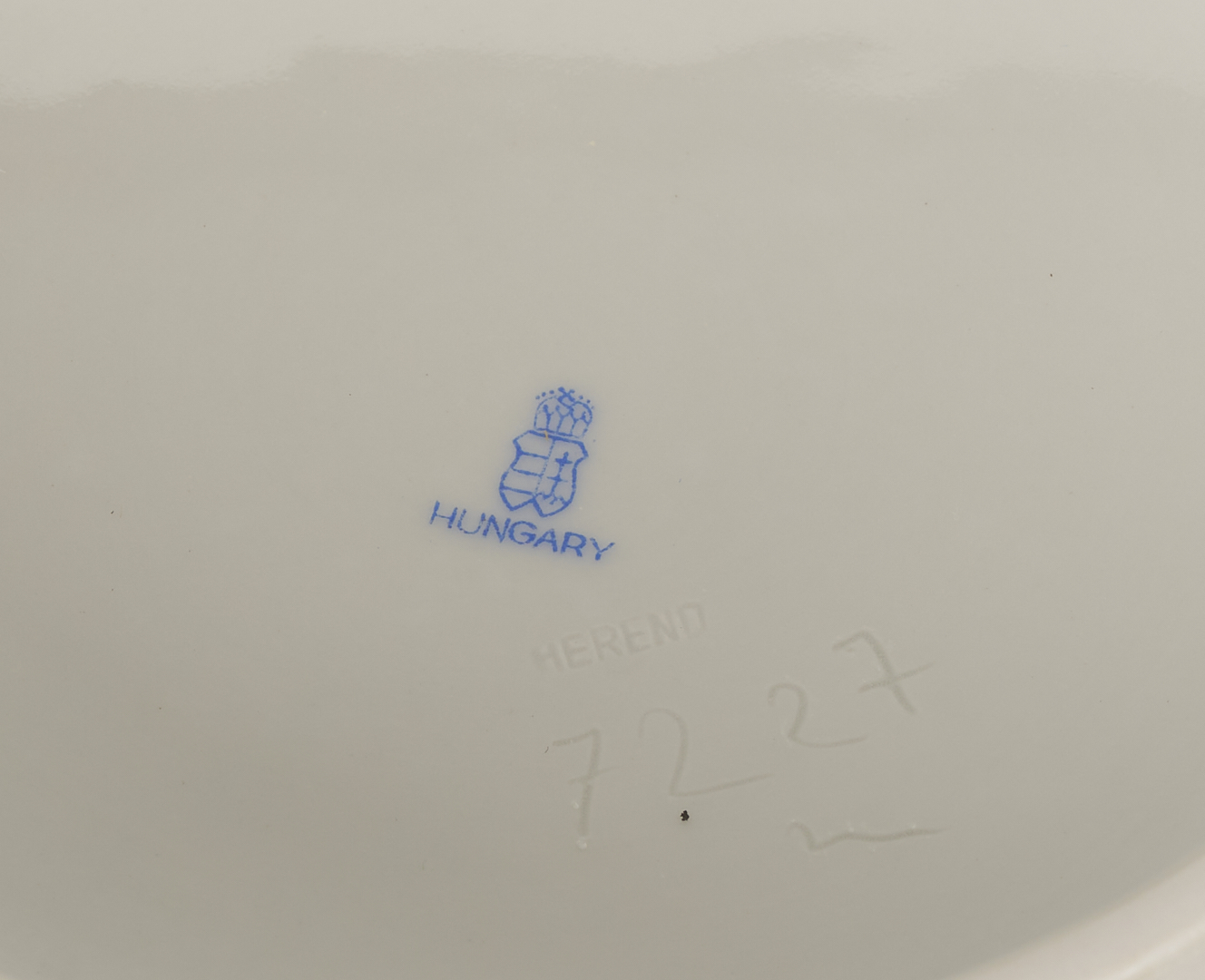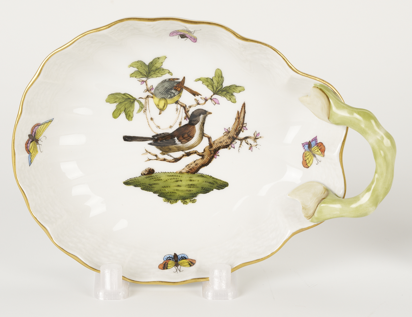 Sixty-nine (69) pieces Herend Rothschild Bird porcelain dinnerware, service for 8, including 8 dinner plates, 8 dessert or salad plates, 8 bread & butter plates, 8 tea cups with saucers, 8 cream soup cups with saucers, 1 large shallow round serving dish, 1 round handled serving platter, 1 oval serving platter, 1 wine cooler, 1 oval serving bowl, 1 small serving bowl, 1 individual creamer, 1 gravy boat, 1 handled shell form dish, 2 ashtrays, 1 oval serving platter, and 1 round serving platter with handles. All pieces have blue Herend marks stamped on the underside. Ranging in size 2 2/4 in. D x 3 1/2 in. W to 2 1/4 in. H x 15 in. W.