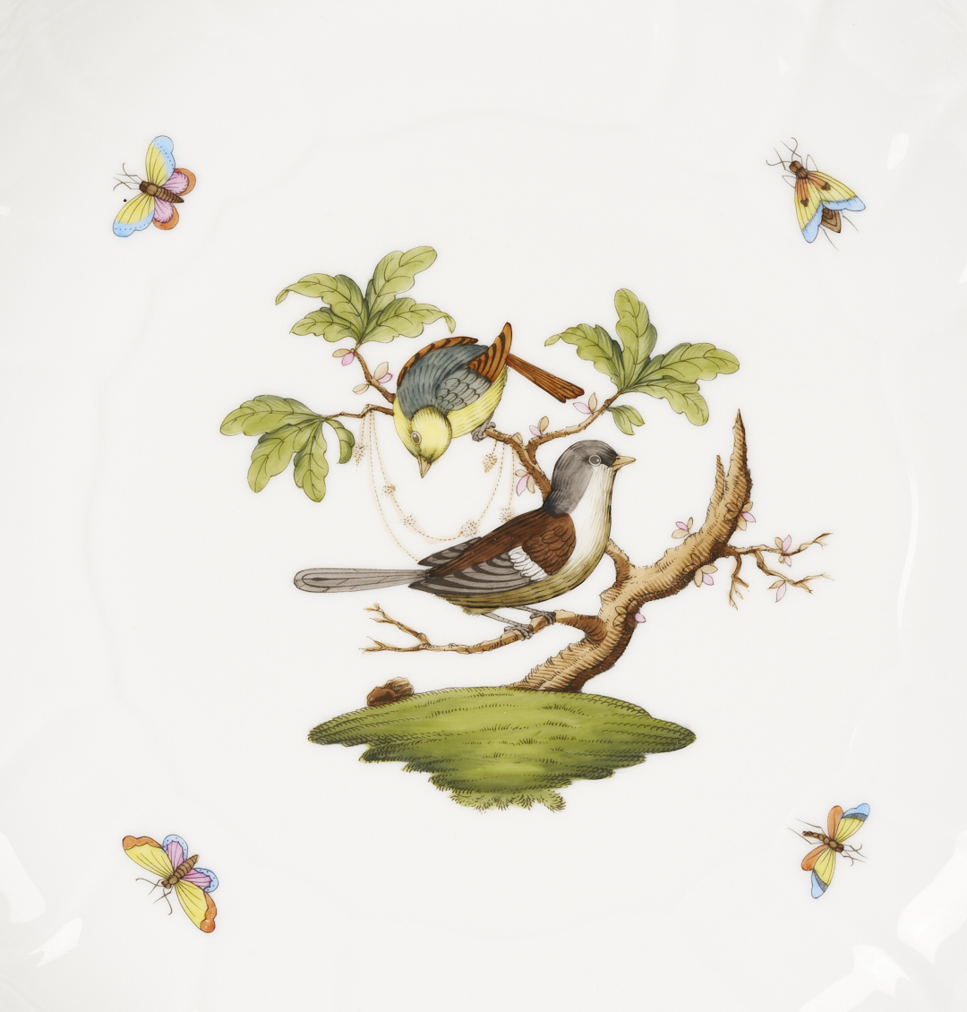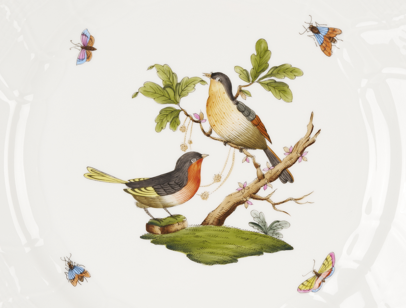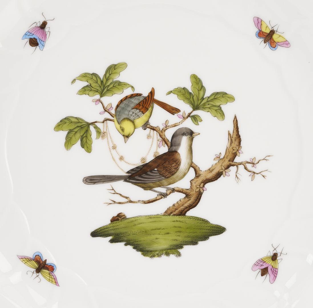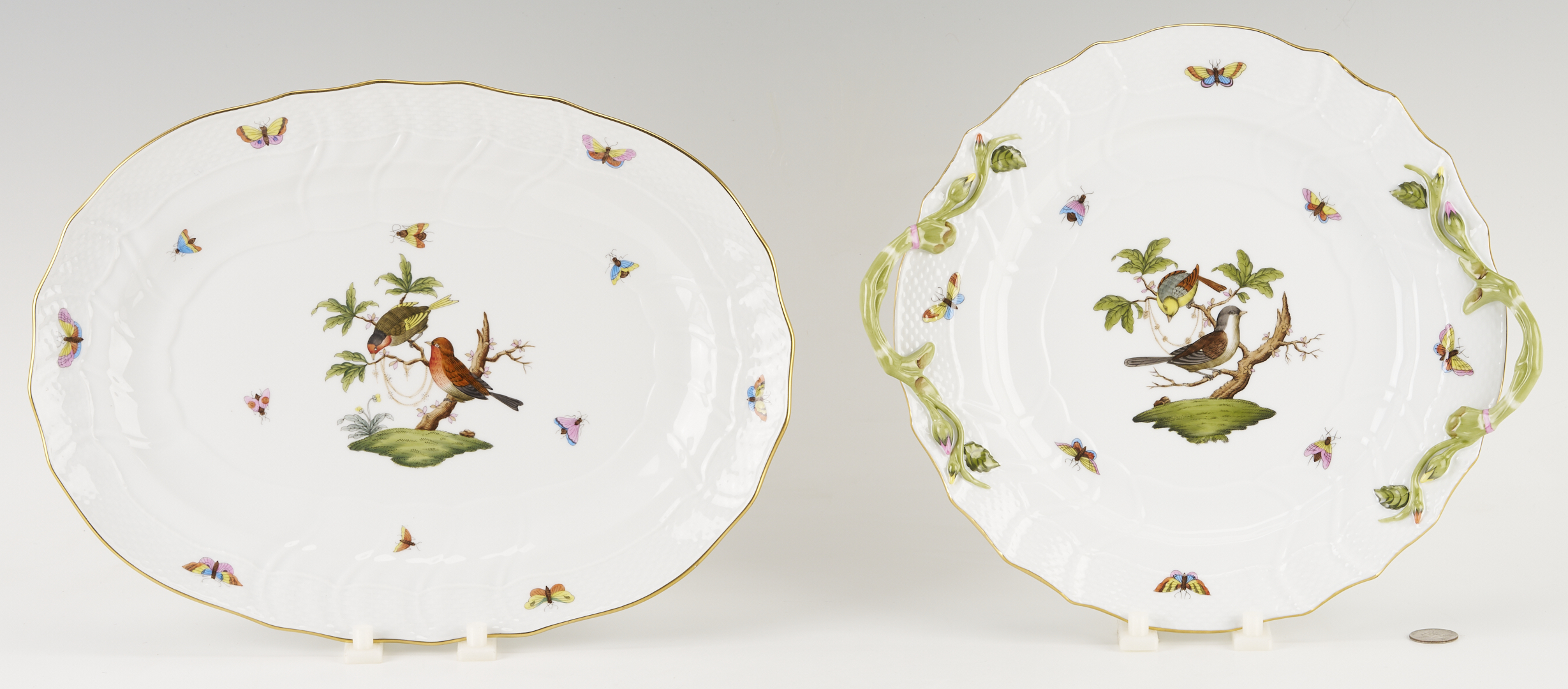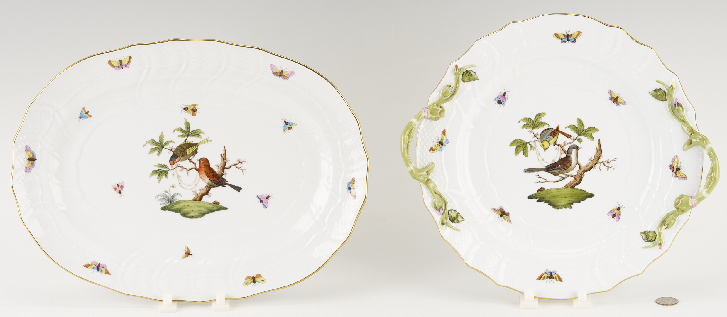 Sixty-nine (69) pieces Herend Rothschild Bird porcelain dinnerware, service for 8, including 8 dinner plates, 8 dessert or salad plates, 8 bread & butter plates, 8 tea cups with saucers, 8 cream soup cups with saucers, 1 large shallow round serving dish, 1 round handled serving platter, 1 oval serving platter, 1 wine cooler, 1 oval serving bowl, 1 small serving bowl, 1 individual creamer, 1 gravy boat, 1 handled shell form dish, 2 ashtrays, 1 oval serving platter, and 1 round serving platter with handles. All pieces have blue Herend marks stamped on the underside. Ranging in size 2 2/4 in. D x 3 1/2 in. W to 2 1/4 in. H x 15 in. W.