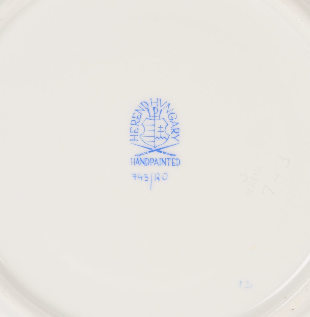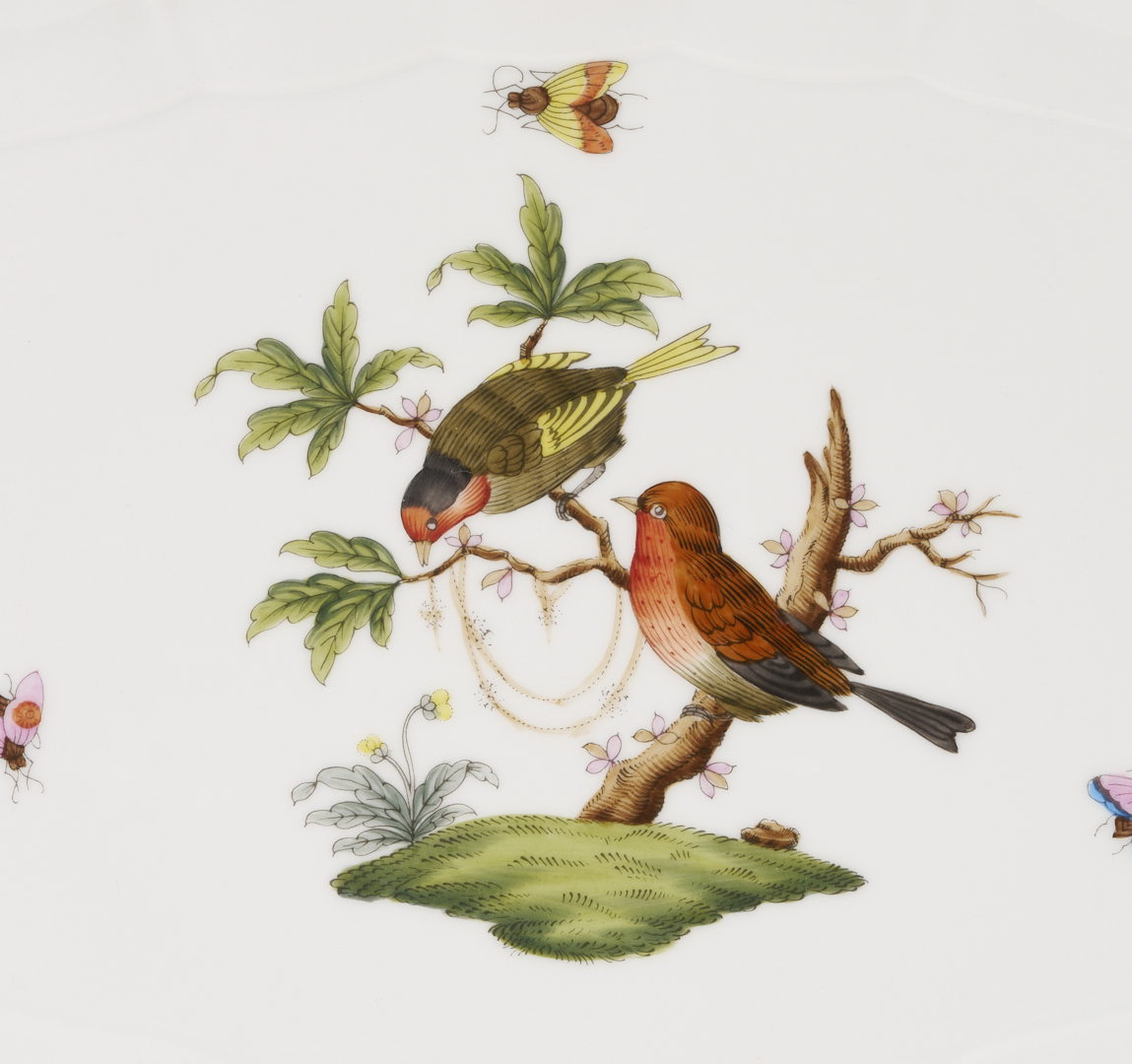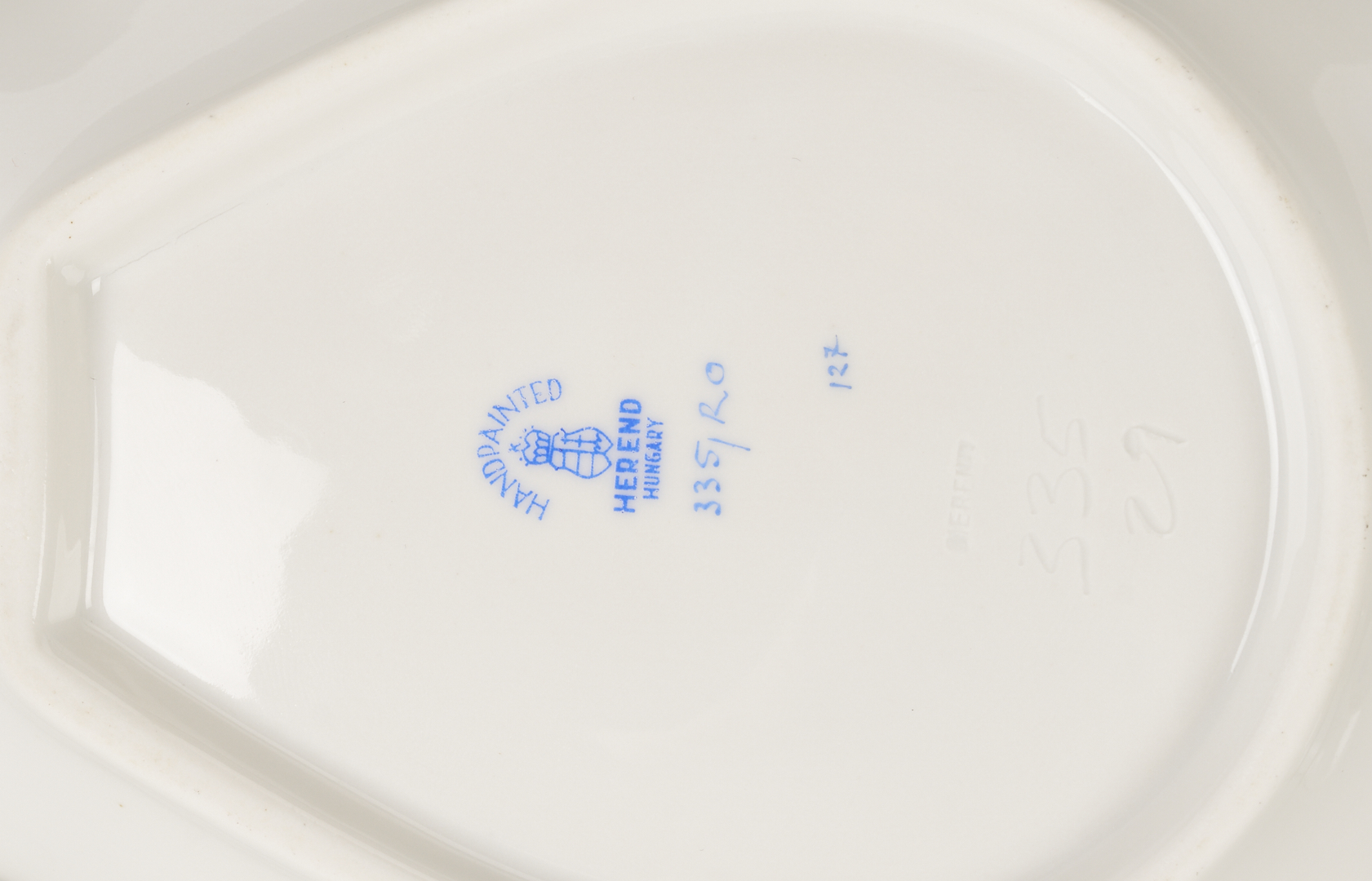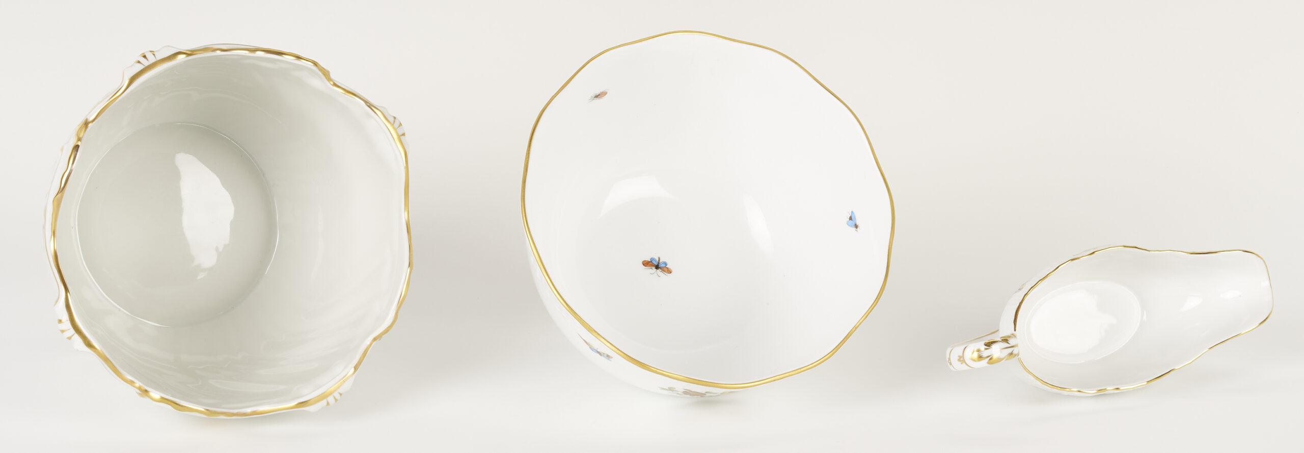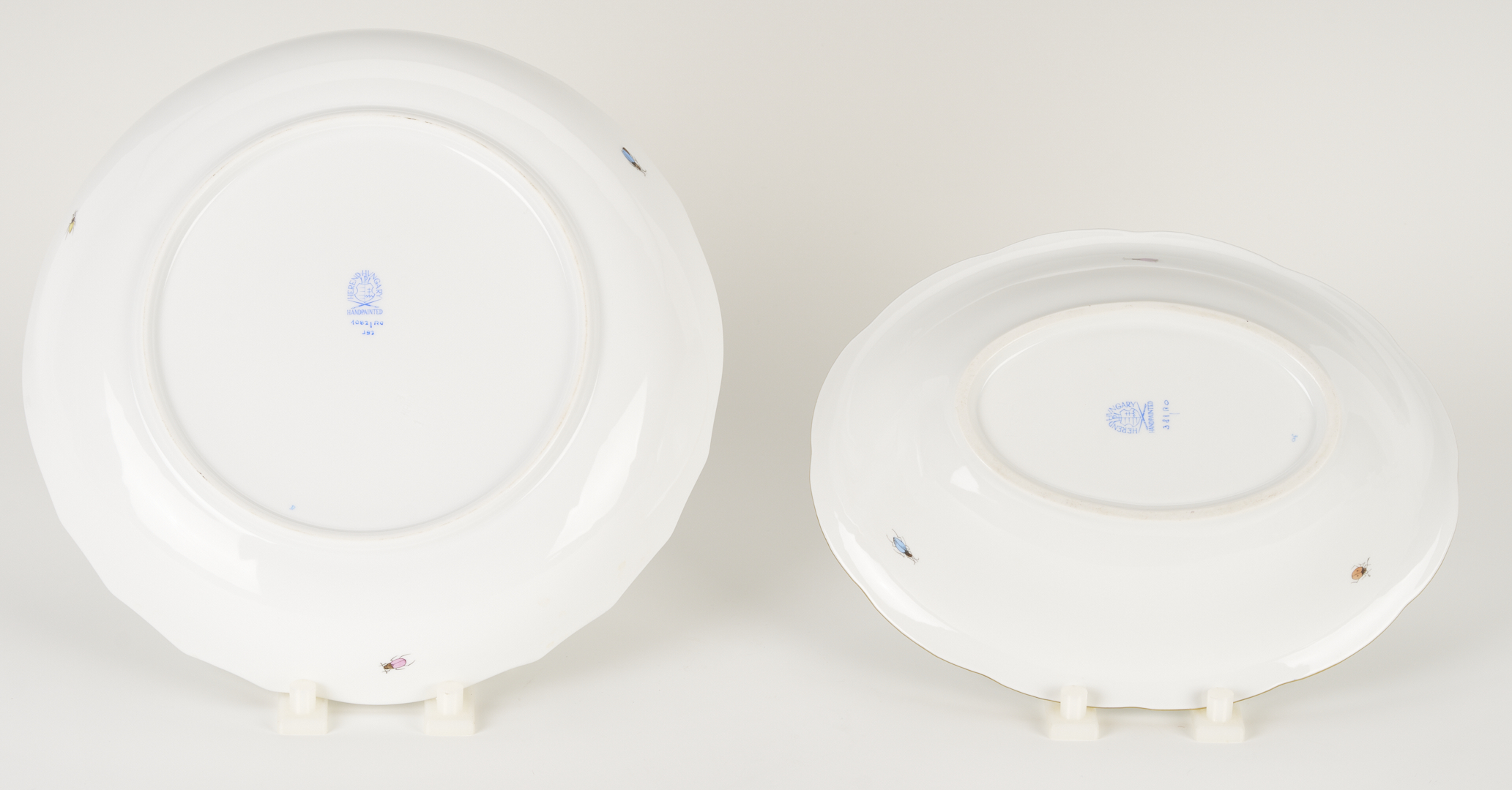 Sixty-nine (69) pieces Herend Rothschild Bird porcelain dinnerware, service for 8, including 8 dinner plates, 8 dessert or salad plates, 8 bread & butter plates, 8 tea cups with saucers, 8 cream soup cups with saucers, 1 large shallow round serving dish, 1 round handled serving platter, 1 oval serving platter, 1 wine cooler, 1 oval serving bowl, 1 small serving bowl, 1 individual creamer, 1 gravy boat, 1 handled shell form dish, 2 ashtrays, 1 oval serving platter, and 1 round serving platter with handles. All pieces have blue Herend marks stamped on the underside. Ranging in size 2 2/4 in. D x 3 1/2 in. W to 2 1/4 in. H x 15 in. W.