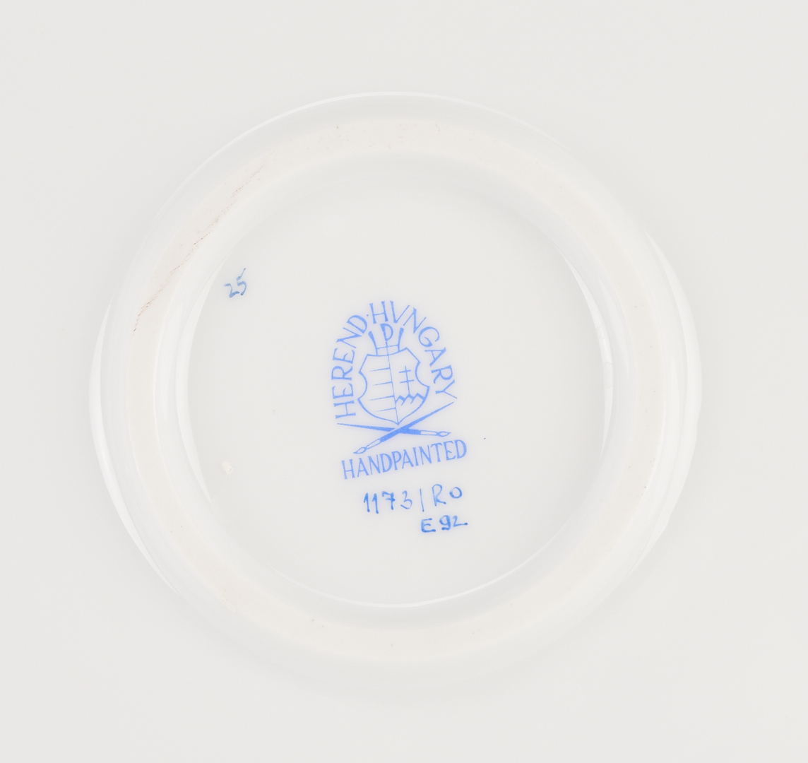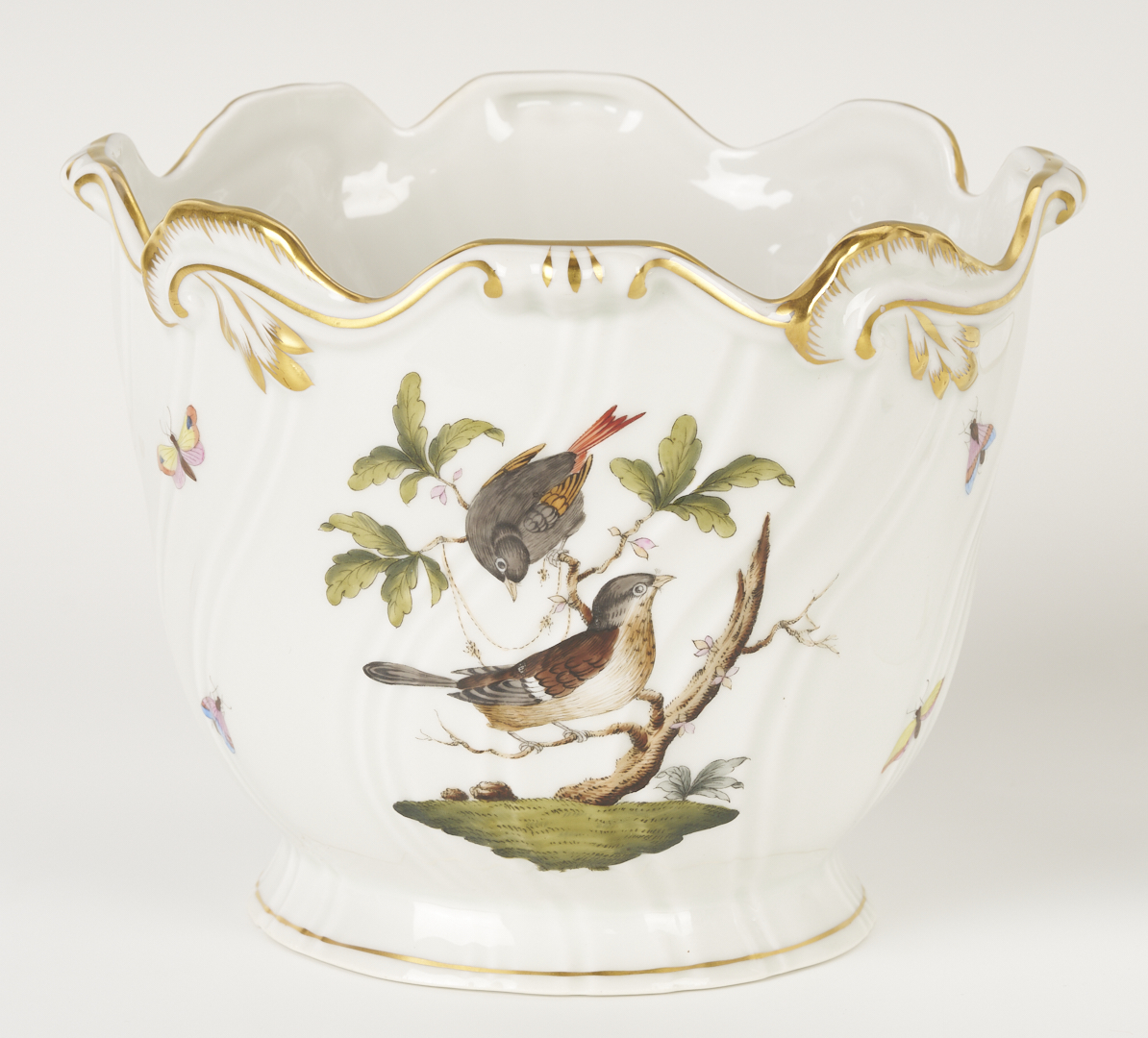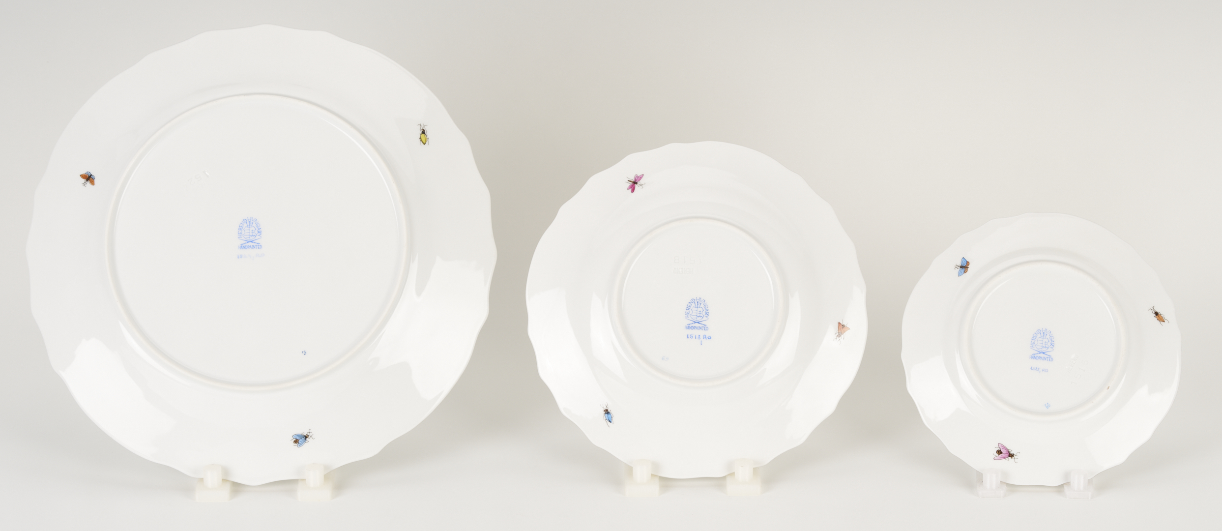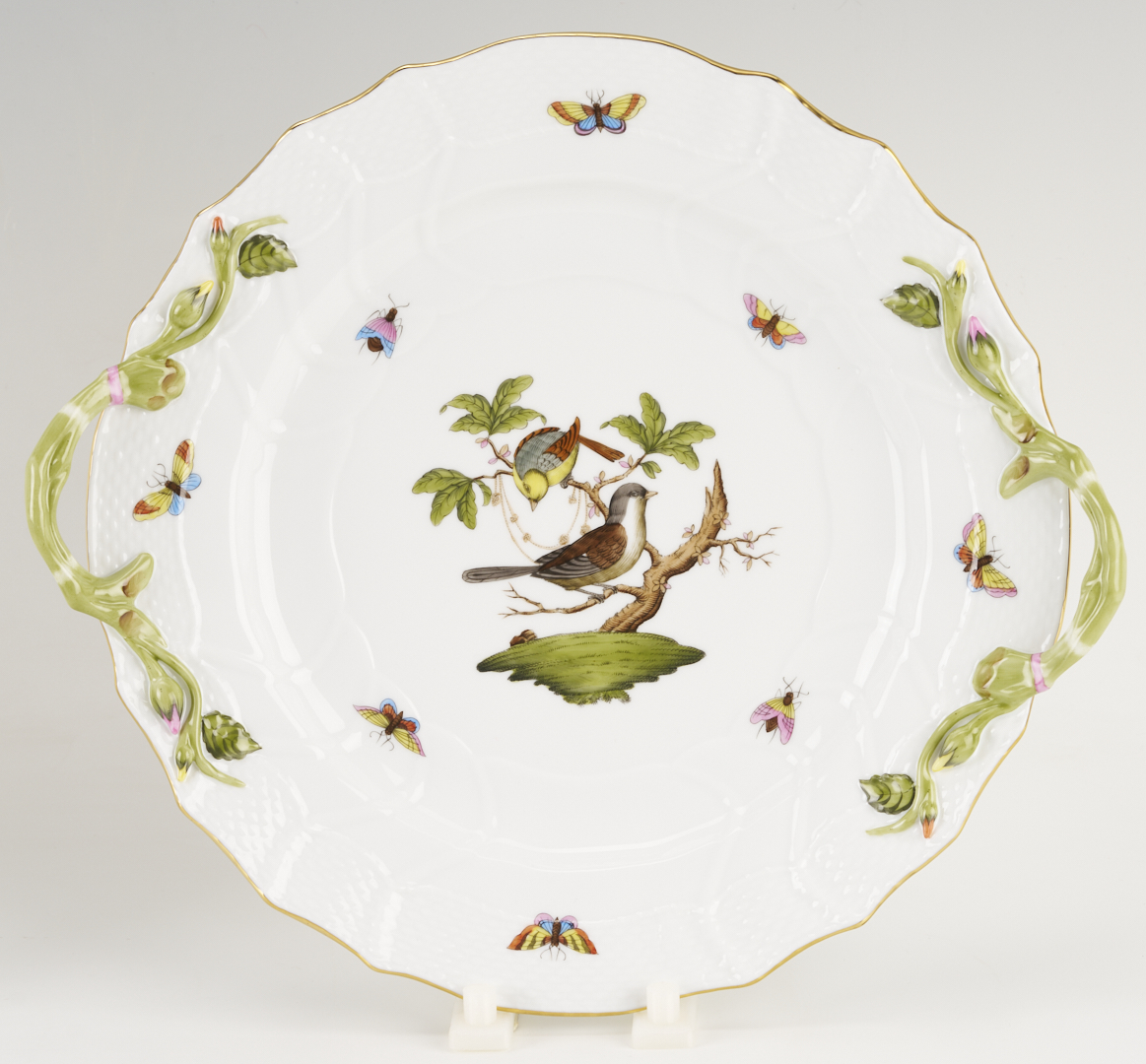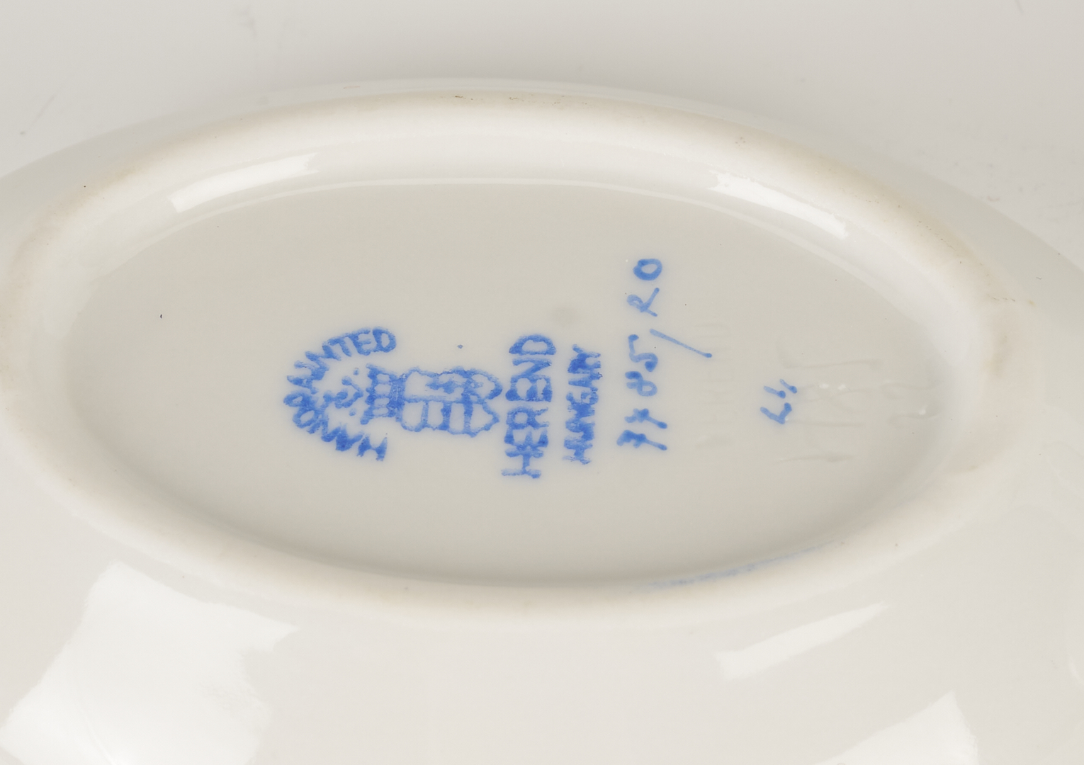 Sixty-nine (69) pieces Herend Rothschild Bird porcelain dinnerware, service for 8, including 8 dinner plates, 8 dessert or salad plates, 8 bread & butter plates, 8 tea cups with saucers, 8 cream soup cups with saucers, 1 large shallow round serving dish, 1 round handled serving platter, 1 oval serving platter, 1 wine cooler, 1 oval serving bowl, 1 small serving bowl, 1 individual creamer, 1 gravy boat, 1 handled shell form dish, 2 ashtrays, 1 oval serving platter, and 1 round serving platter with handles. All pieces have blue Herend marks stamped on the underside. Ranging in size 2 2/4 in. D x 3 1/2 in. W to 2 1/4 in. H x 15 in. W.