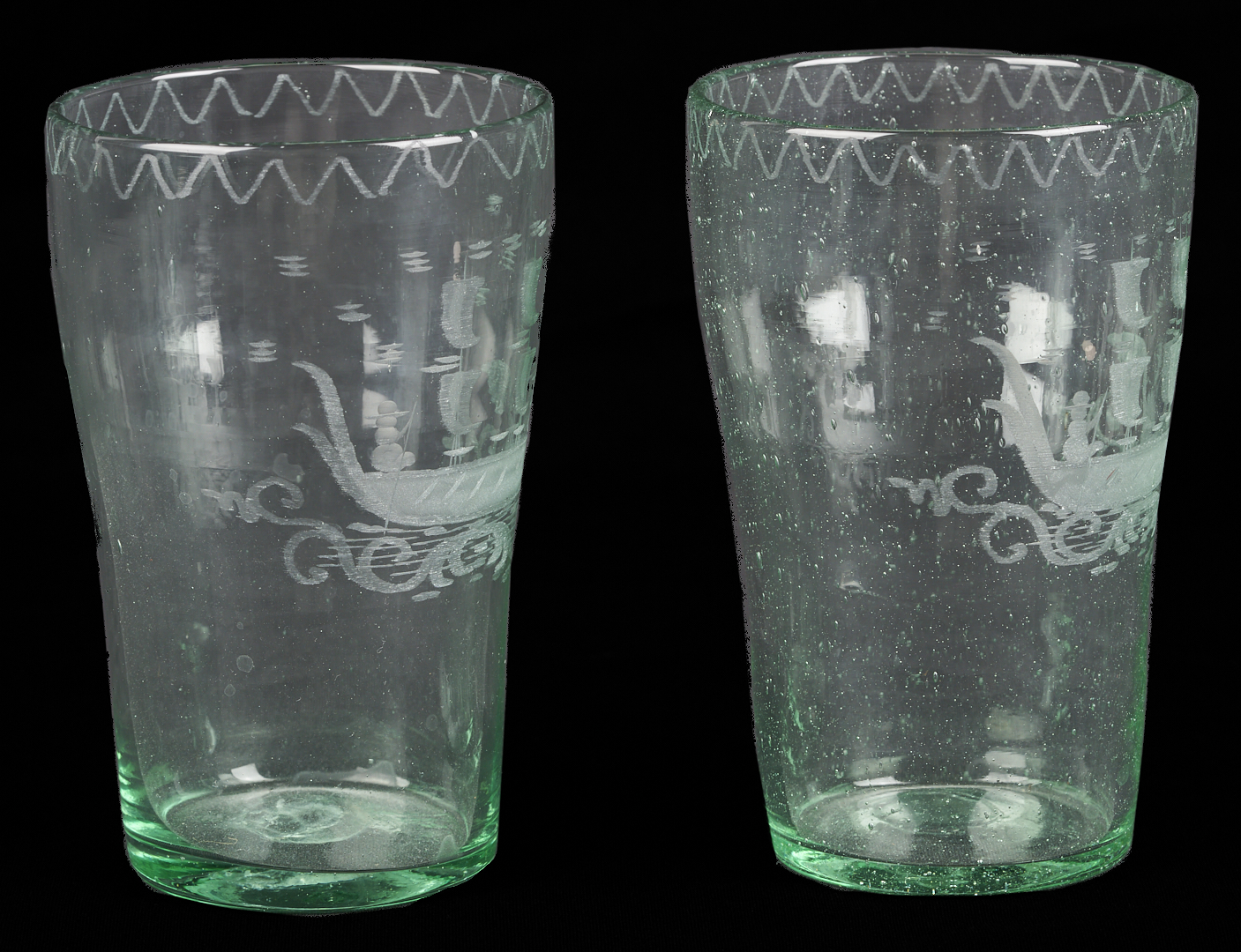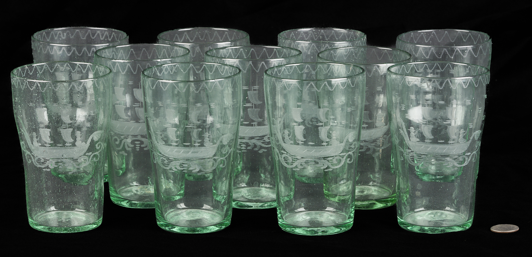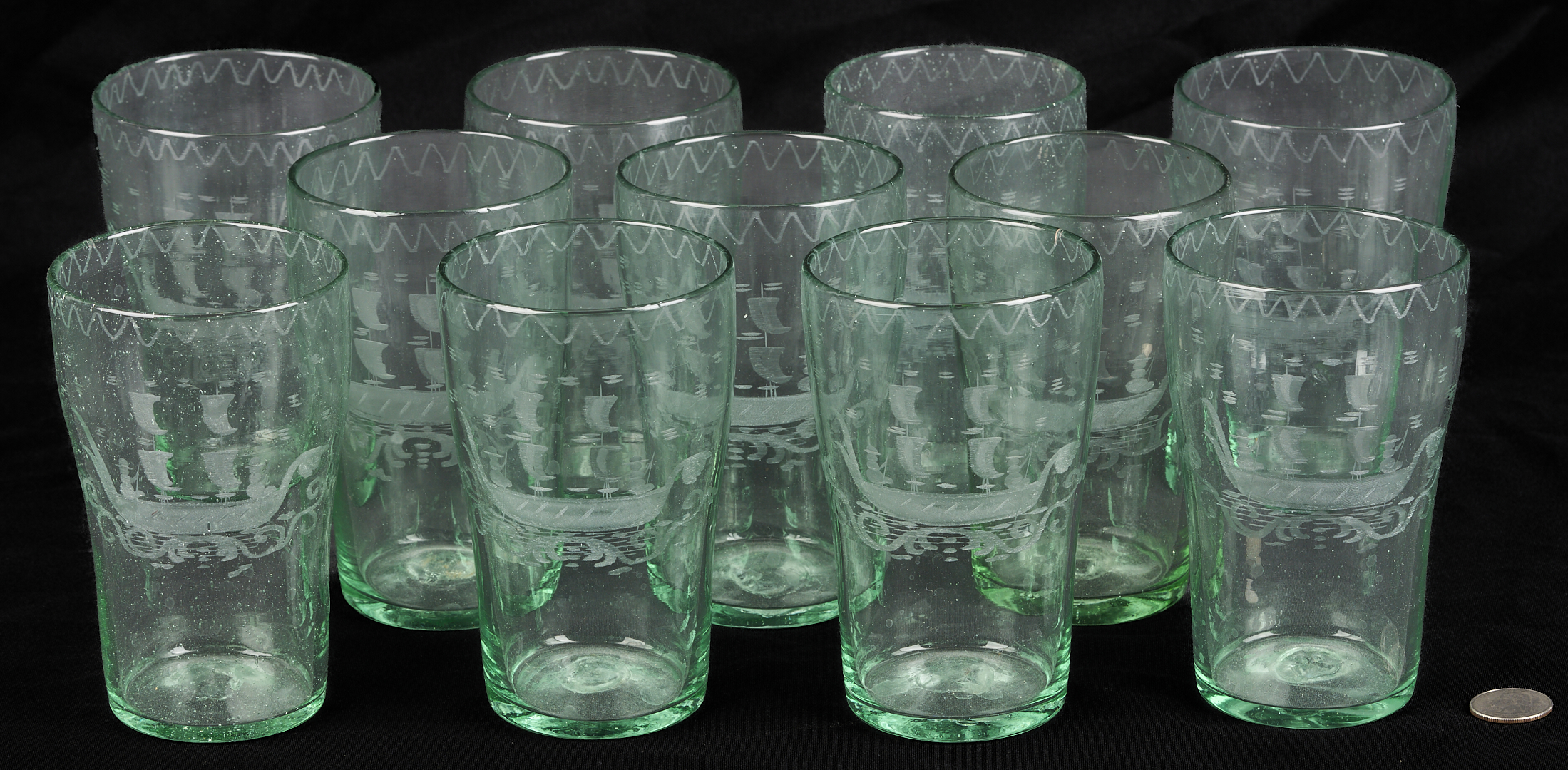 Set of eleven (11) Stiegal-type blown green flip glass tumblers with etched masted ship with two figures to the bodies and wave etched glass decoration to the rims and unpolished pontils on the bases. 5 1/2 in. H x 3 1/4 in. dia. 19th century or earlier.