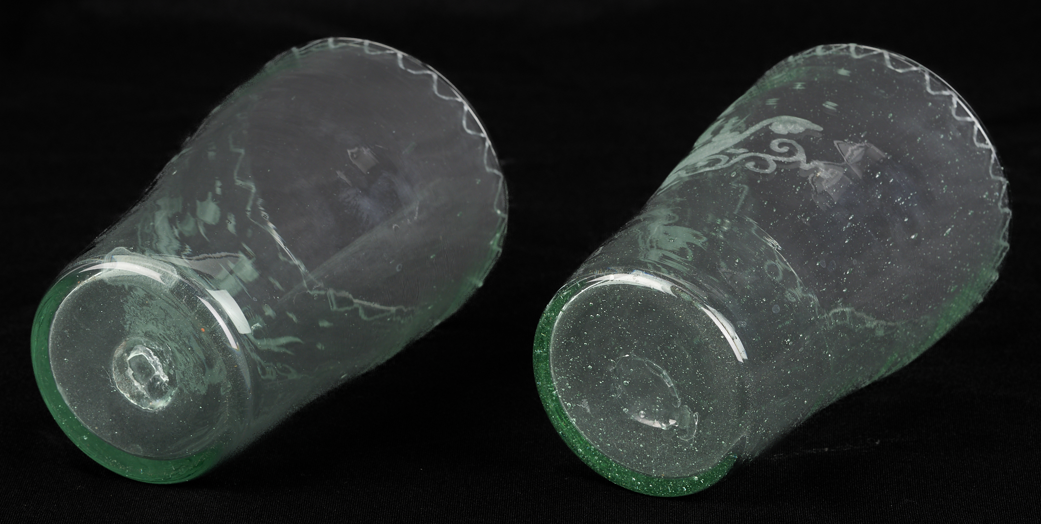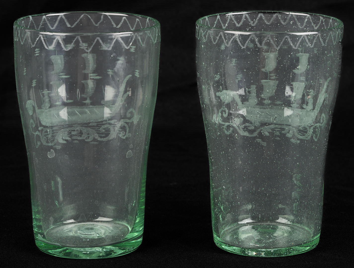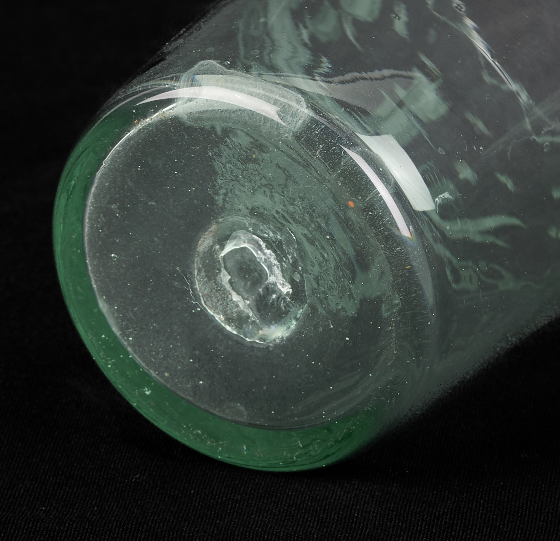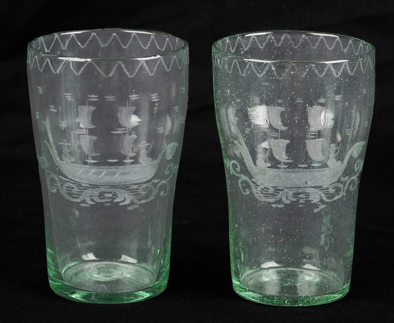Set of eleven (11) Stiegal-type blown green flip glass tumblers with etched masted ship with two figures to the bodies and wave etched glass decoration to the rims and unpolished pontils on the bases. 5 1/2 in. H x 3 1/4 in. dia. 19th century or earlier.