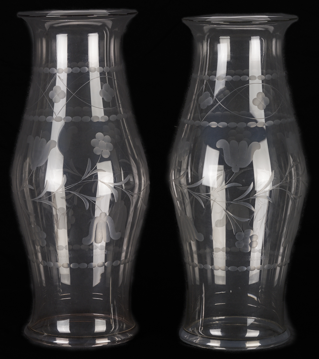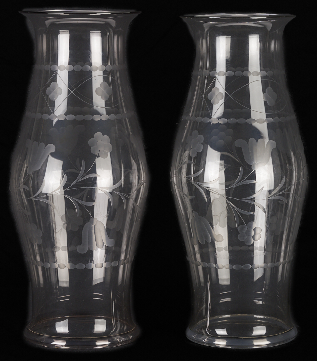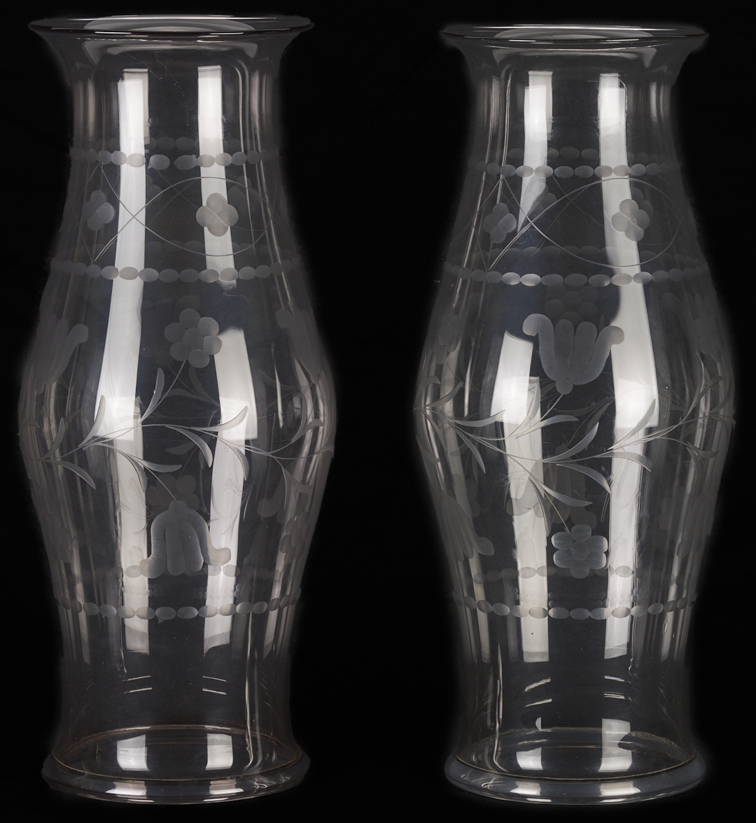 A Pair of tall blown and etched glass hurricane shades with floral and bead course decoration, flared rims and bulbous mid sections. 23 inches H. 19th century.