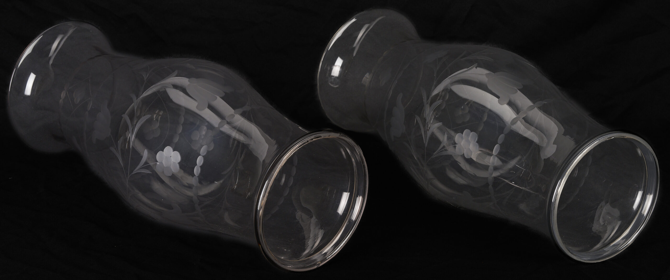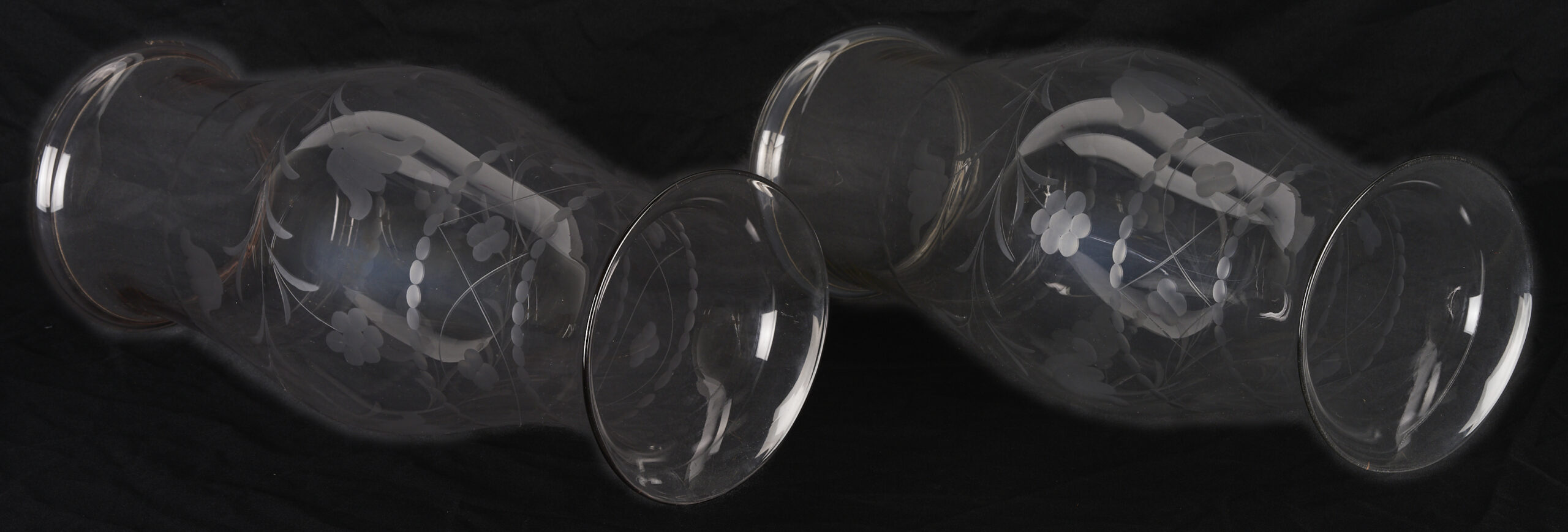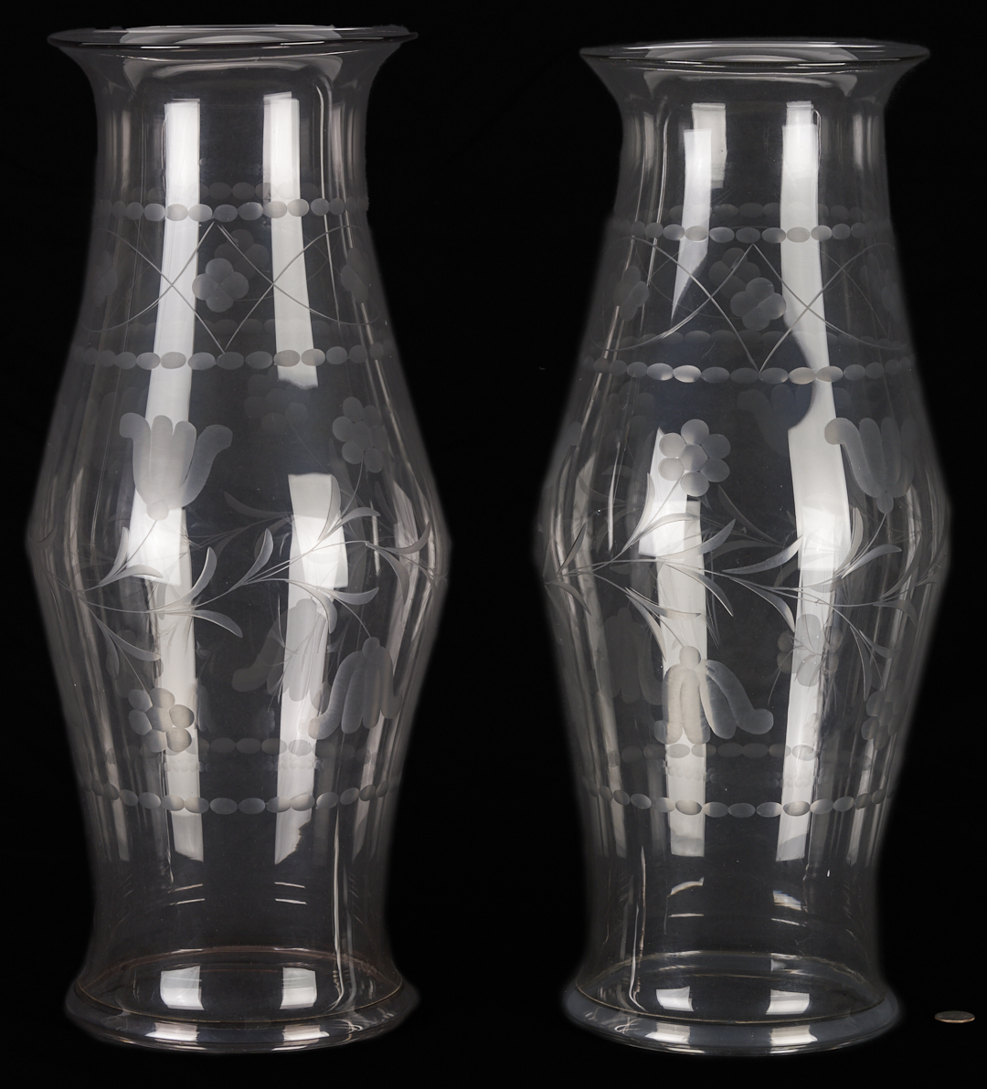 A Pair of tall blown and etched glass hurricane shades with floral and bead course decoration, flared rims and bulbous mid sections. 23 inches H. 19th century.
