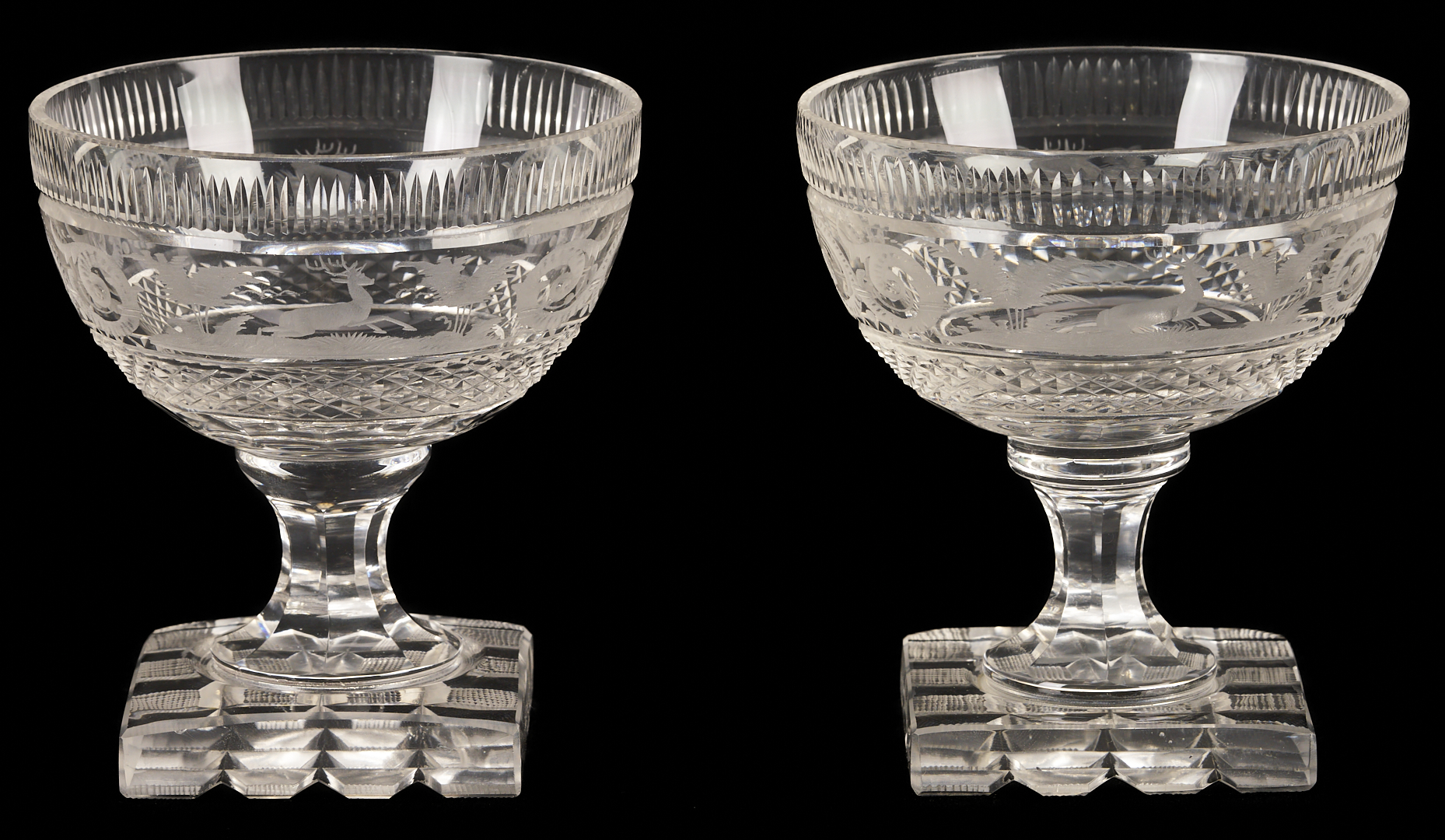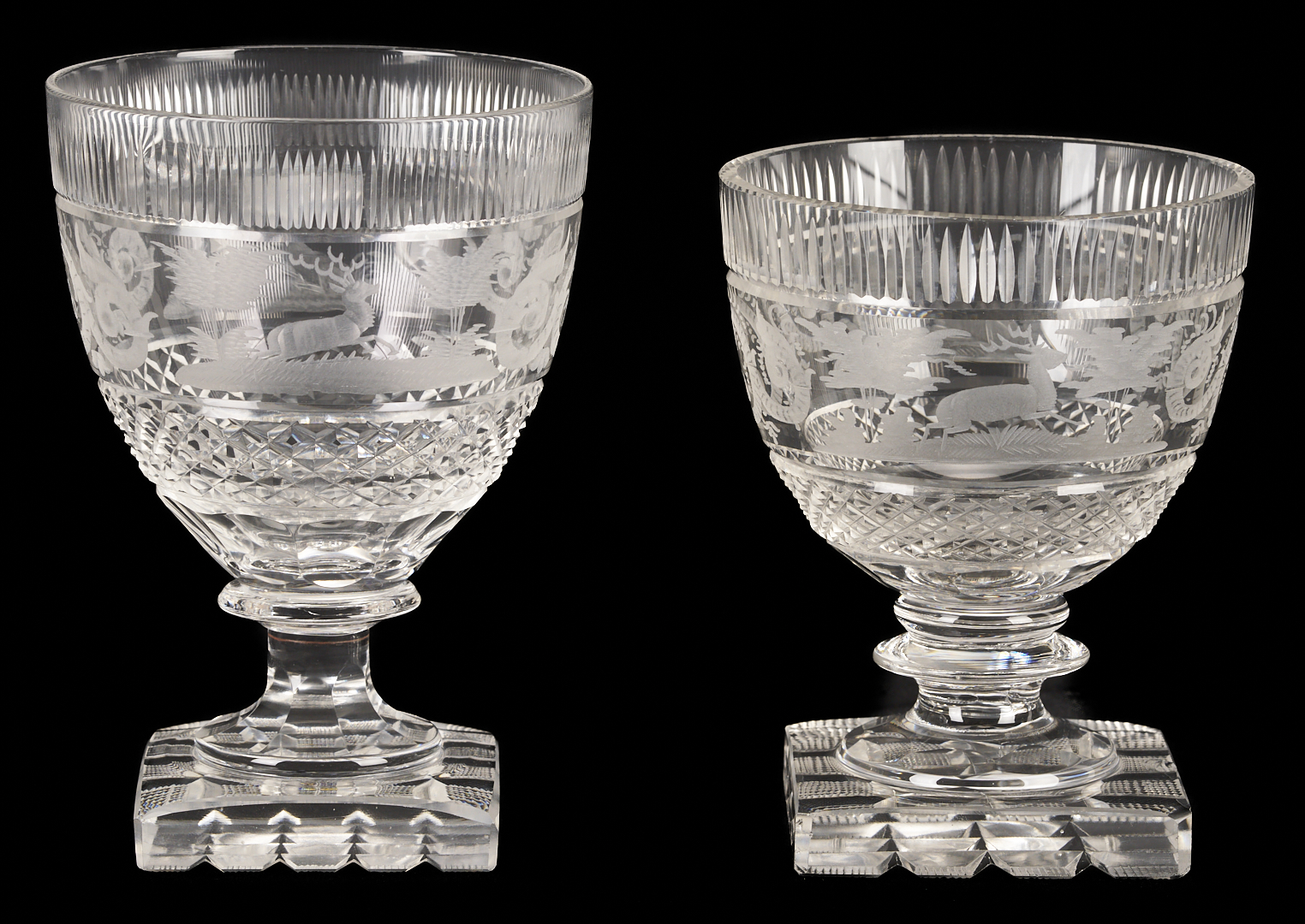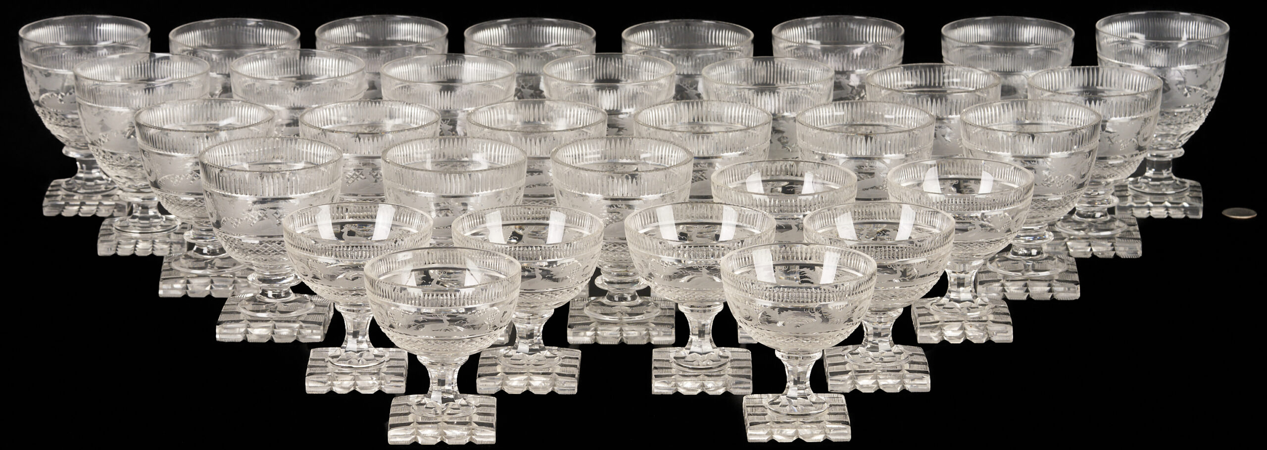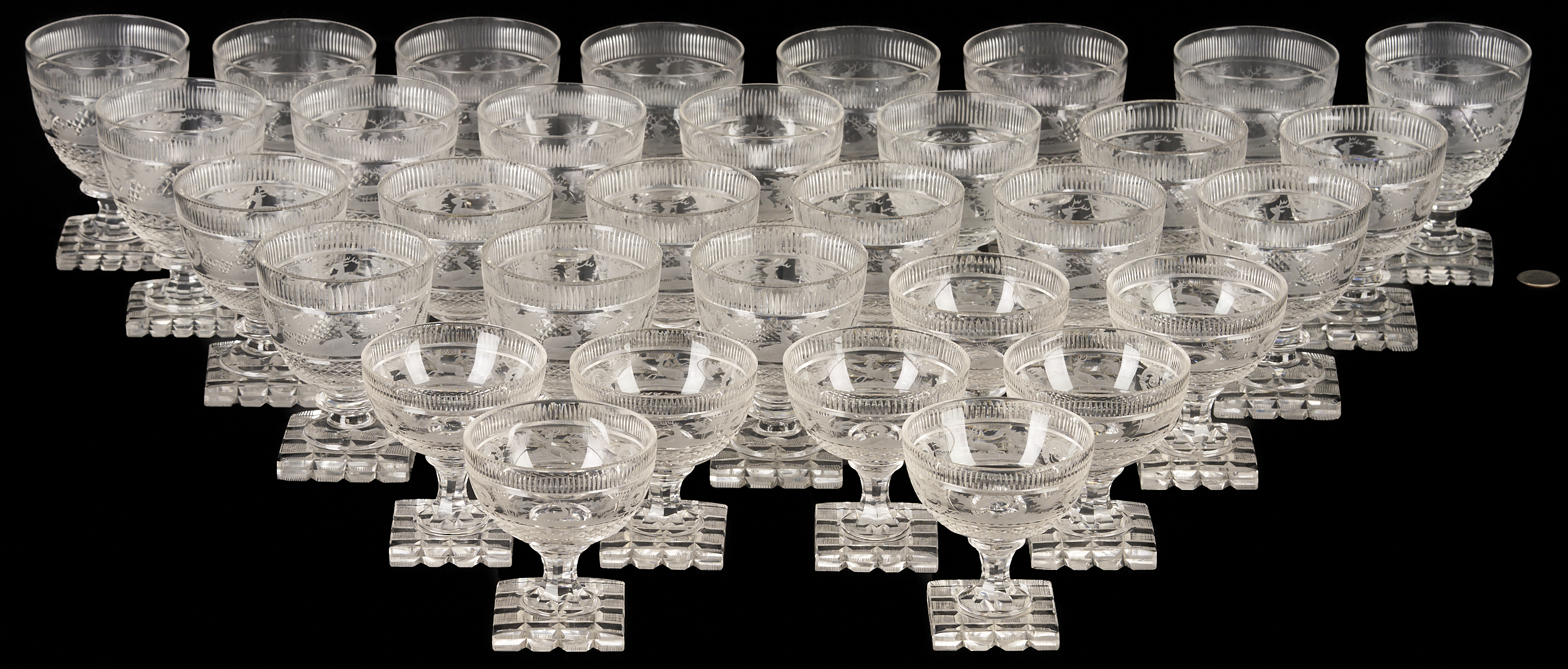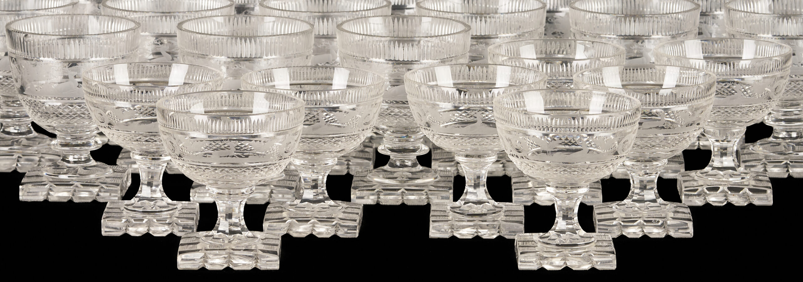 Set of thirty-two (32) Bohemian crystal goblets with etched hunt scenes and cut glass motifs in varying sizes, all resting on cut square bases. Sizes include ten (10) at 5 in., eleven (11) at 4 1/2 in., eight (8) at 4 in., two (2) at 4 3/4 in., and one (1) at 5 1/8 in. 19th century. Note: Lot also includes the bowls of two matching goblets without the stems.