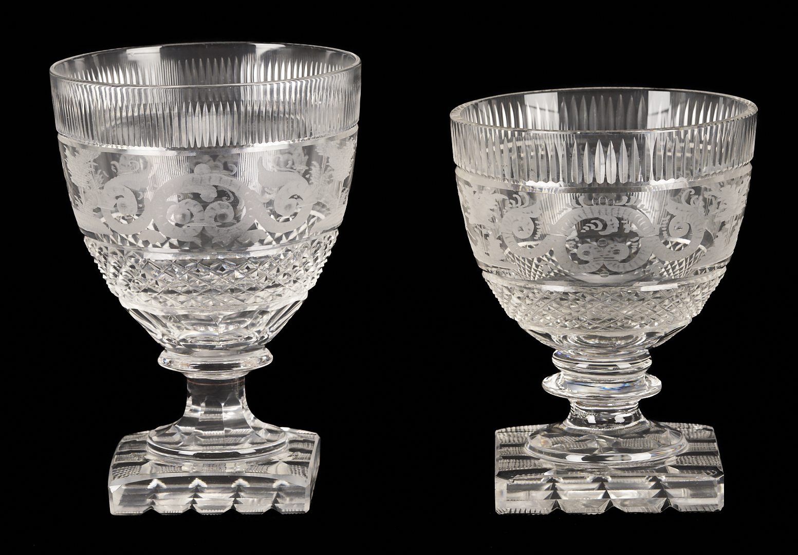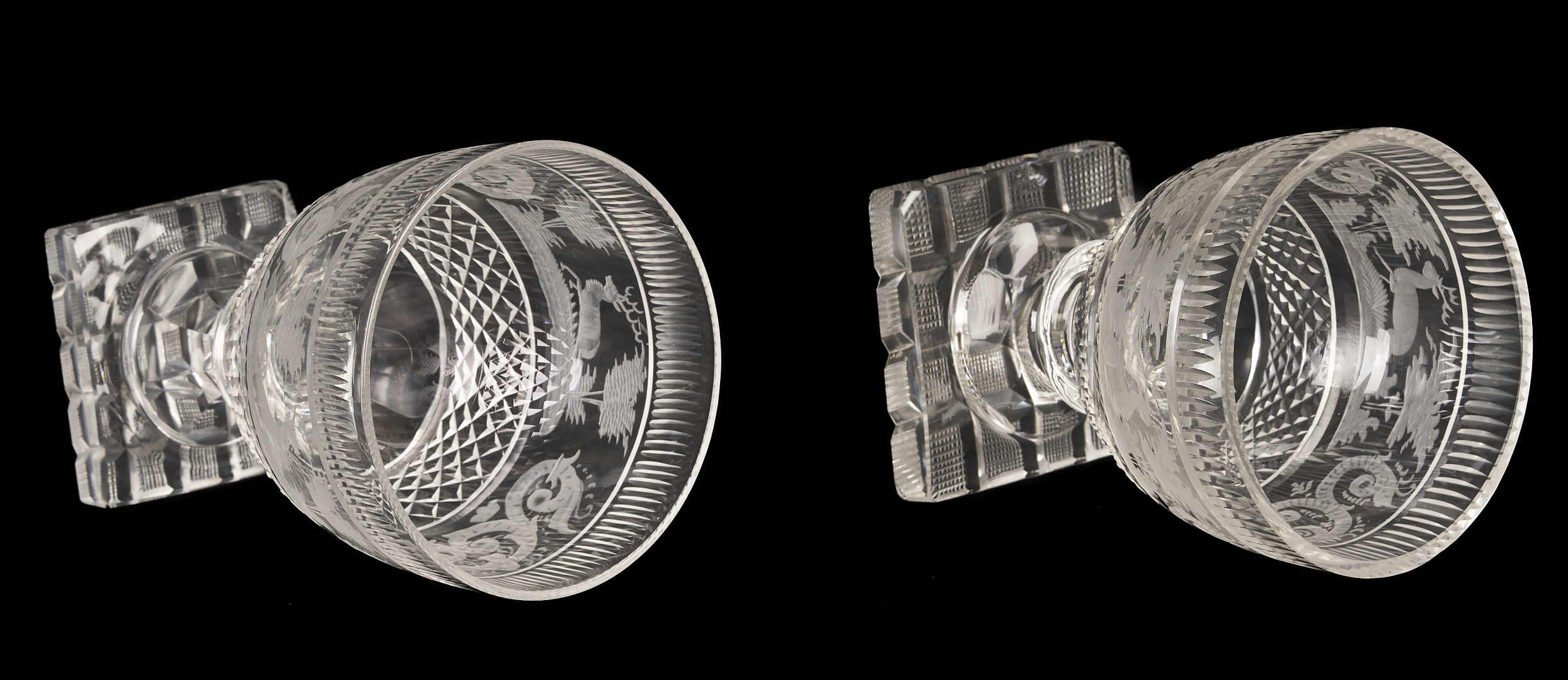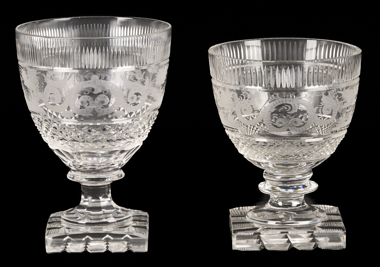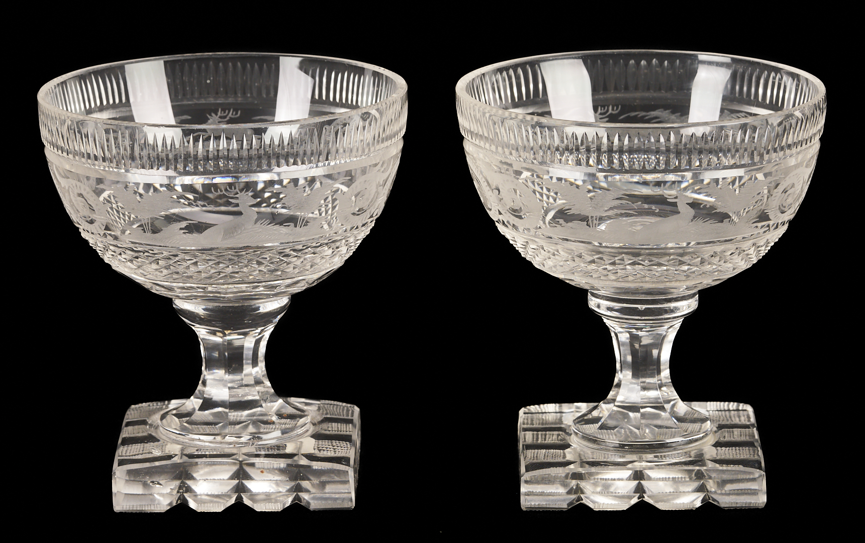 Set of thirty-two (32) Bohemian crystal goblets with etched hunt scenes and cut glass motifs in varying sizes, all resting on cut square bases. Sizes include ten (10) at 5 in., eleven (11) at 4 1/2 in., eight (8) at 4 in., two (2) at 4 3/4 in., and one (1) at 5 1/8 in. 19th century. Note: Lot also includes the bowls of two matching goblets without the stems.