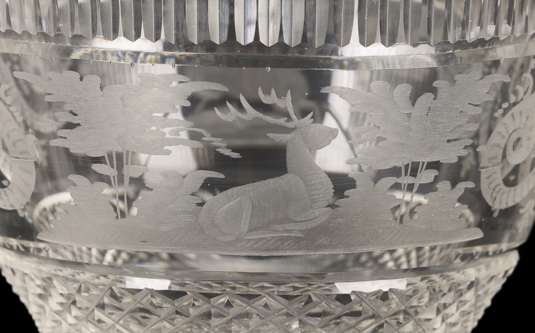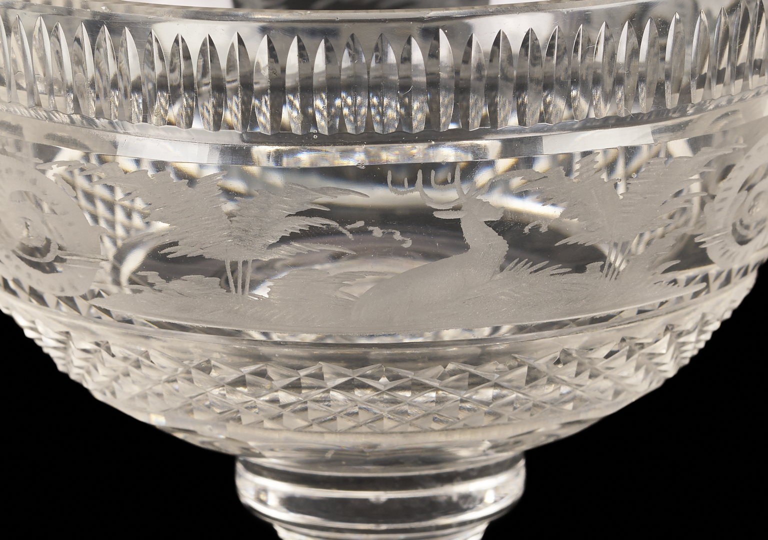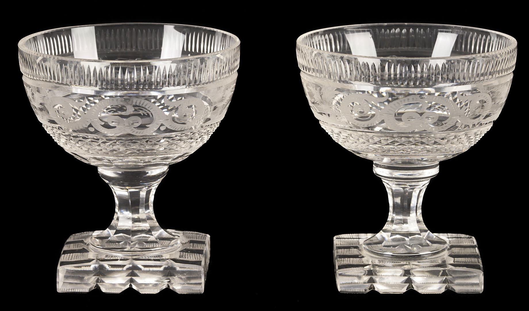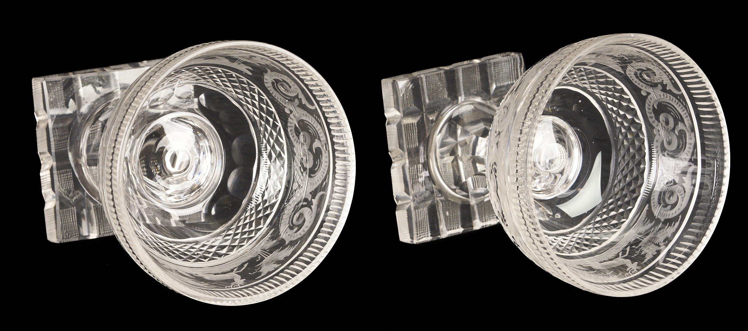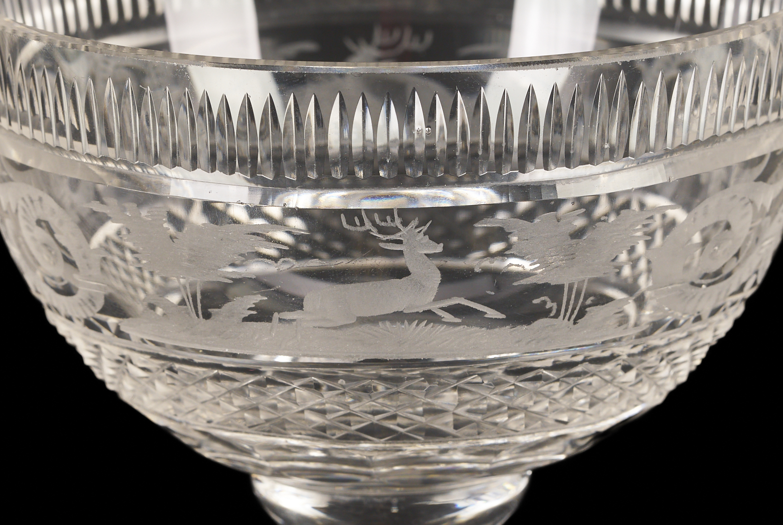 Set of thirty-two (32) Bohemian crystal goblets with etched hunt scenes and cut glass motifs in varying sizes, all resting on cut square bases. Sizes include ten (10) at 5 in., eleven (11) at 4 1/2 in., eight (8) at 4 in., two (2) at 4 3/4 in., and one (1) at 5 1/8 in. 19th century. Note: Lot also includes the bowls of two matching goblets without the stems.