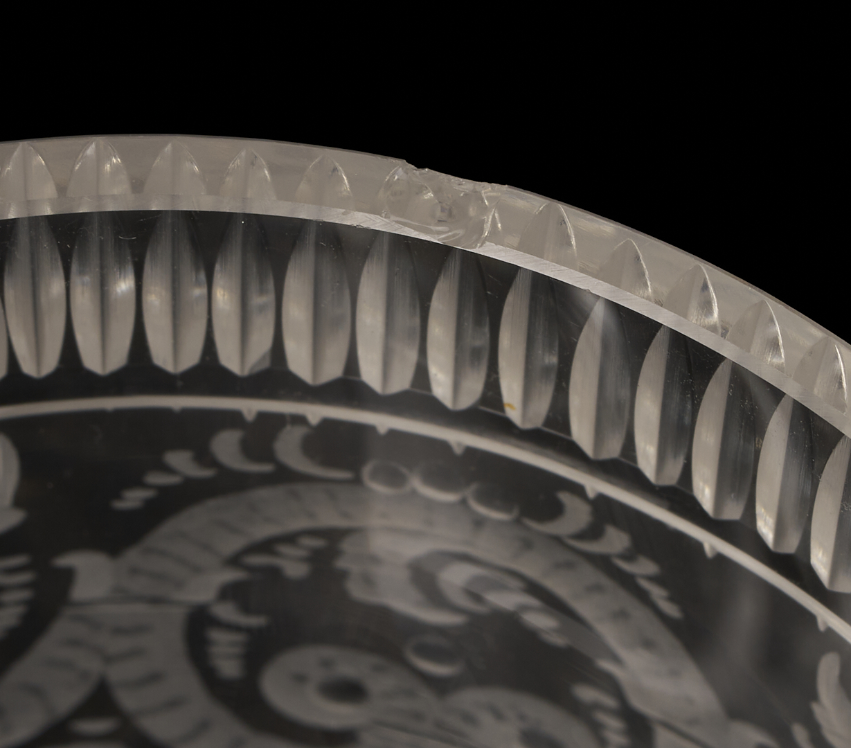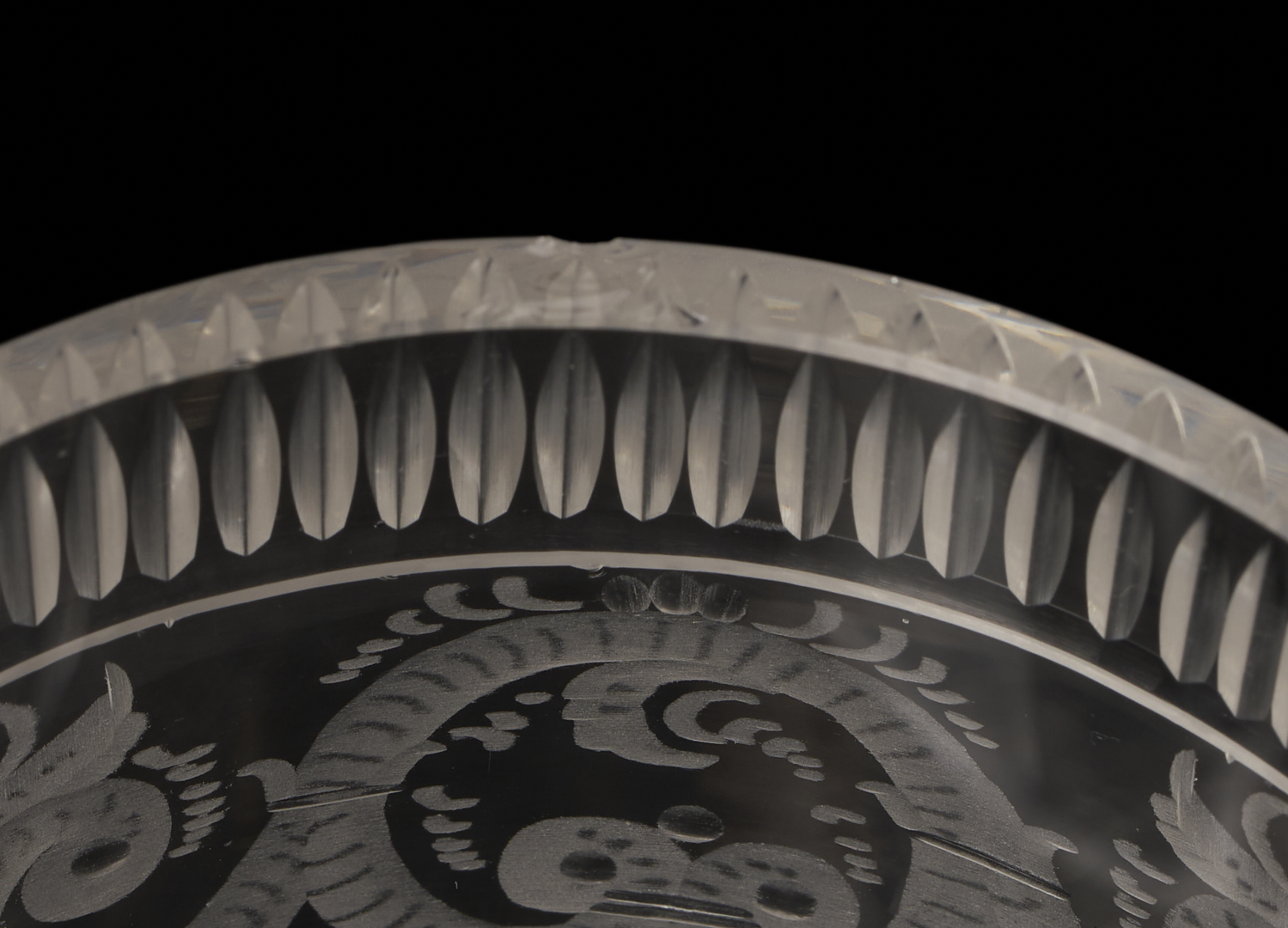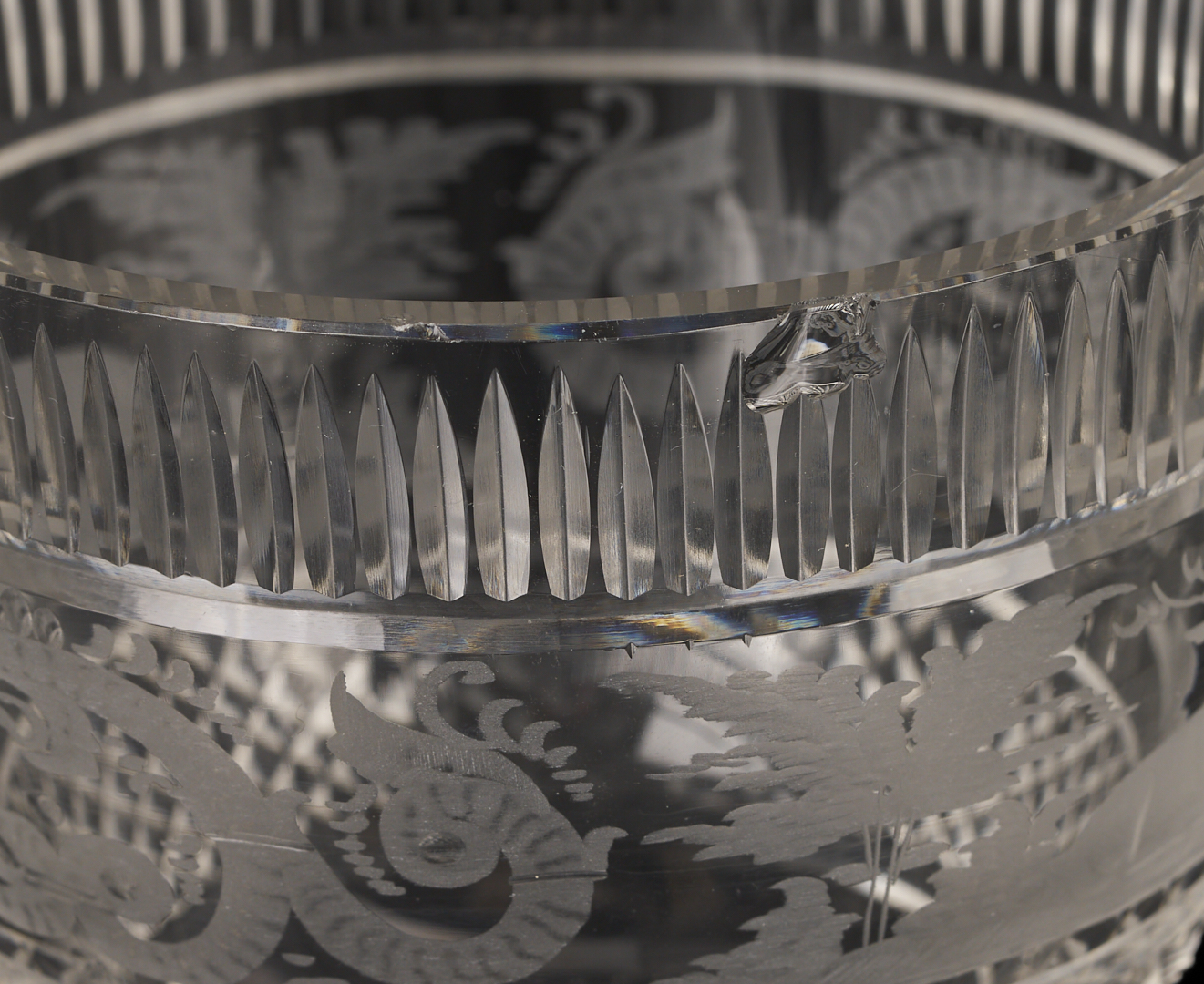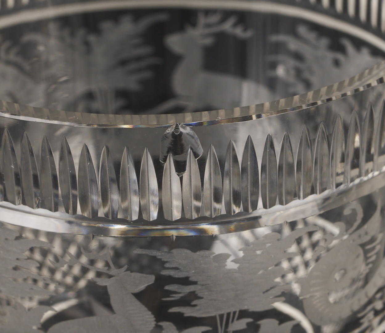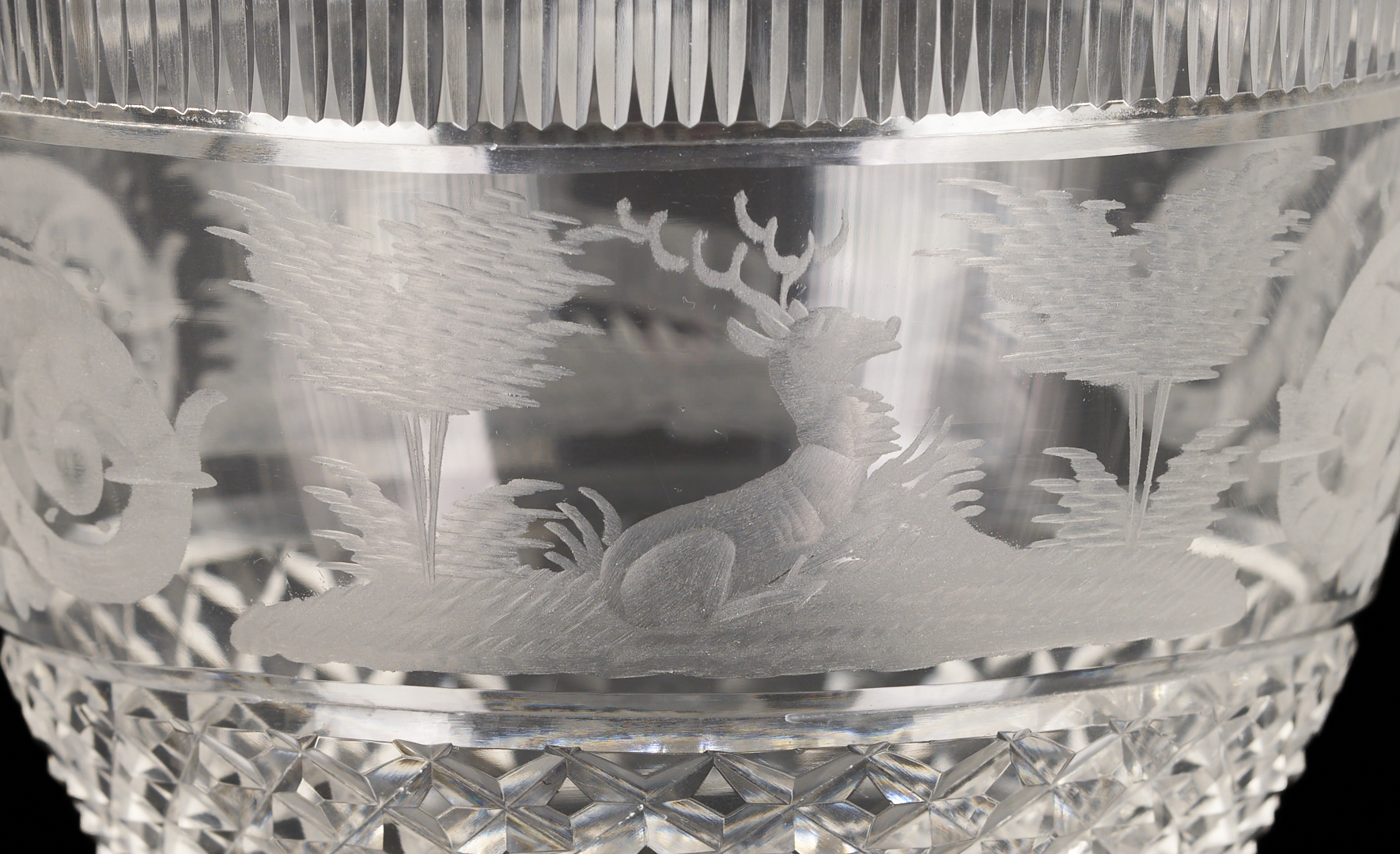 Set of thirty-two (32) Bohemian crystal goblets with etched hunt scenes and cut glass motifs in varying sizes, all resting on cut square bases. Sizes include ten (10) at 5 in., eleven (11) at 4 1/2 in., eight (8) at 4 in., two (2) at 4 3/4 in., and one (1) at 5 1/8 in. 19th century. Note: Lot also includes the bowls of two matching goblets without the stems.