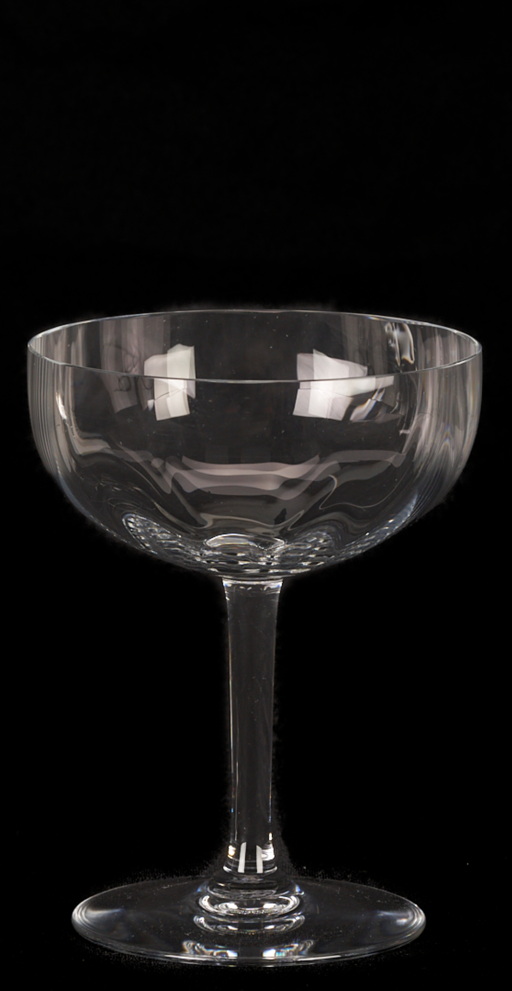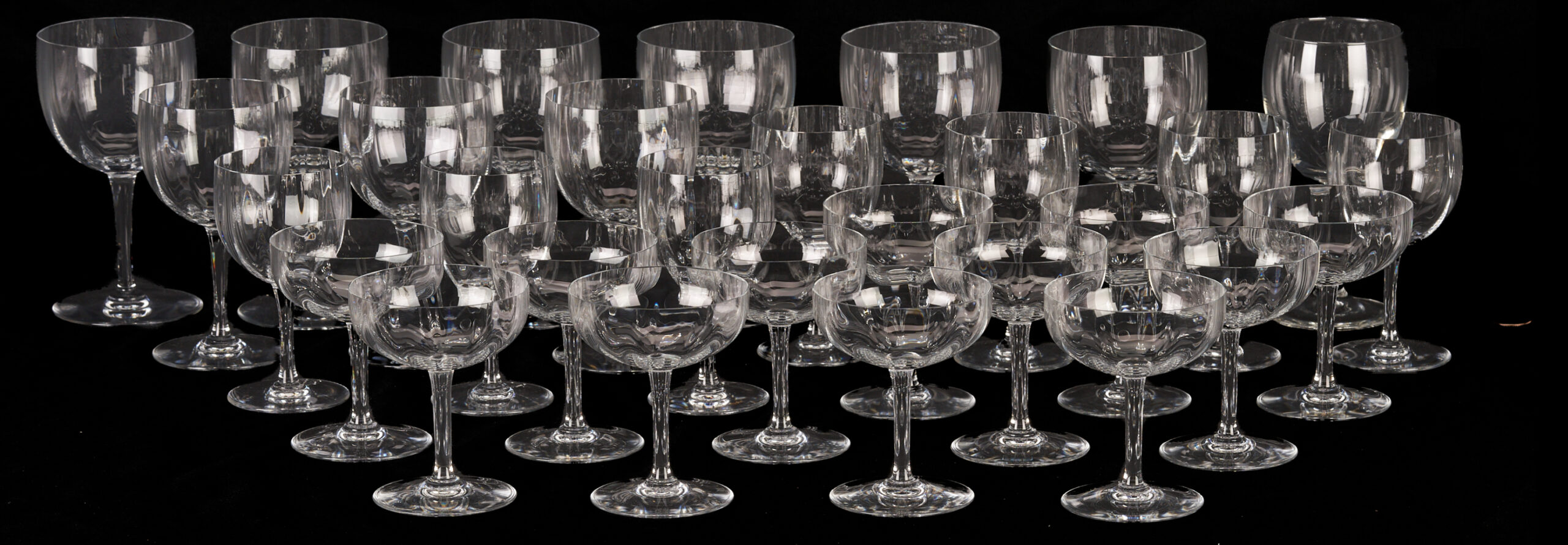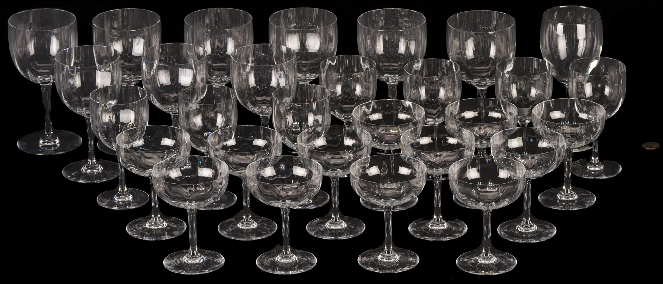 Twenty-nine (29) pieces of Baccarat crystal stemware, Montaigne Optic pattern, including 12 champagne glasses (4 7/8 in. H), 7 claret wine glasses (5 3/4 in. H), 4 water goblets (6 3/8 in. H), and 6 tall water goblets (7 in. H). All with the etched Baccarat mark to the base. 20th century.