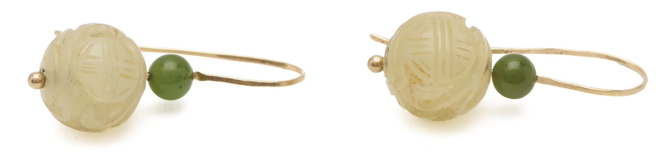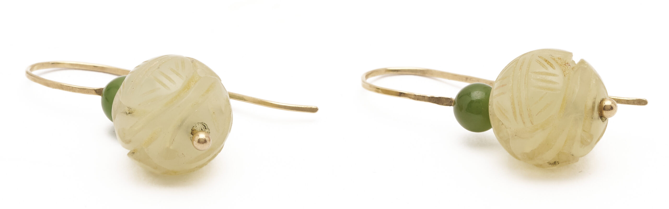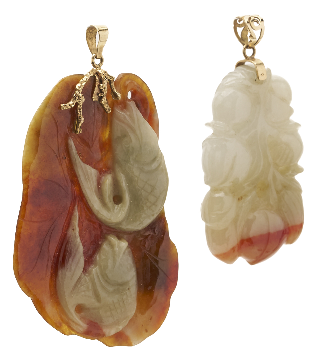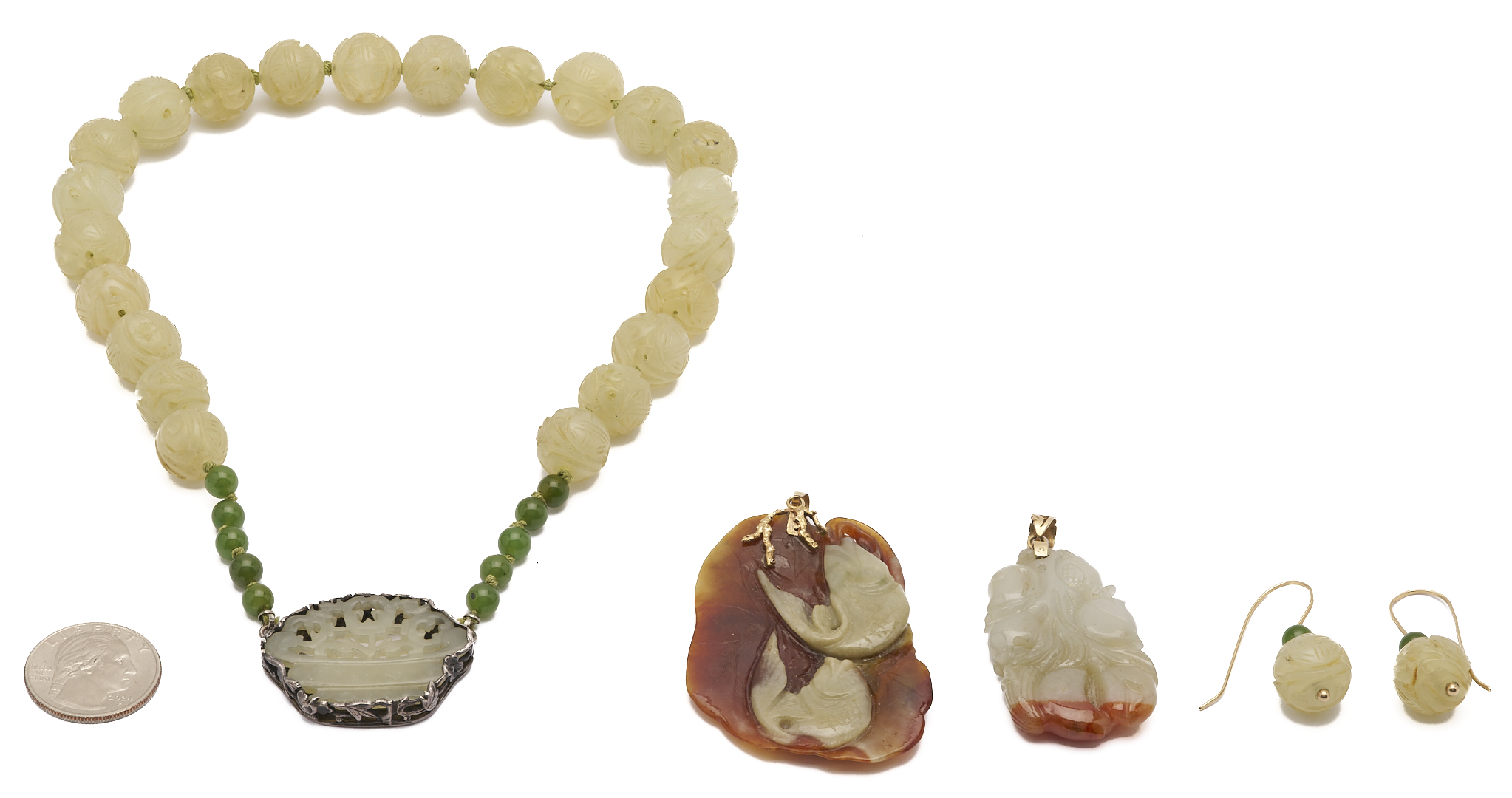 1st item: Ladies necklace featuring twenty-two (22) light yellowish green carved nephrite jade beads approximately 14mm each, ten (10) dark green nephrite jade beads approximately 6mm each, and one sterling silver (XRF tested) wrapped crown shaped carved yellowish green nephrite jade pendant. The necklace is 18 in. long. 2nd item: Carved red, orange, and tan jadeite jade pendant displaying two (2) coy fish. The pendant has a 14K yellow gold bail (marked 14K 585 and XRF tested). The pendant is 2 5/8 in. x 1 1/2 in. 3rd item: Carved white and red floral jadeite jade pendant. The pendant has a 14K yellow gold bail (marked 14K and XRF tested). The pendant is 2 1/4 in. x 1 in. 4th item: Ladies yellow gold plated pierced dangle earring pair featuring two (2) light yellowish green carved nephrite jade beads approximately 14mm each and two (2) dark green nephrite jade beads approximately 6mm each. The earrings are 1 1/4 in. long.