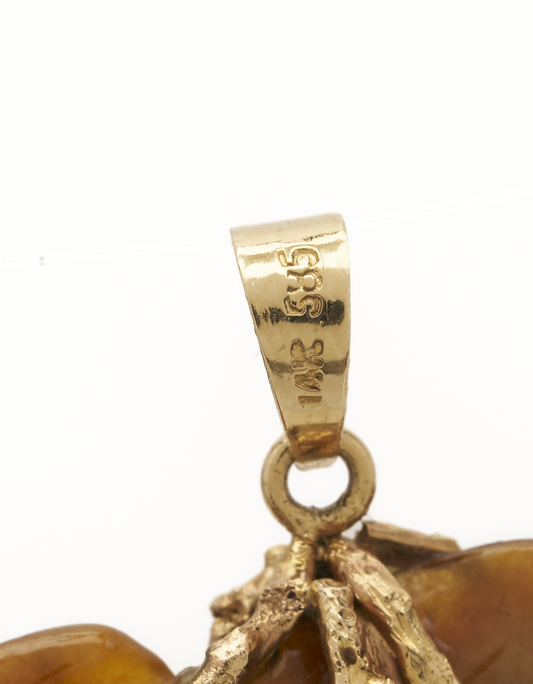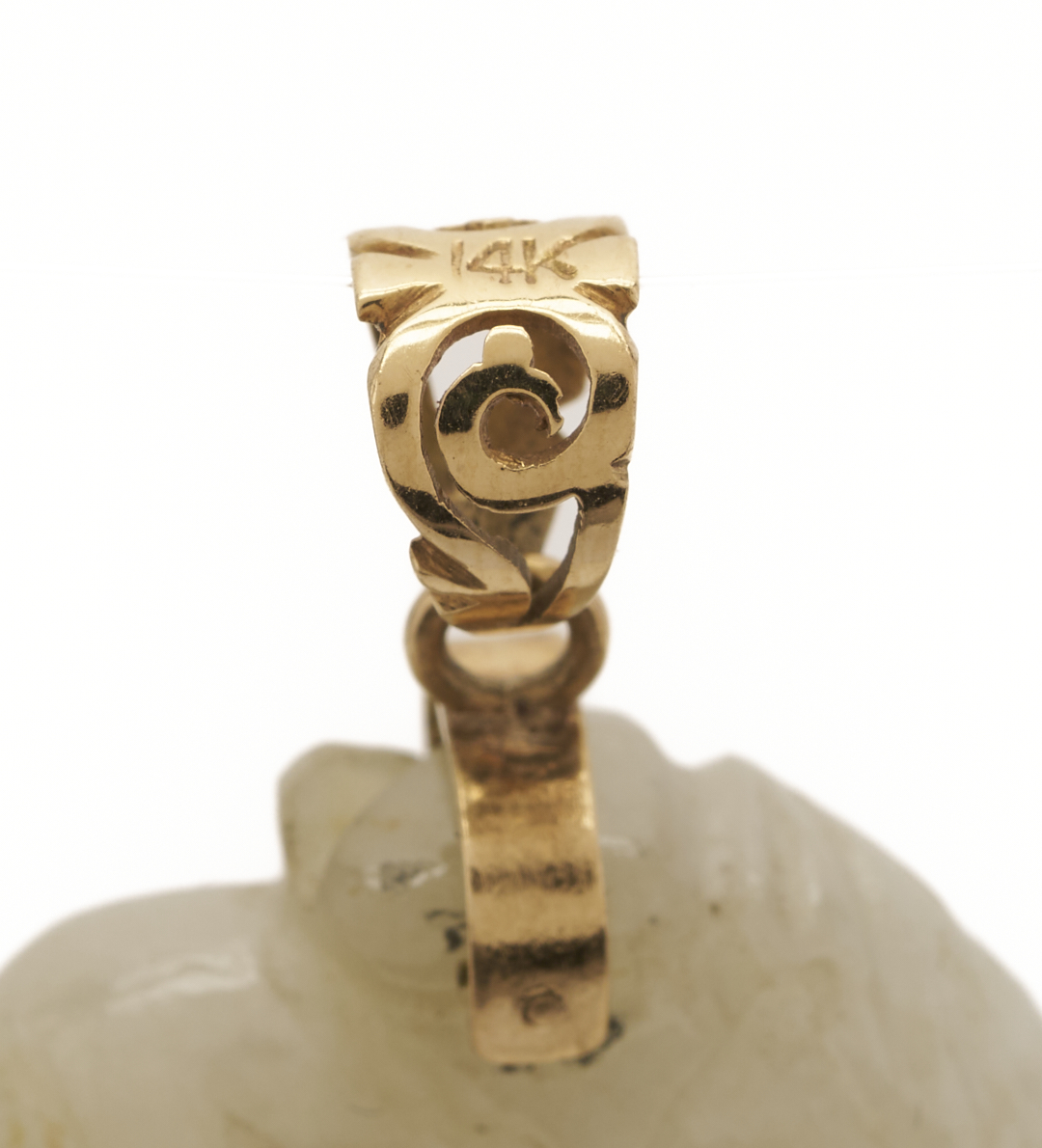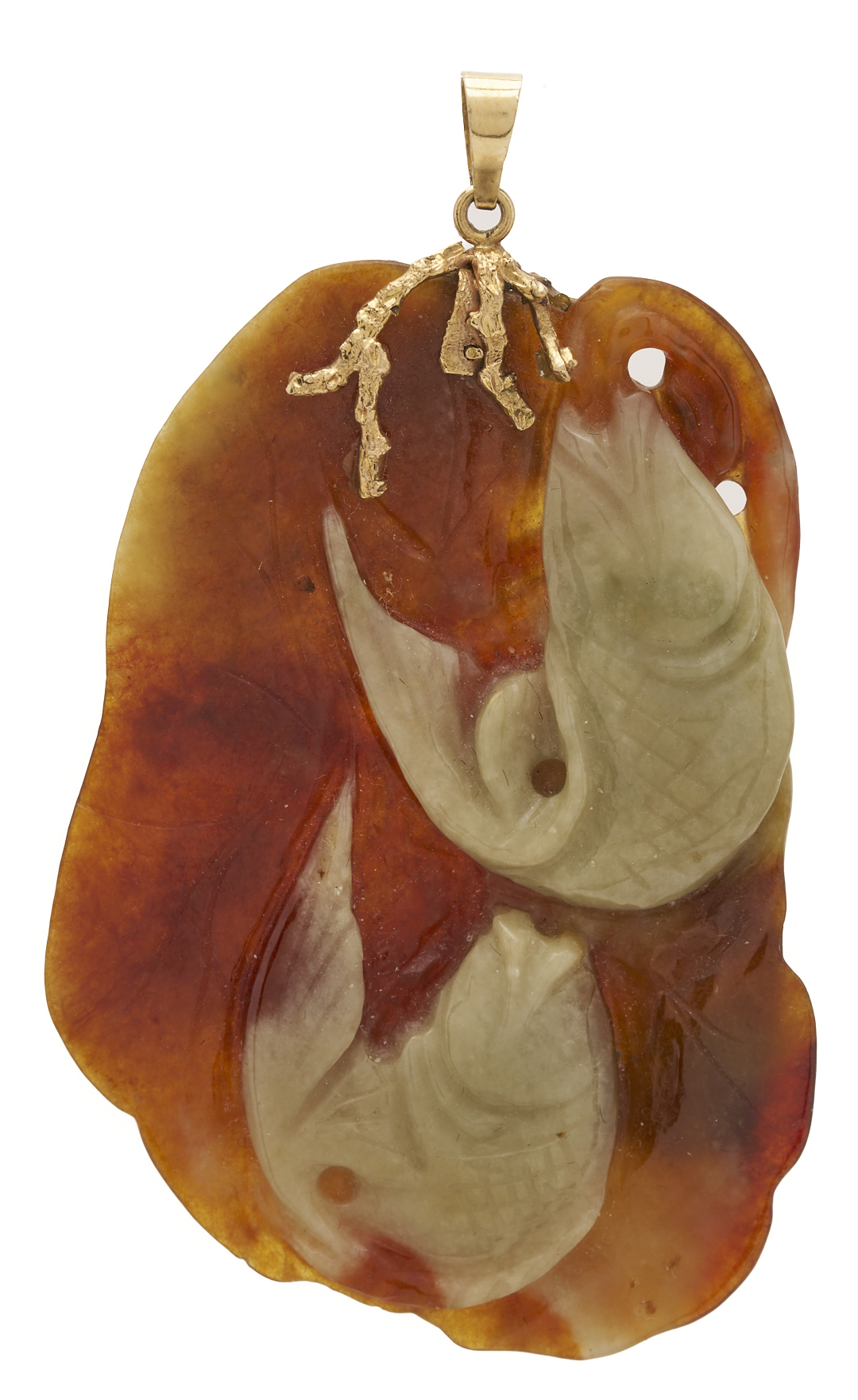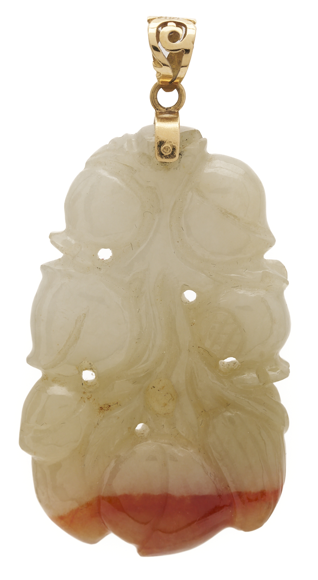1st item: Ladies necklace featuring twenty-two (22) light yellowish green carved nephrite jade beads approximately 14mm each, ten (10) dark green nephrite jade beads approximately 6mm each, and one sterling silver (XRF tested) wrapped crown shaped carved yellowish green nephrite jade pendant. The necklace is 18 in. long. 2nd item: Carved red, orange, and tan jadeite jade pendant displaying two (2) coy fish. The pendant has a 14K yellow gold bail (marked 14K 585 and XRF tested). The pendant is 2 5/8 in. x 1 1/2 in. 3rd item: Carved white and red floral jadeite jade pendant. The pendant has a 14K yellow gold bail (marked 14K and XRF tested). The pendant is 2 1/4 in. x 1 in. 4th item: Ladies yellow gold plated pierced dangle earring pair featuring two (2) light yellowish green carved nephrite jade beads approximately 14mm each and two (2) dark green nephrite jade beads approximately 6mm each. The earrings are 1 1/4 in. long.