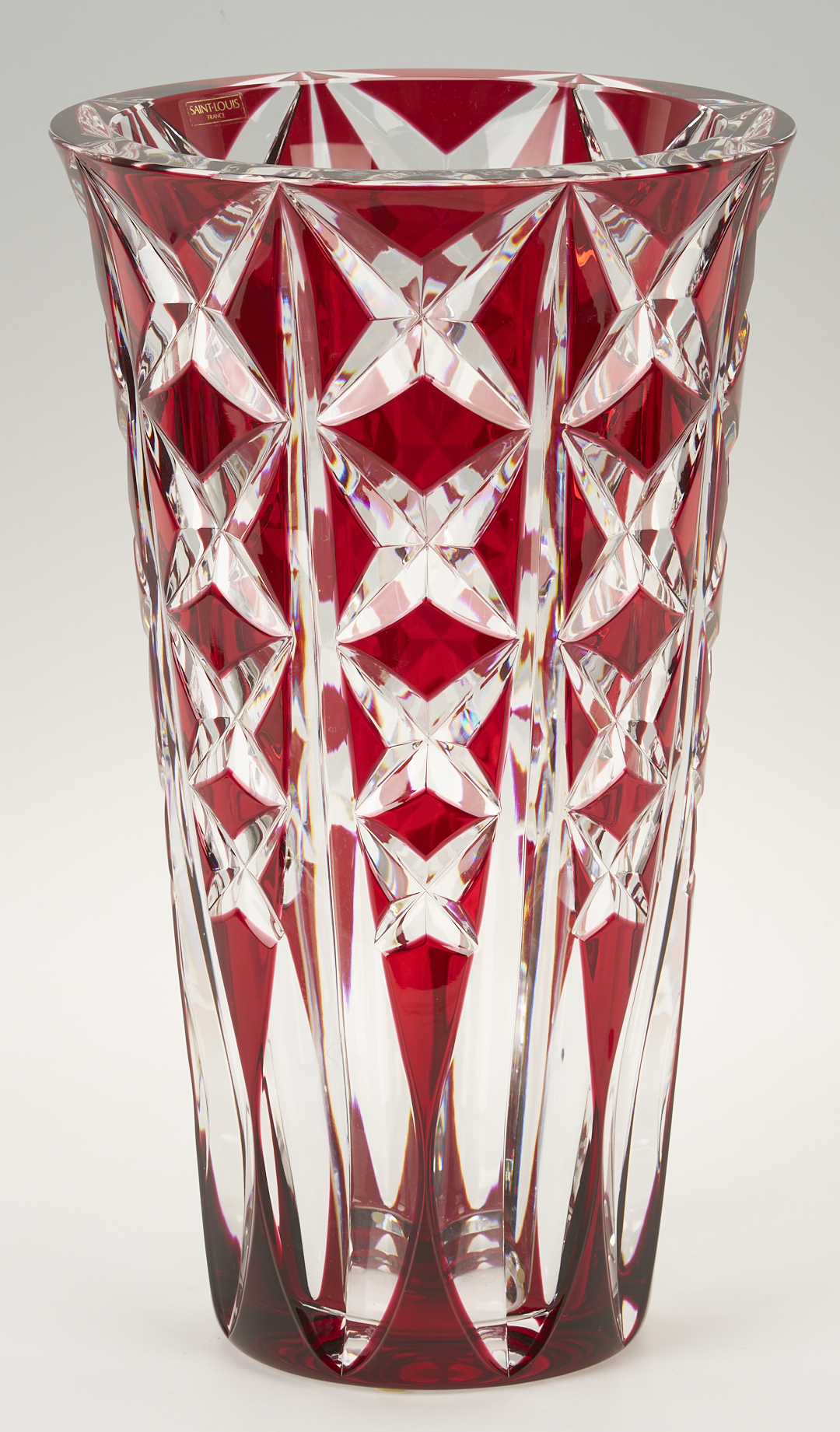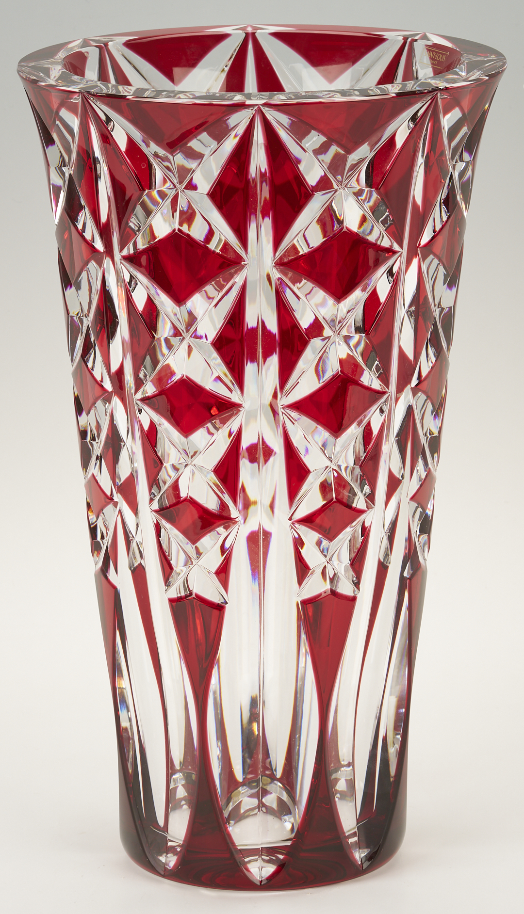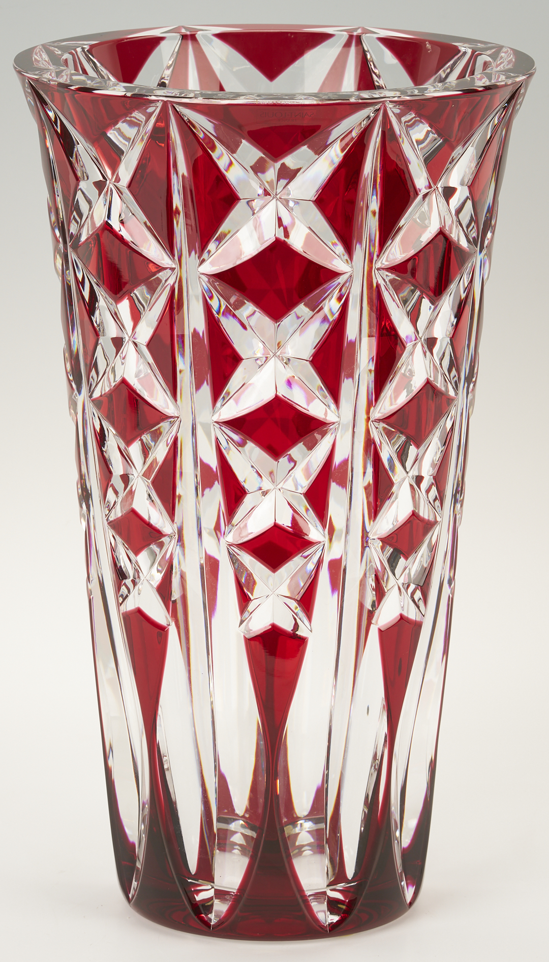 Large St. Louis, France Deauville cut glass crystal vase, ruby overlay cut to clear. Retains the original label and acid-etched stamp on the base. 16 in. H x 9 in. dia. 20th century.