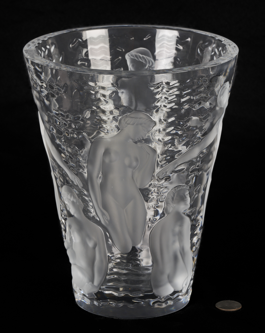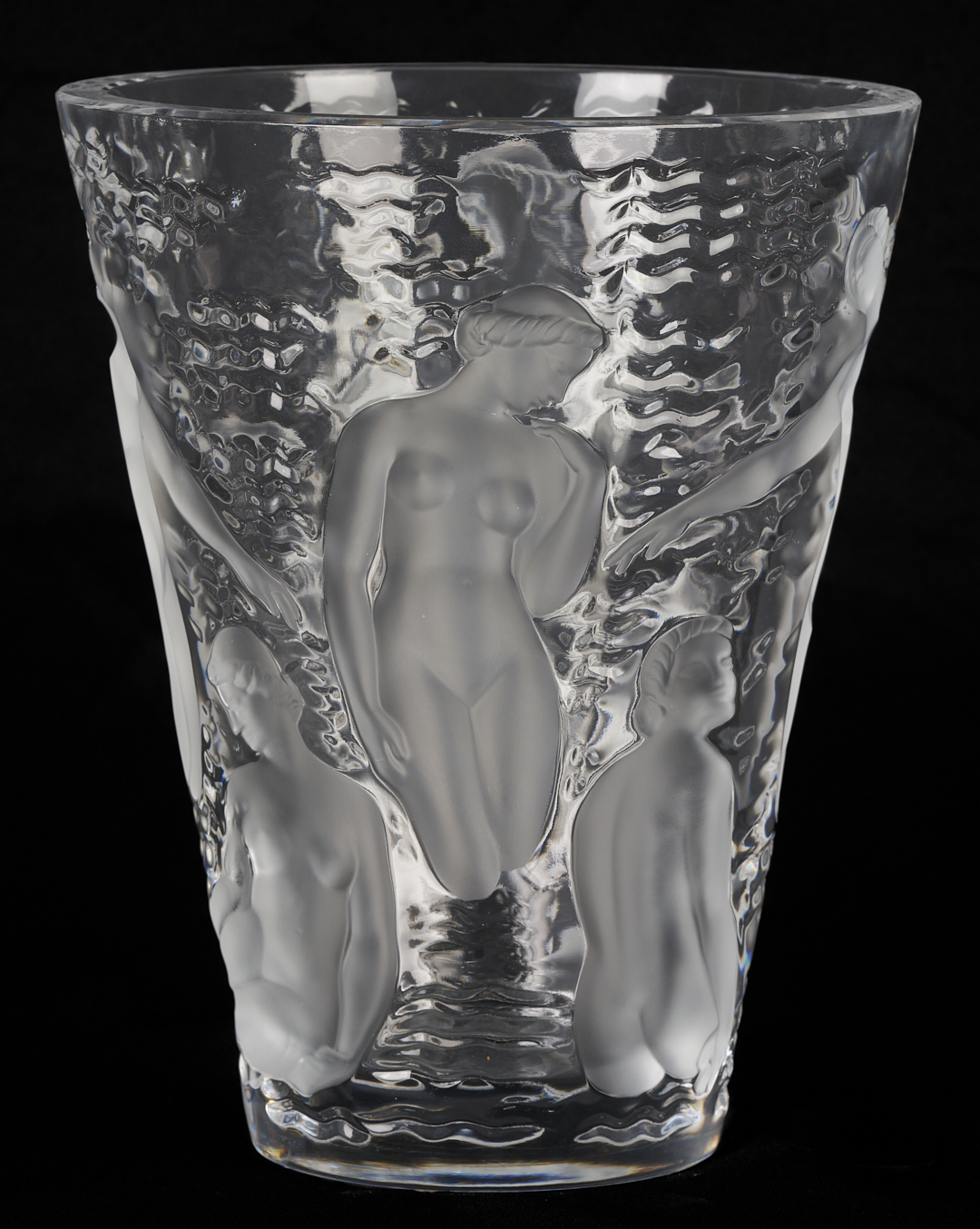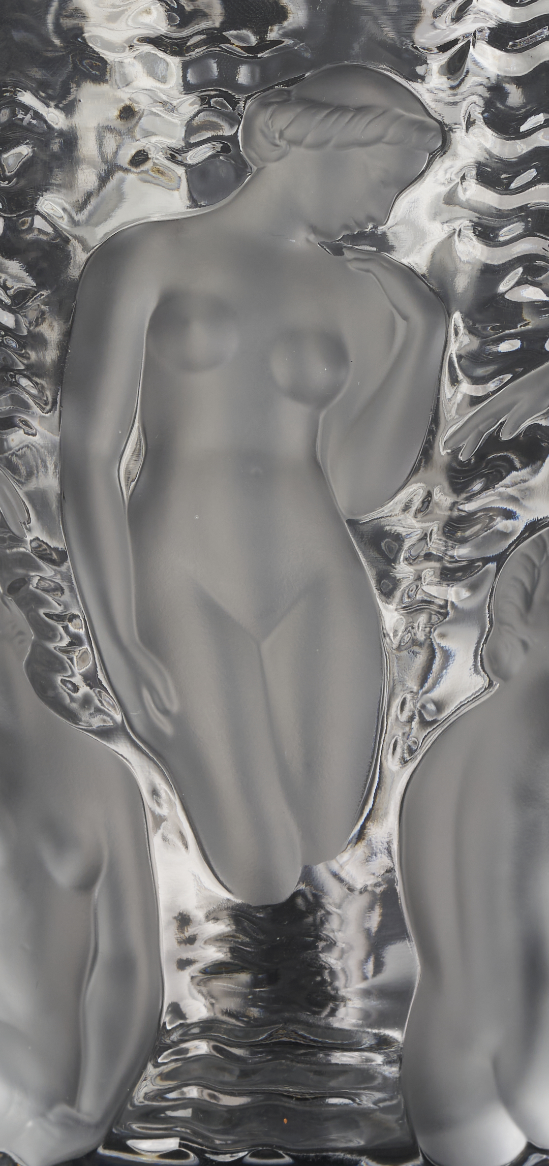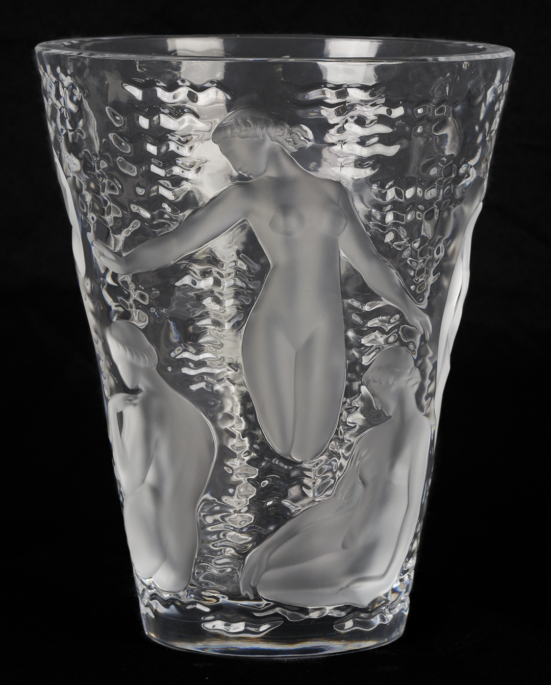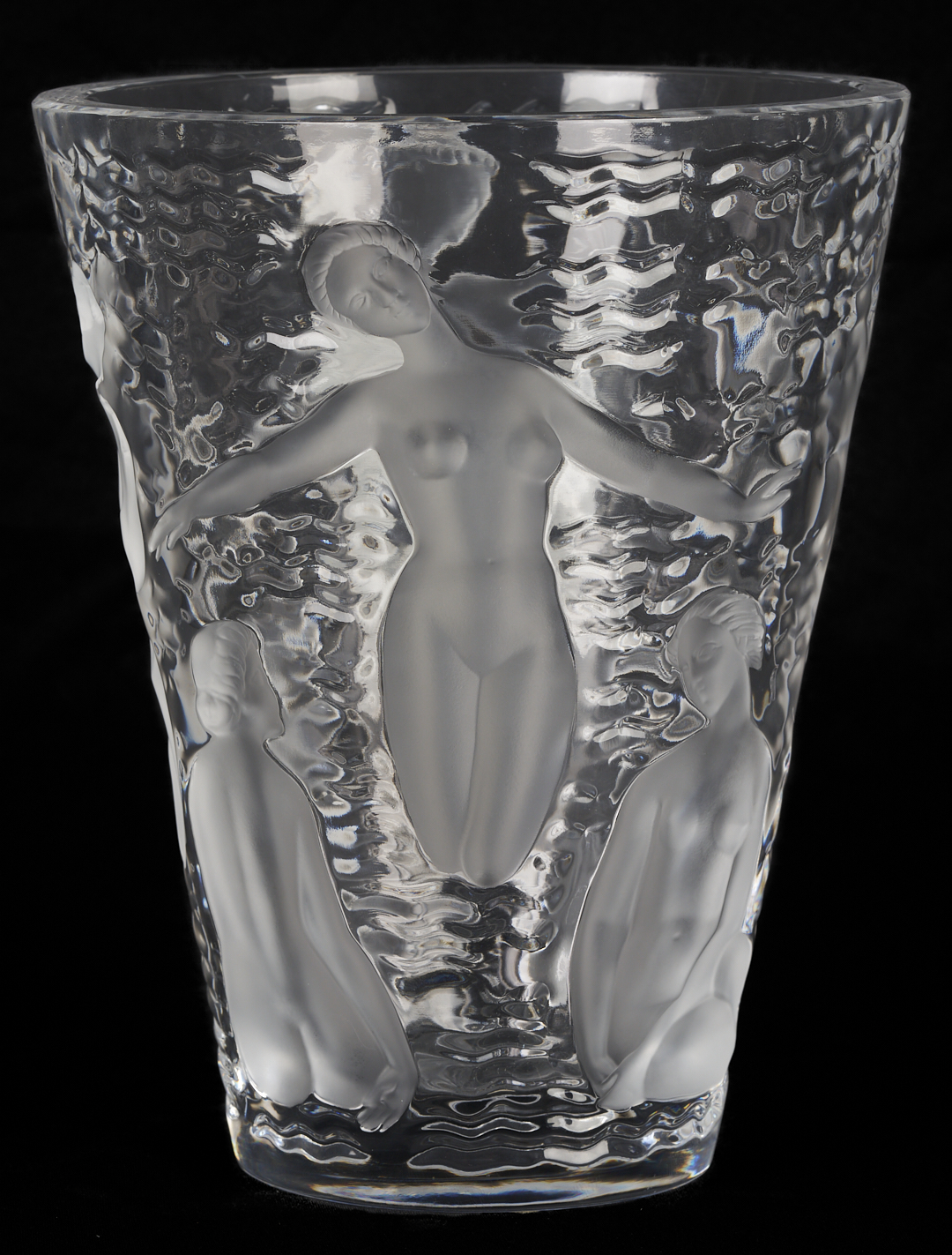 Lalique Ondines crystal glass vase depicting frosted nude figures against a rippling background. Signed “Lalique France” to the underside. 9 1/2 in. H x 7.5 in. D; 9 lbs 5 oz.