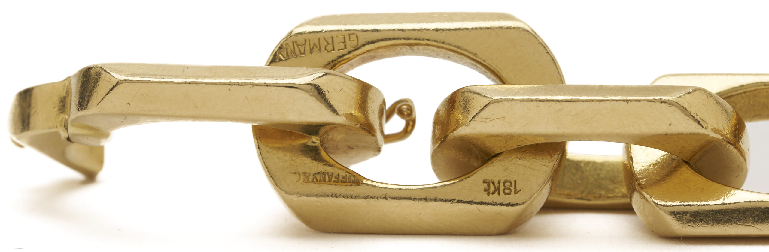 Ladies’ 18K yellow gold large link bracelet by Tiffany and Company. The bracelet is marked “18Kt Tiffany&Co Germany” and XRF tests 18K gold. The bracelet is 7 1/2 in. L. and has a weight of 152.97 grams.