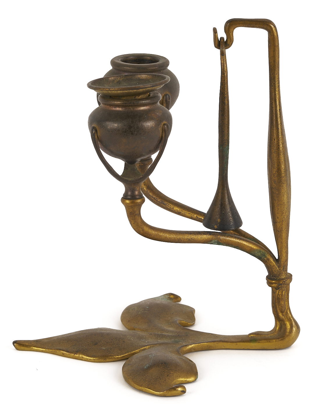 Tiffany Studios bronze Fleur di Lis double holder candlestick with original hanging snuffer. Signed to underside of base, #1232. 8 1/2 in. H x 6 1/2 in. W. x 7 1/2 in. D. Circa 1910.
