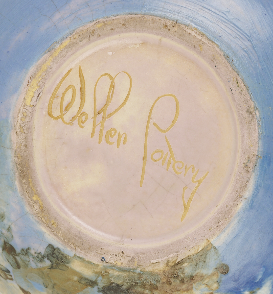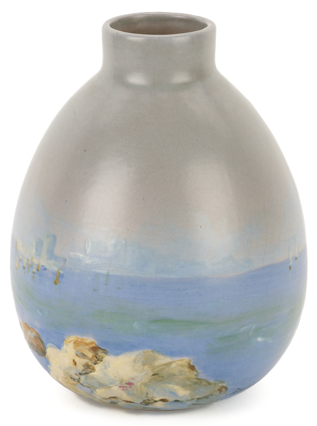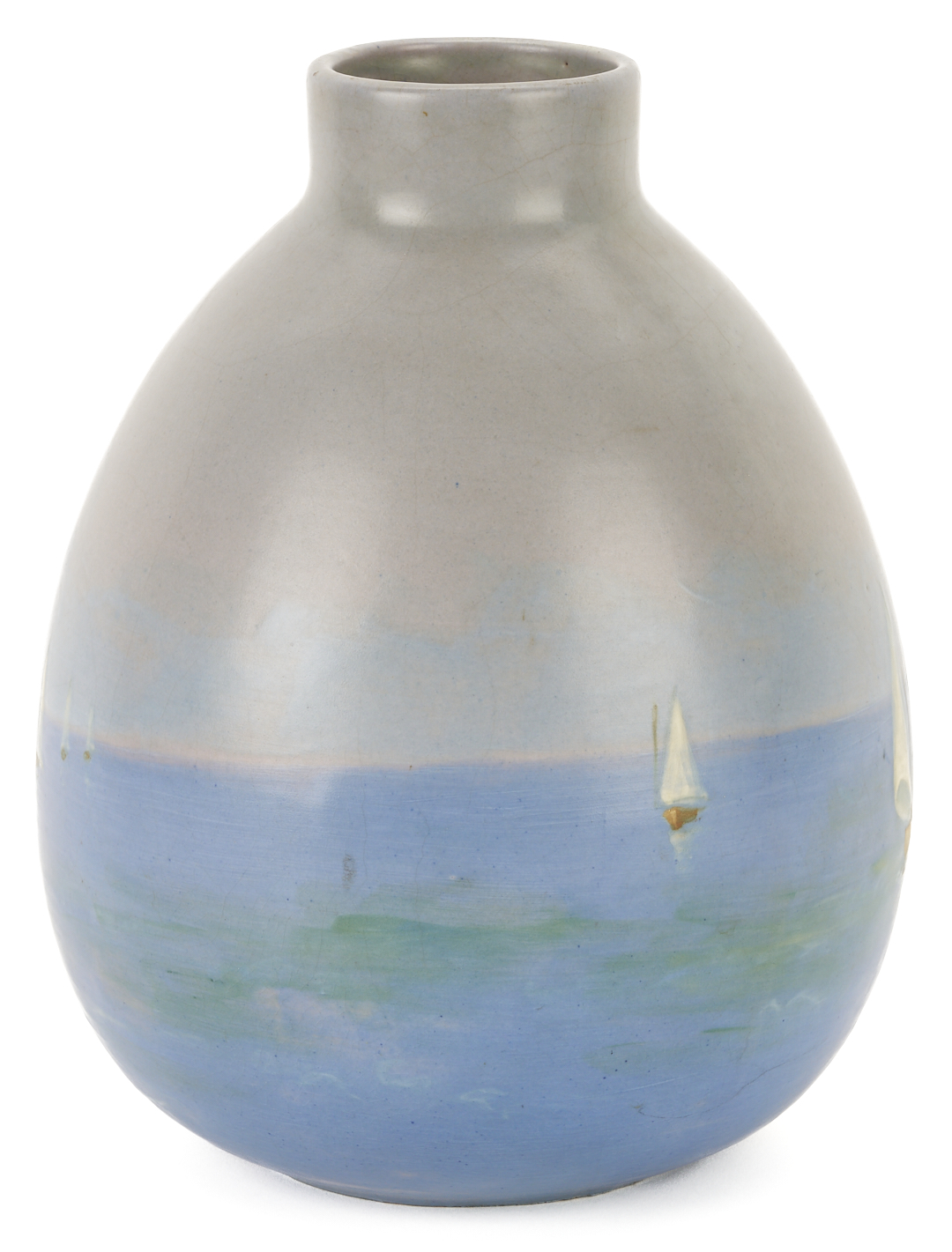 Weller Art Pottery scenic seascape vase decorated with multiple sailing boats, faint structures in the background, and a rocky shoreline, decorated by the artist Sarah Reid McLaughlin (1872-1939). Incised on the base WELLER POTTERY and signed on the lower body MCLAUGHLIN. 10 in. H. Circa 1920s.